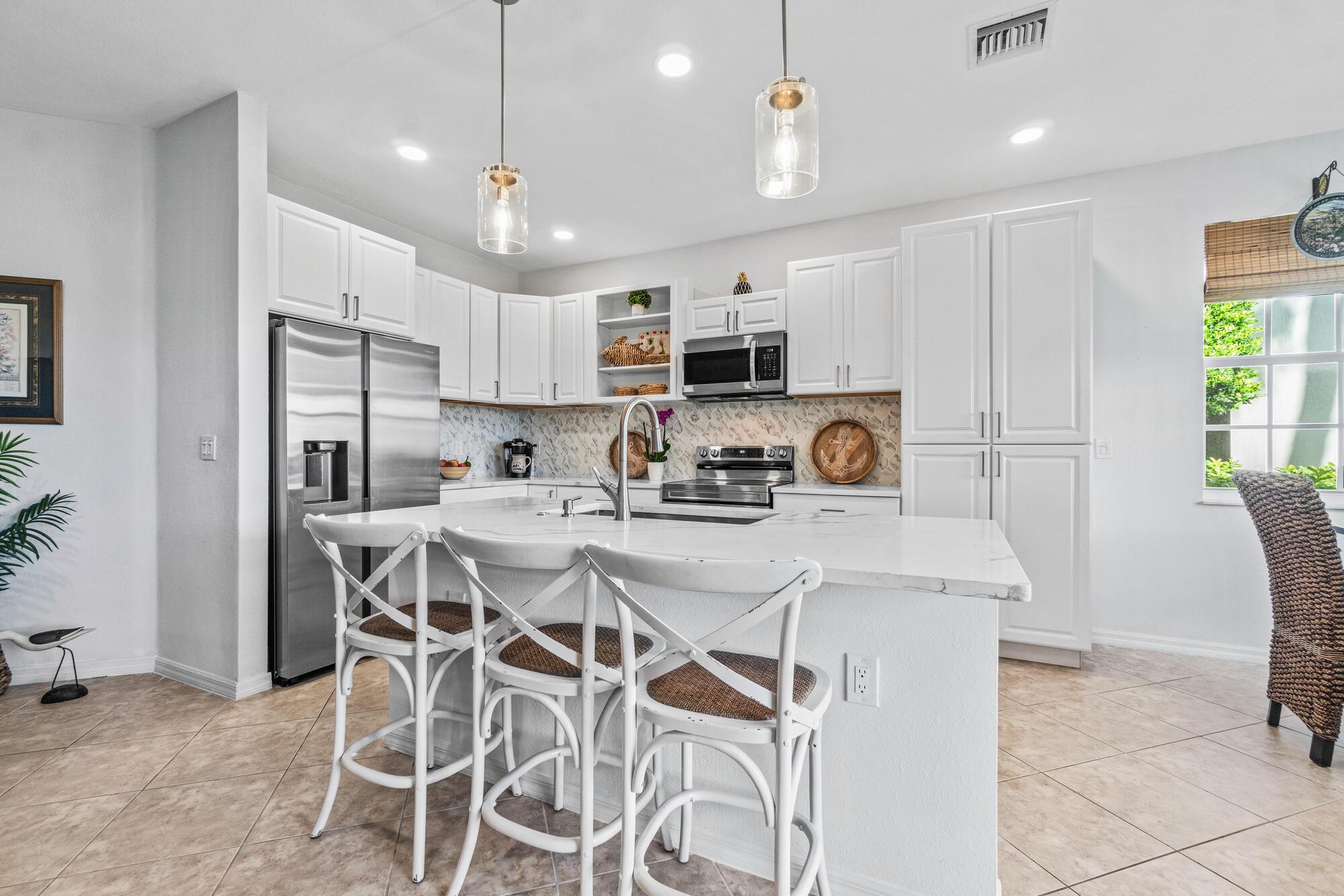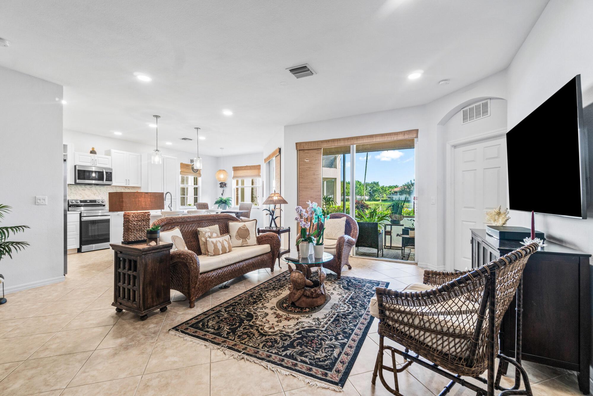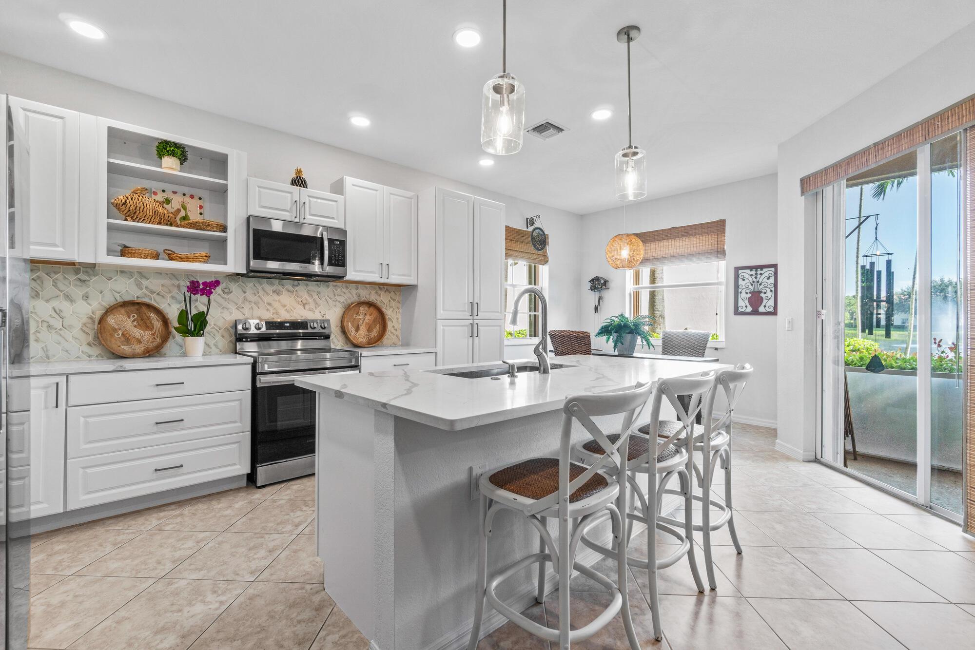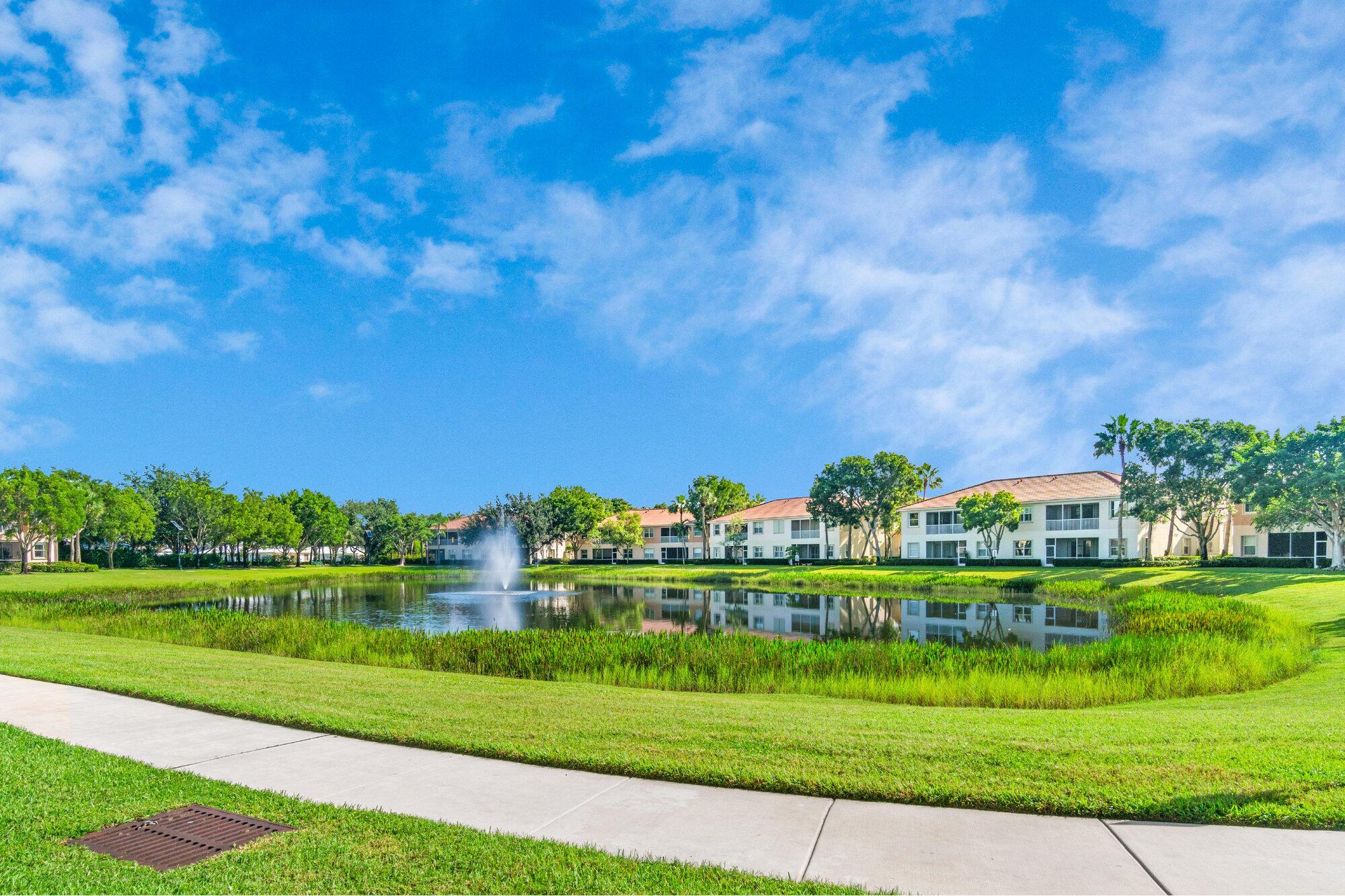 Gorgeous waterfront condo for sale in Wellington's highly sought-after active adult 55+ community, Mayfair at Wellington! This spacious first-floor condo offers 3 bedrooms, 2 bathrooms, a 2-car garage, and over 1,800 square feet of living space. Located in the heart of Wellington you'll enjoy convenient access to shopping, dining, and the renowned WEF showgrounds and Global Dressage, which are just minutes away! As you enter the covered and screened entryway, you'll be greeted by a foyer that flows seamlessly into the open living and dining areas. The kitchen, newly renovated in August 2023, showcases 42'' cabinets, quartz countertops, tile backsplash, pantry, and breakfast bar. It also features new stainless steel appliances (August 2023) and a cozy breakfast nook.