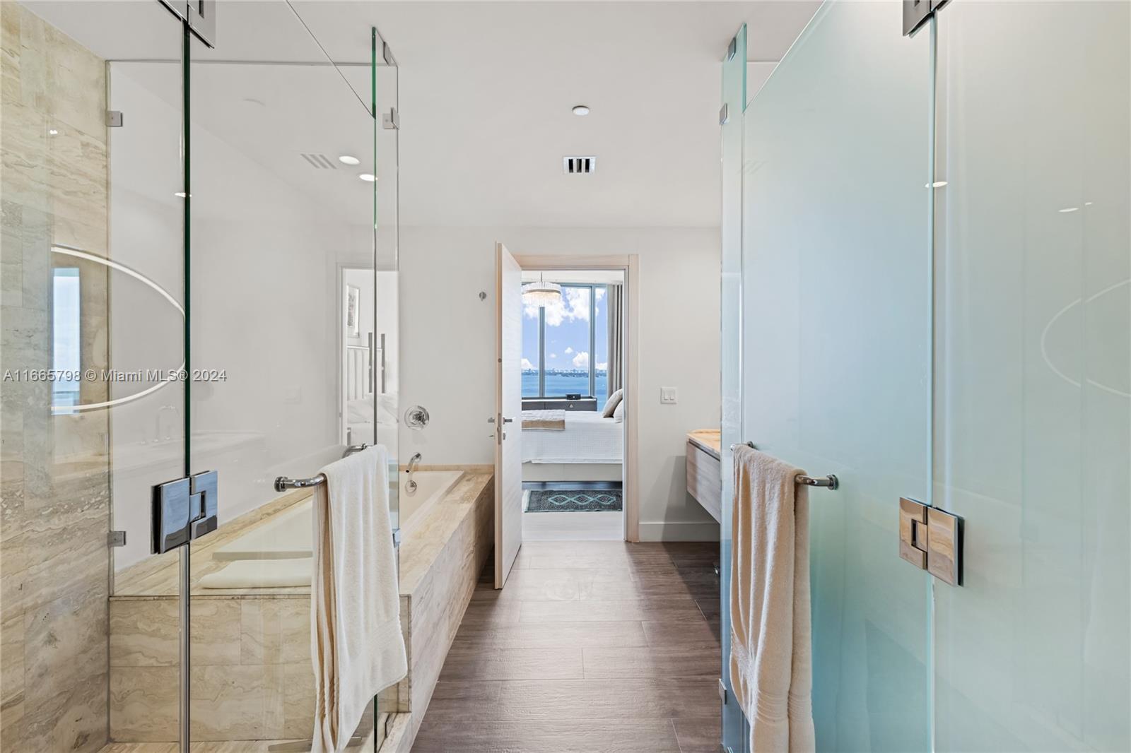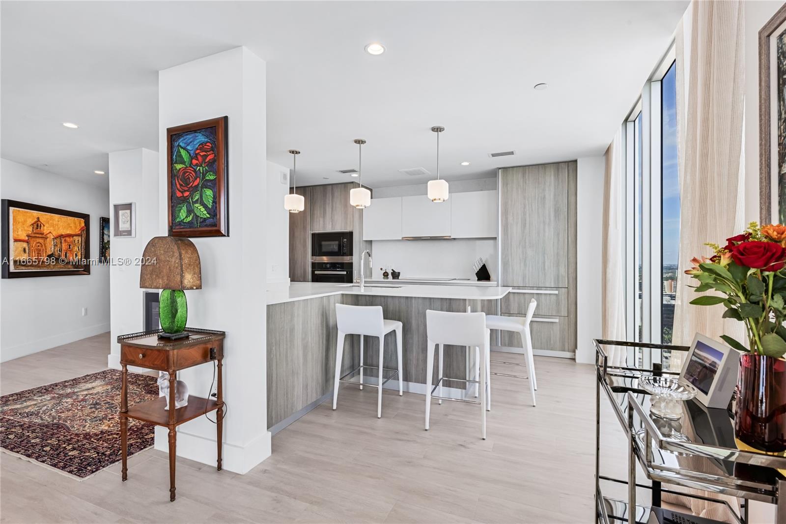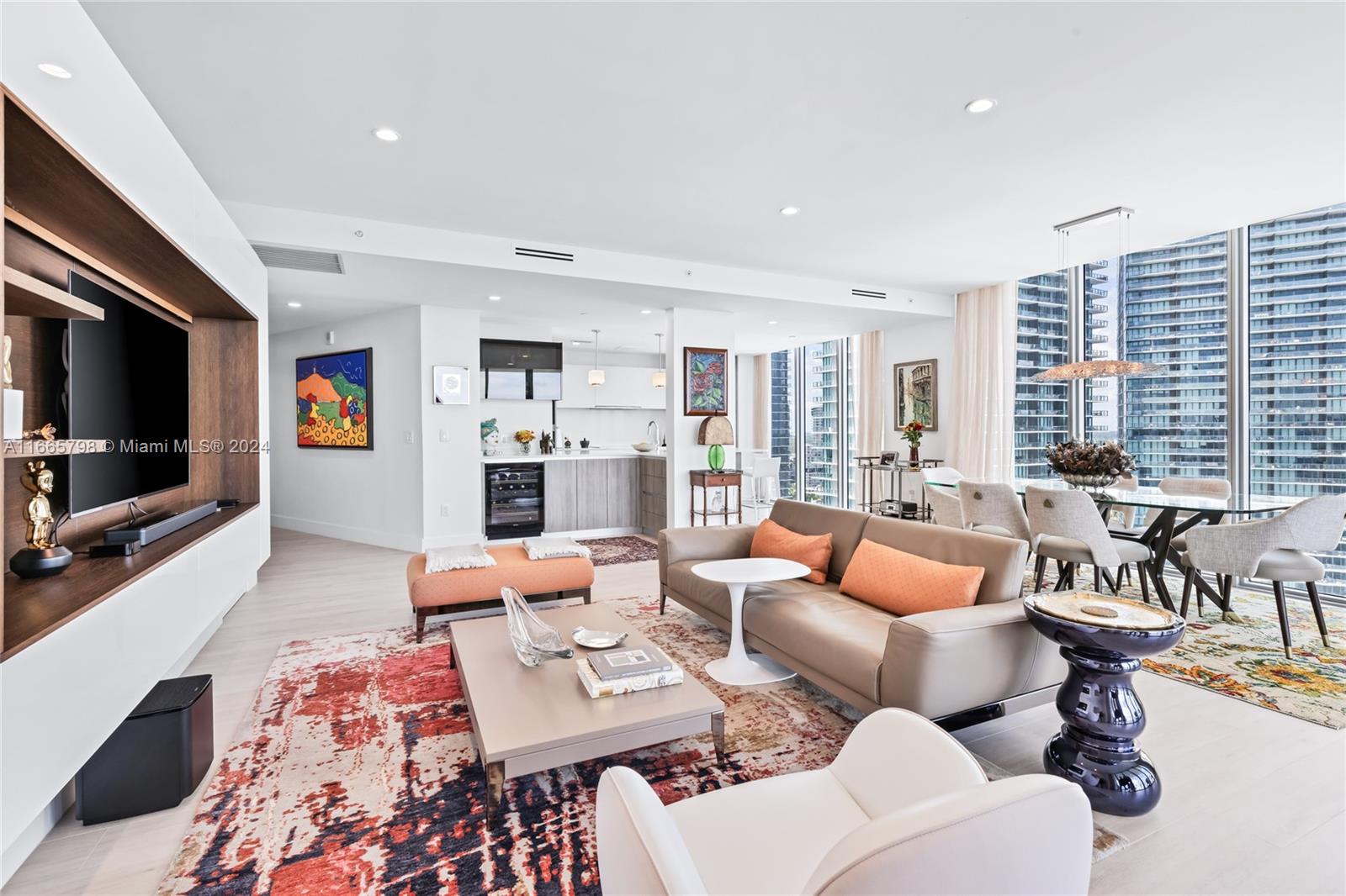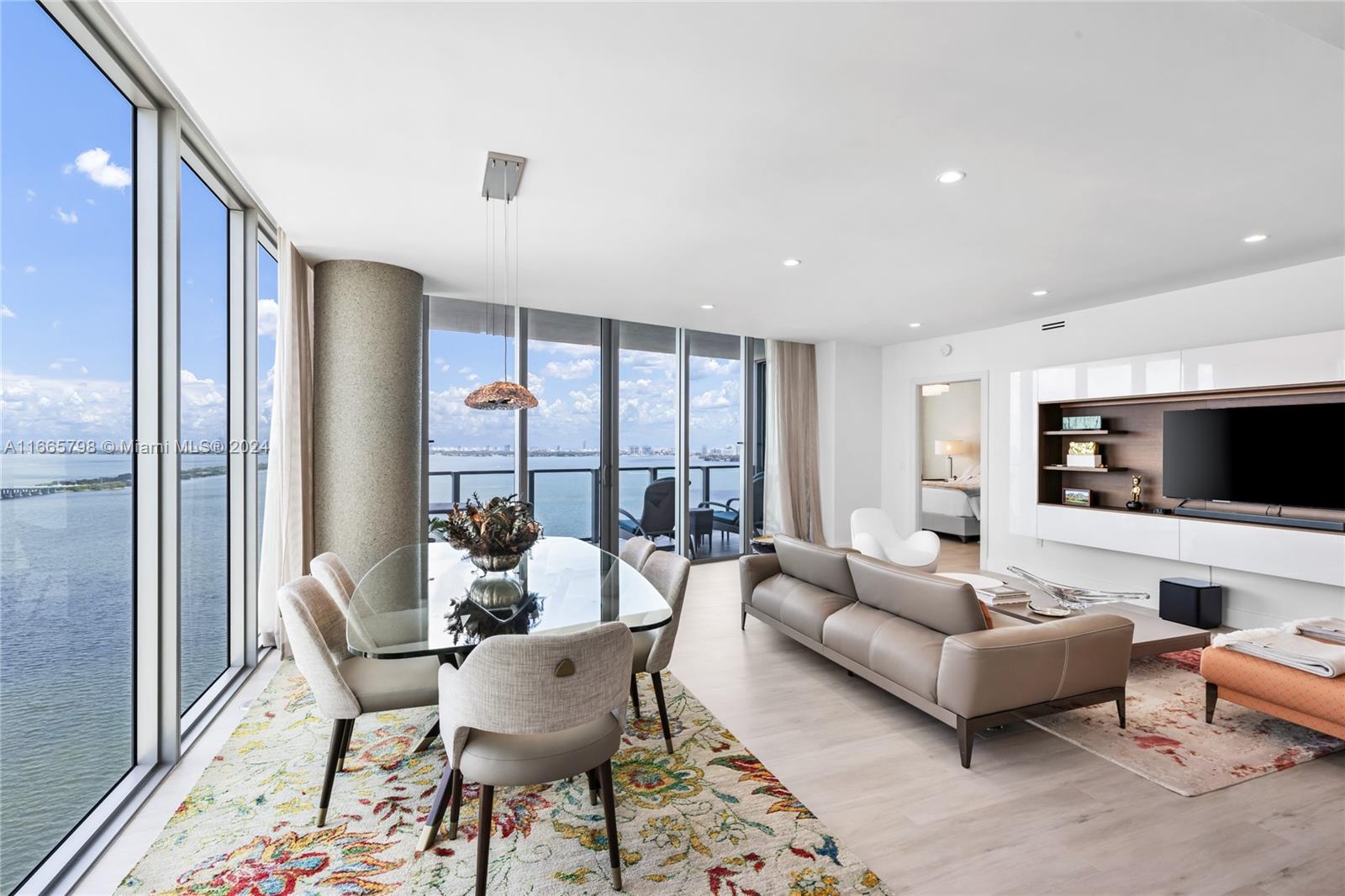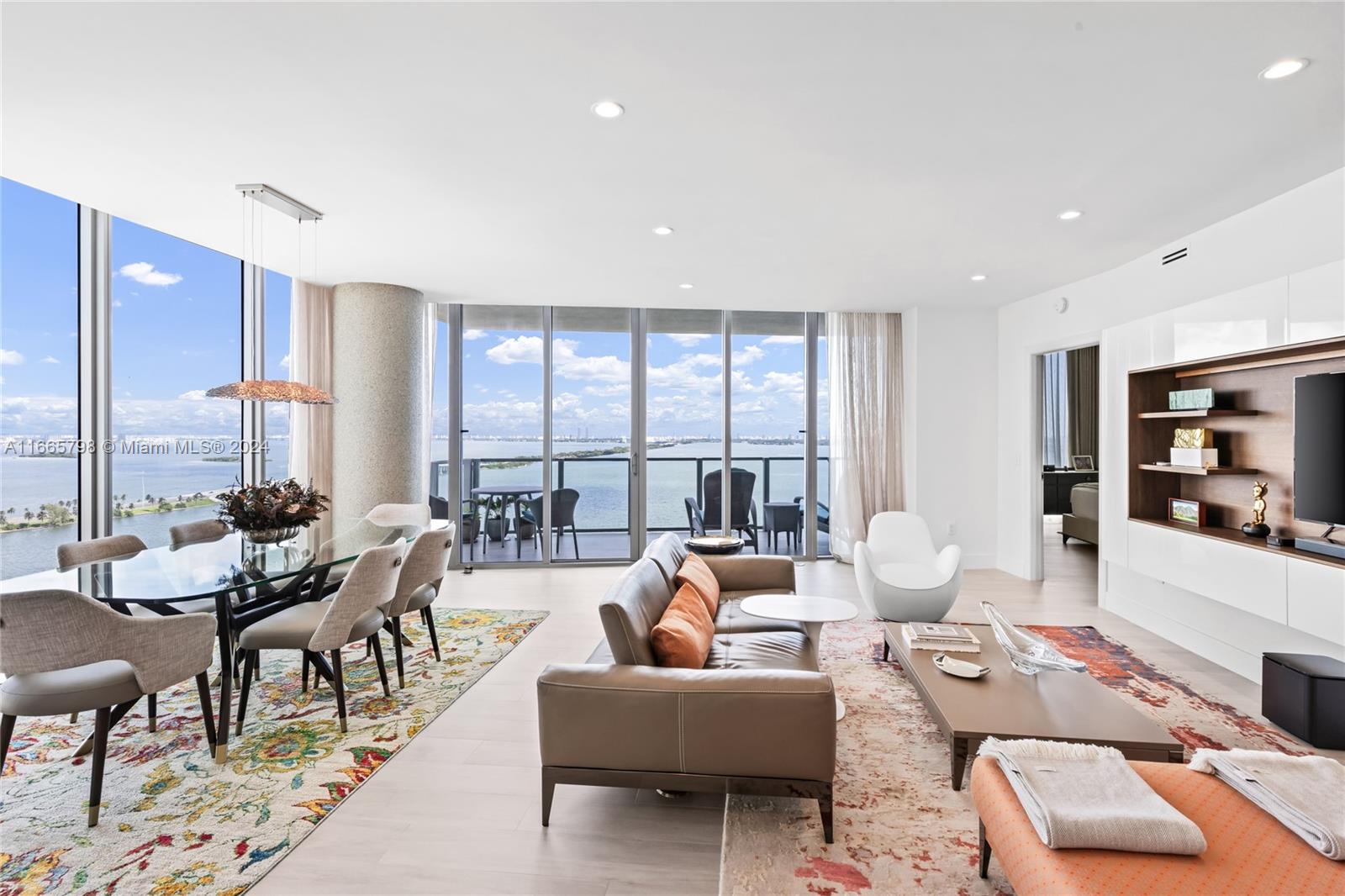 Enjoy breathtaking views of Biscayne Bay, and Miami Beach from this spectacular corner unit. Access your home through a private elevator into a thoughtfully converted spacious 2 beds plus a den (potential 3rd bed) and 3 baths. With 10+ ft floor-to-ceiling windows and two balconies, natural light fills the space. The open kitchen features a large island, top-tier Miele appliances, and custom European cabinets. The luxurious primary bath includes a spa tub, separate shower, dual vanity, and walk-in closet. The building offers resort-style amenities, including a Beach Club, two pools, tennis courts, a fitness center, theater, salon, sauna, steam room, business center, billiards room, and valet parking. Comes with 2 parking spaces & a storage unit.