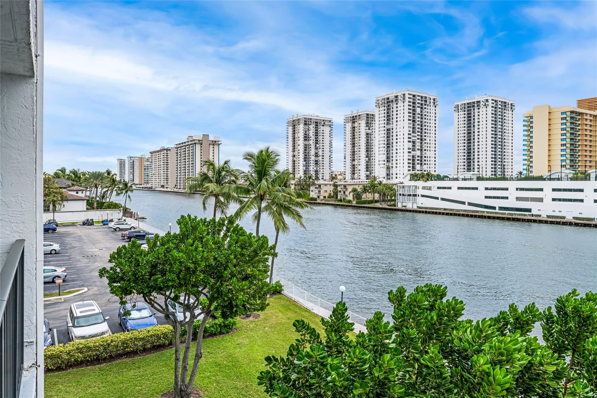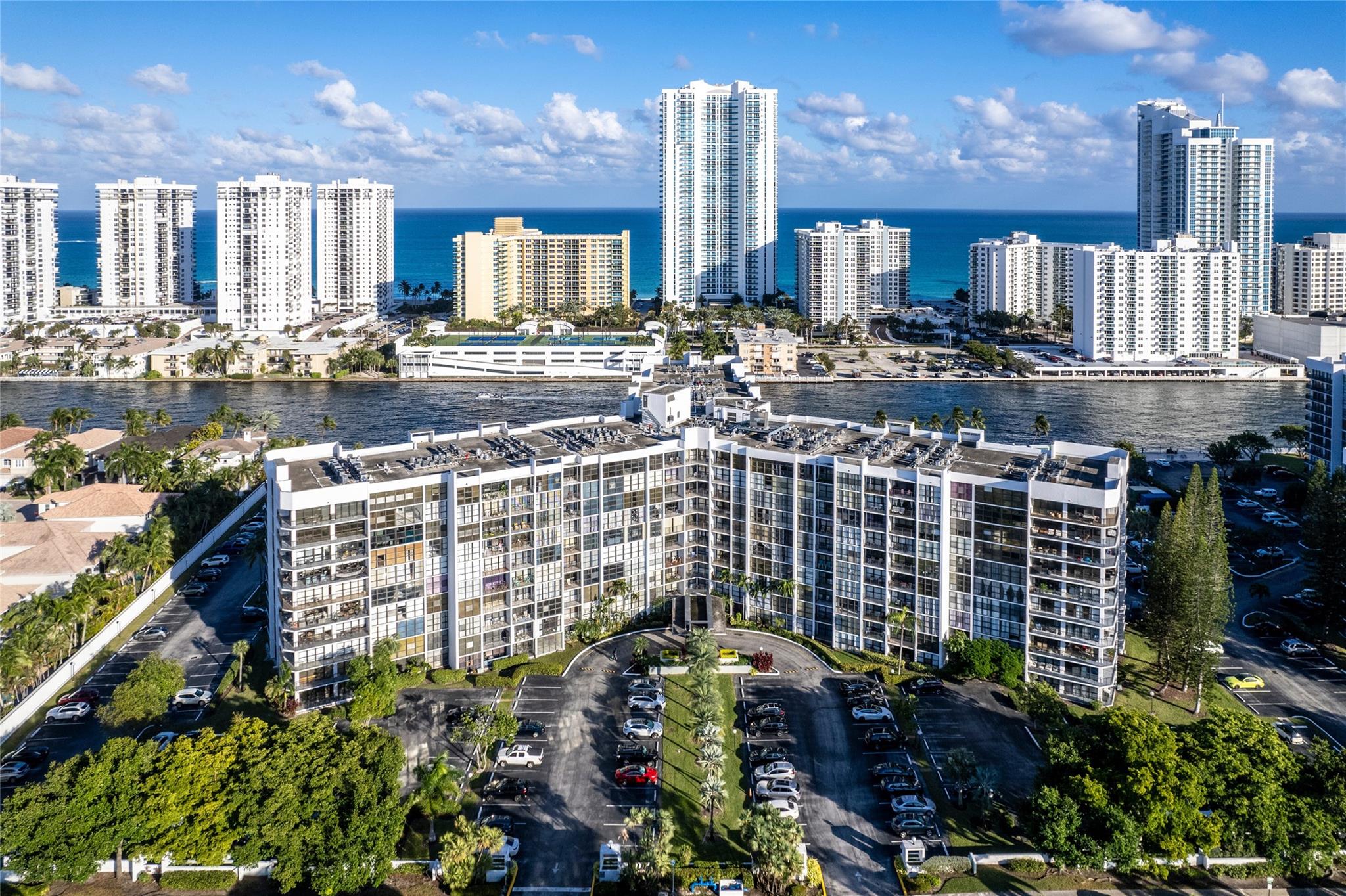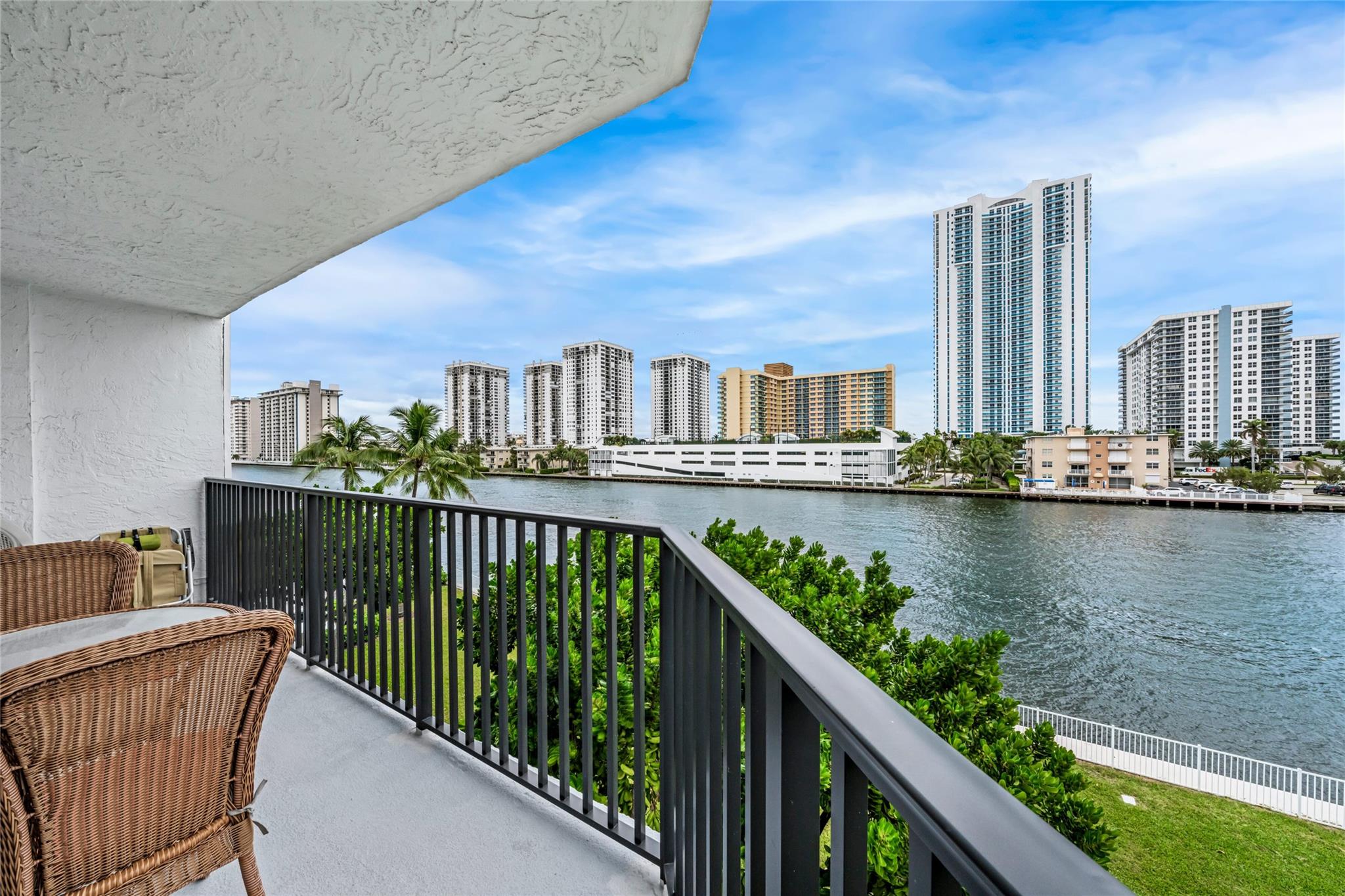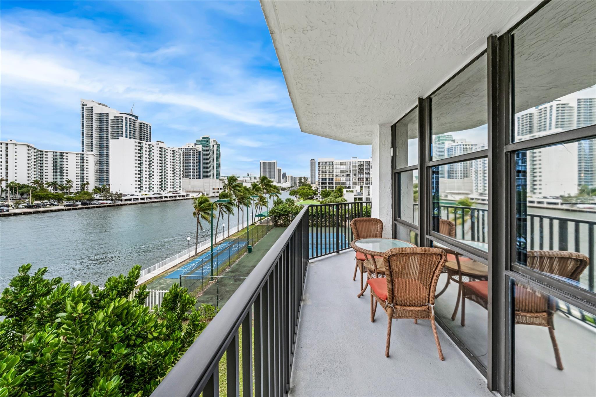 Indulge in luxury from the moment you step into this renovated, 3 bedroom (3rd bedroom has wardrobe cabinet) Oceanview Park condo at Three Islands. Immediately, be captivated by stunning SouthEast views of the Intraoastal Waterway through floor-to-ceiling windows. This corner residence spans 1,430 square feet (1,756 square feet with balcony). Revel in the bright, beautifully floored (waterproof vinyl) space throughout with natural light. The expansive wrap-around balcony embodies the essence of Florida living, offering unparalleled panoramas. Resort style amenities include a waterfront pool, tennis courts, fitness area and more. This renovated condo presents a waterfront haven in and ideal location with unmatched panoramic views.