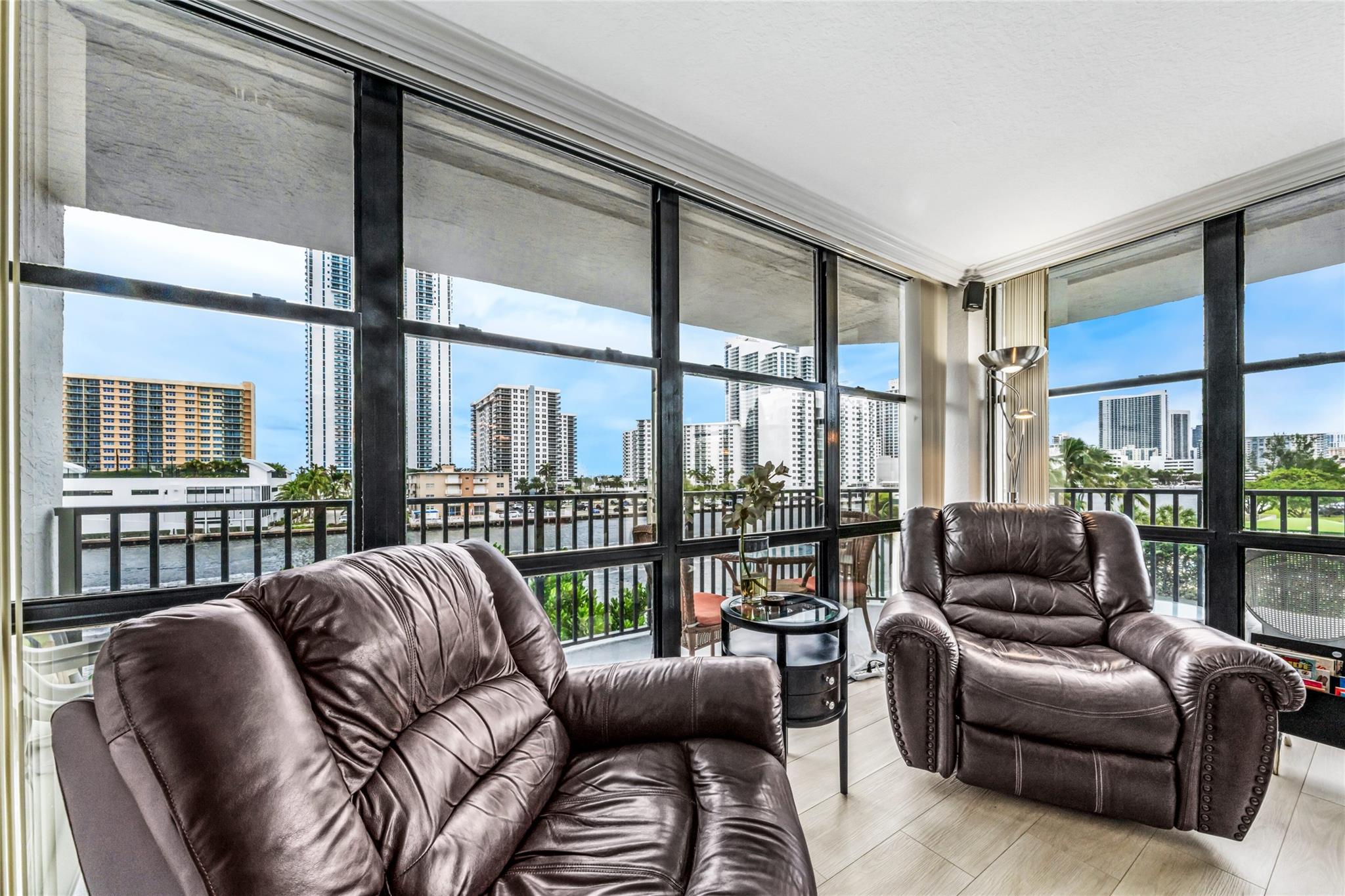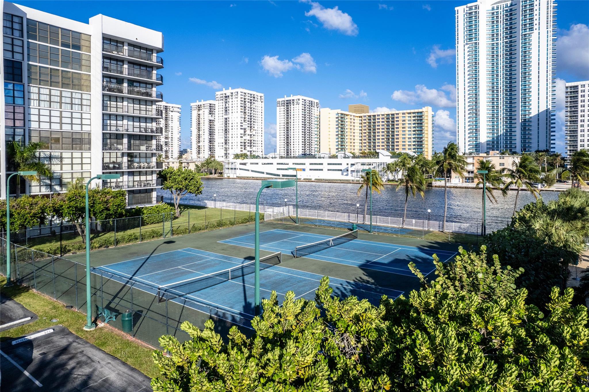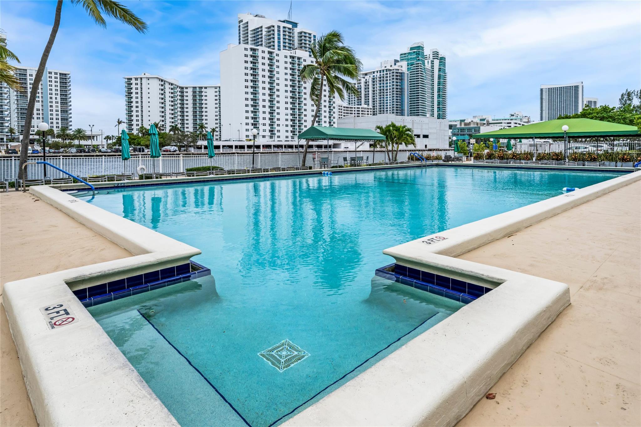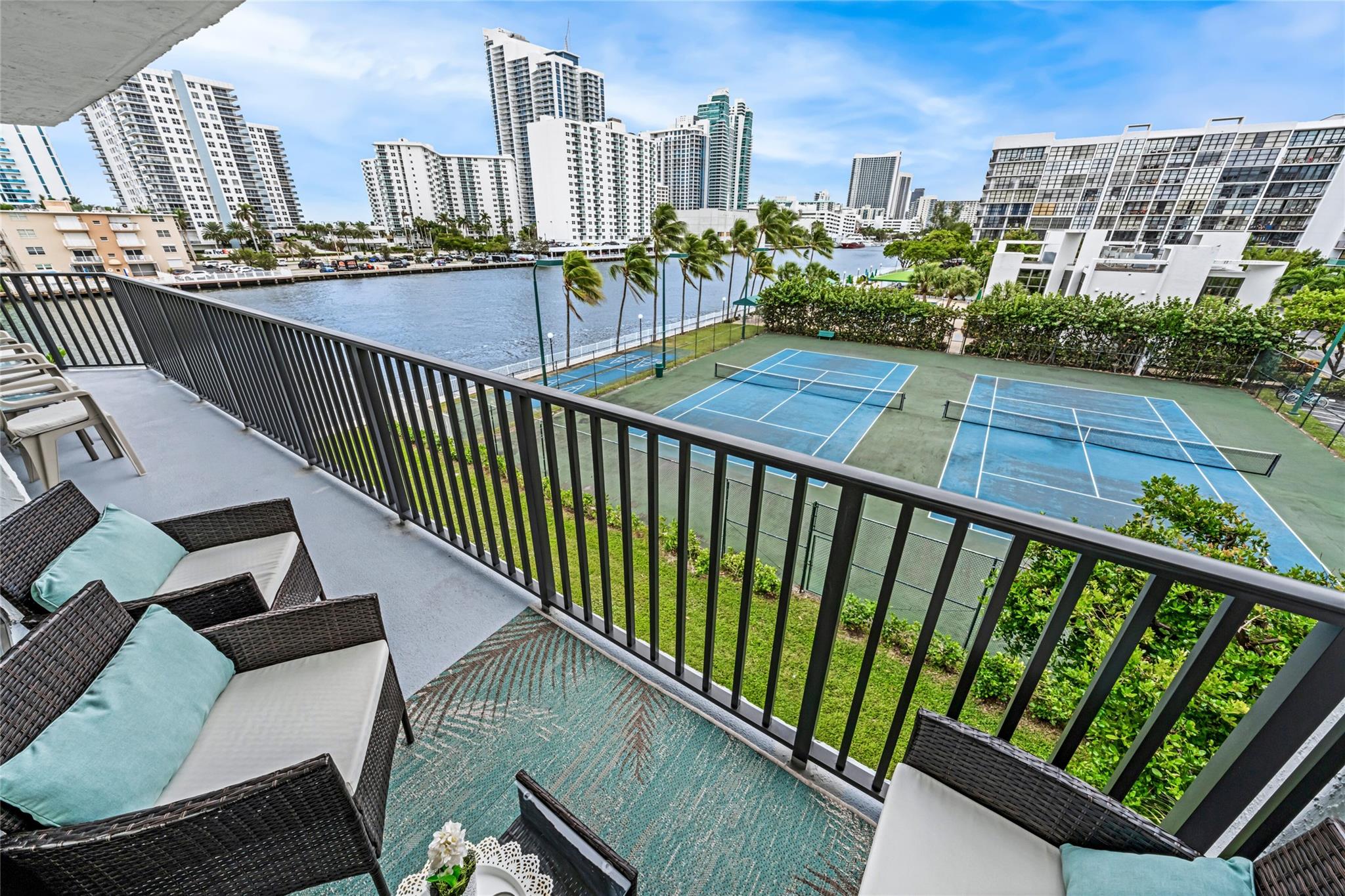 Indulge in luxury from the moment you step into this renovated, 3 bedroom (3rd bedroom has wardrobe cabinet) Oceanview Park condo at Three Islands. Immediately, be captivated by stunning SouthEast views of the Intraoastal Waterway through floor-to-ceiling windows. This corner residence spans 1,430 square feet (1,756 square feet with balcony). Revel in the bright, beautifully floored (waterproof vinyl) space throughout with natural light. The expansive wrap-around balcony embodies the essence of Florida living, offering unparalleled panoramas. Resort style amenities include a waterfront pool, tennis courts, fitness area and more. This renovated condo presents a waterfront haven in and ideal location with unmatched panoramic views.