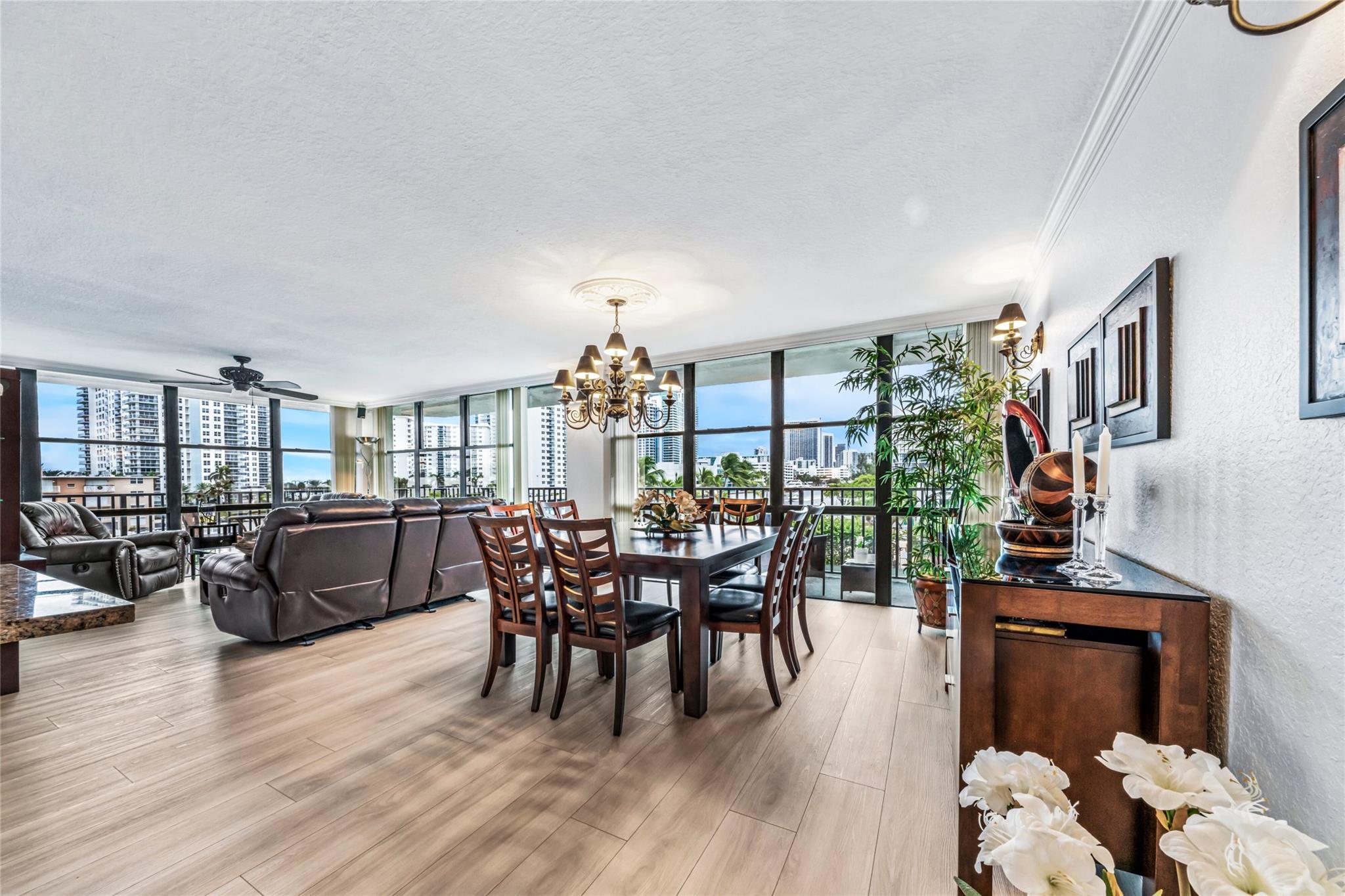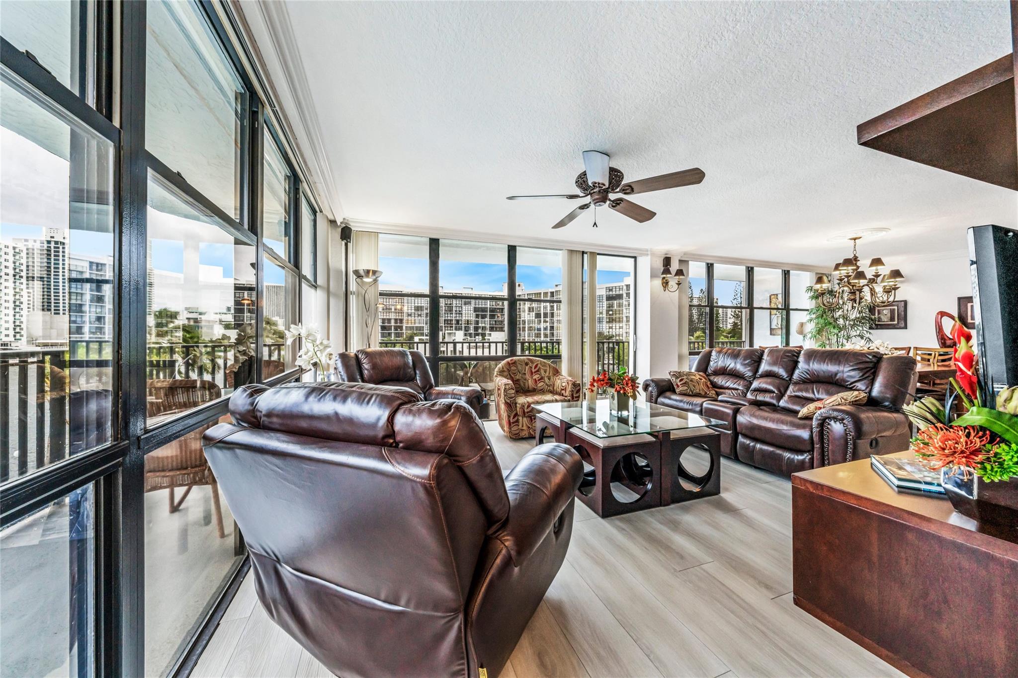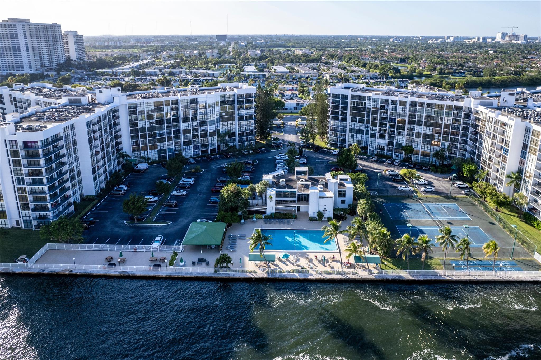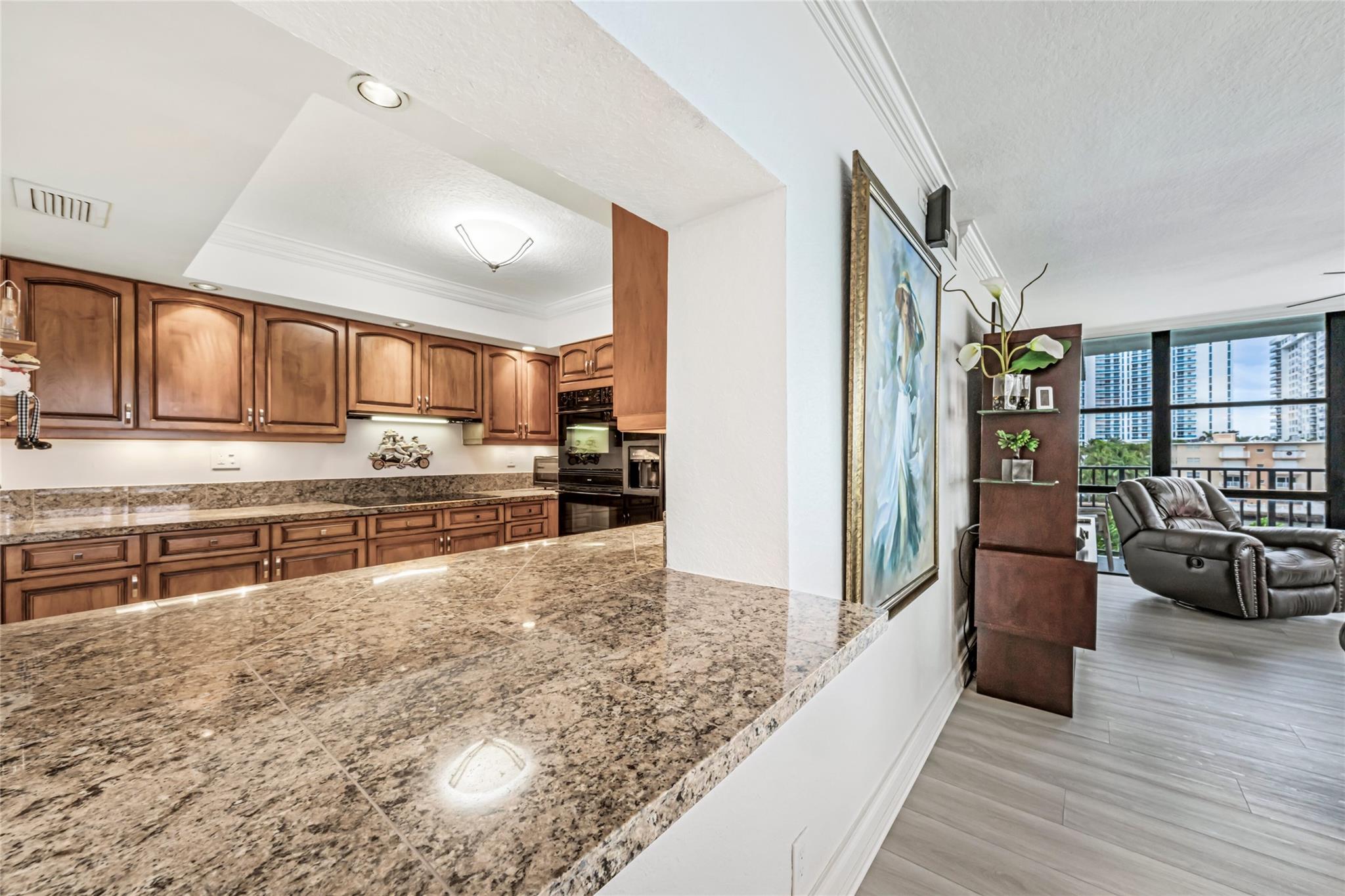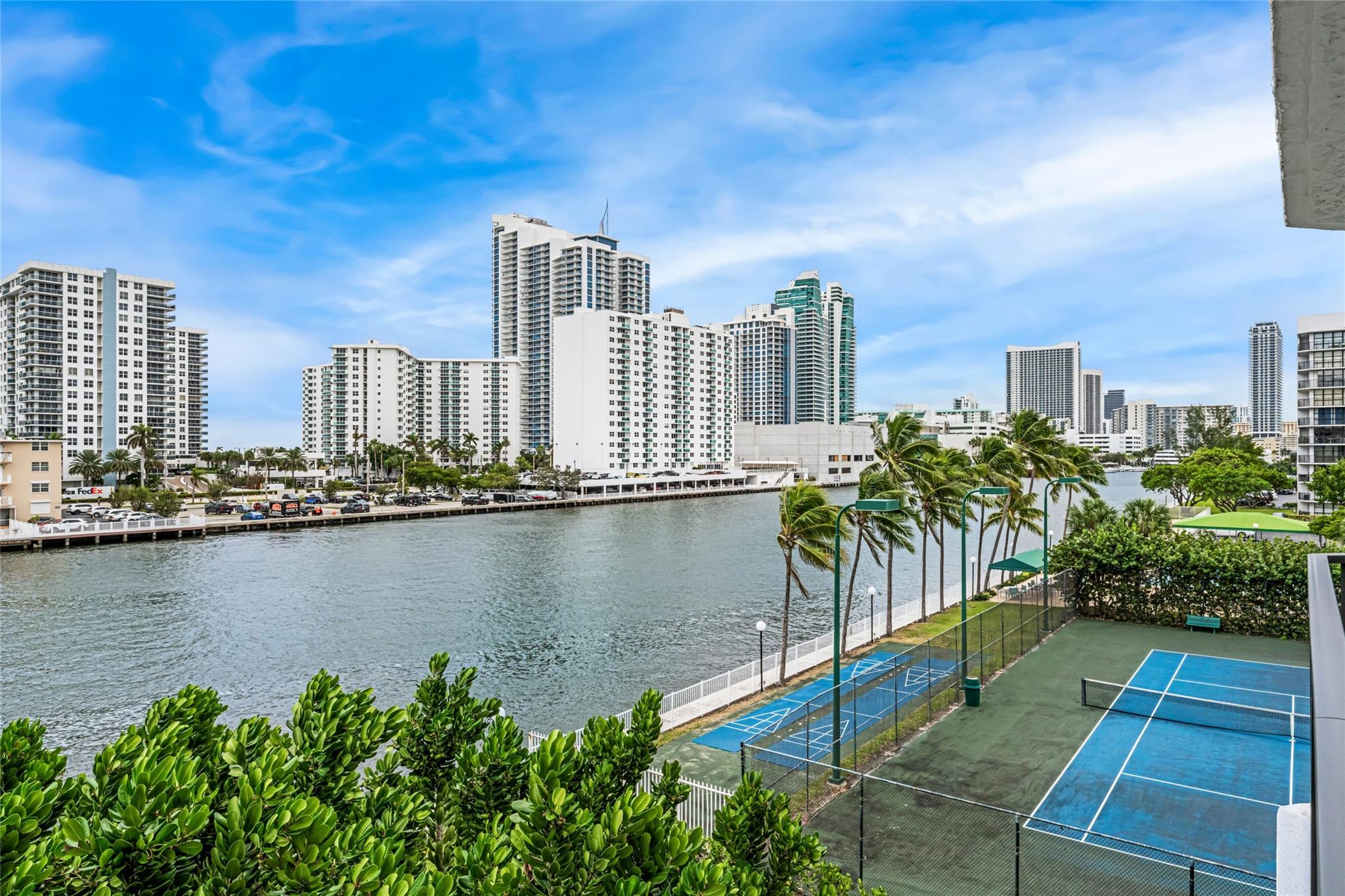 Indulge in luxury from the moment you step into this renovated, 3 bedroom (3rd bedroom has wardrobe cabinet) Oceanview Park condo at Three Islands. Immediately, be captivated by stunning SouthEast views of the Intraoastal Waterway through floor-to-ceiling windows. This corner residence spans 1,430 square feet (1,756 square feet with balcony). Revel in the bright, beautifully floored (waterproof vinyl) space throughout with natural light. The expansive wrap-around balcony embodies the essence of Florida living, offering unparalleled panoramas. Resort style amenities include a waterfront pool, tennis courts, fitness area and more. This renovated condo presents a waterfront haven in and ideal location with unmatched panoramic views.