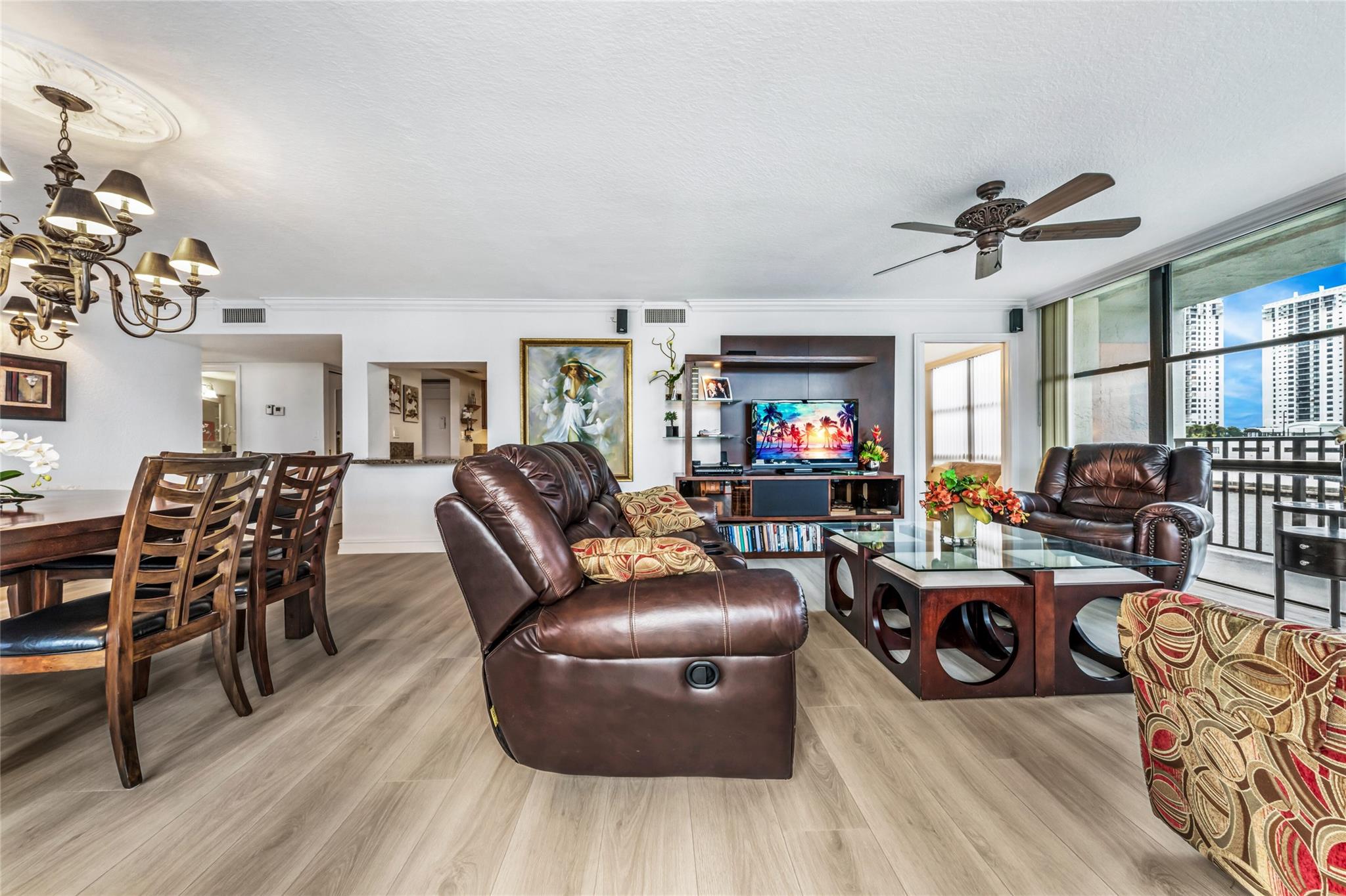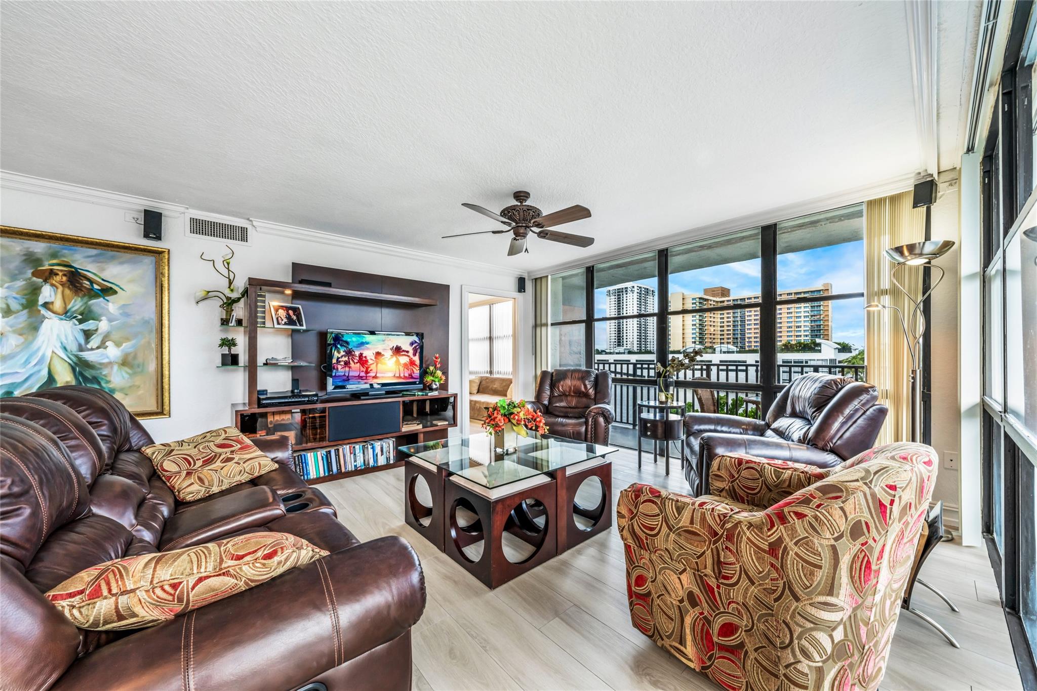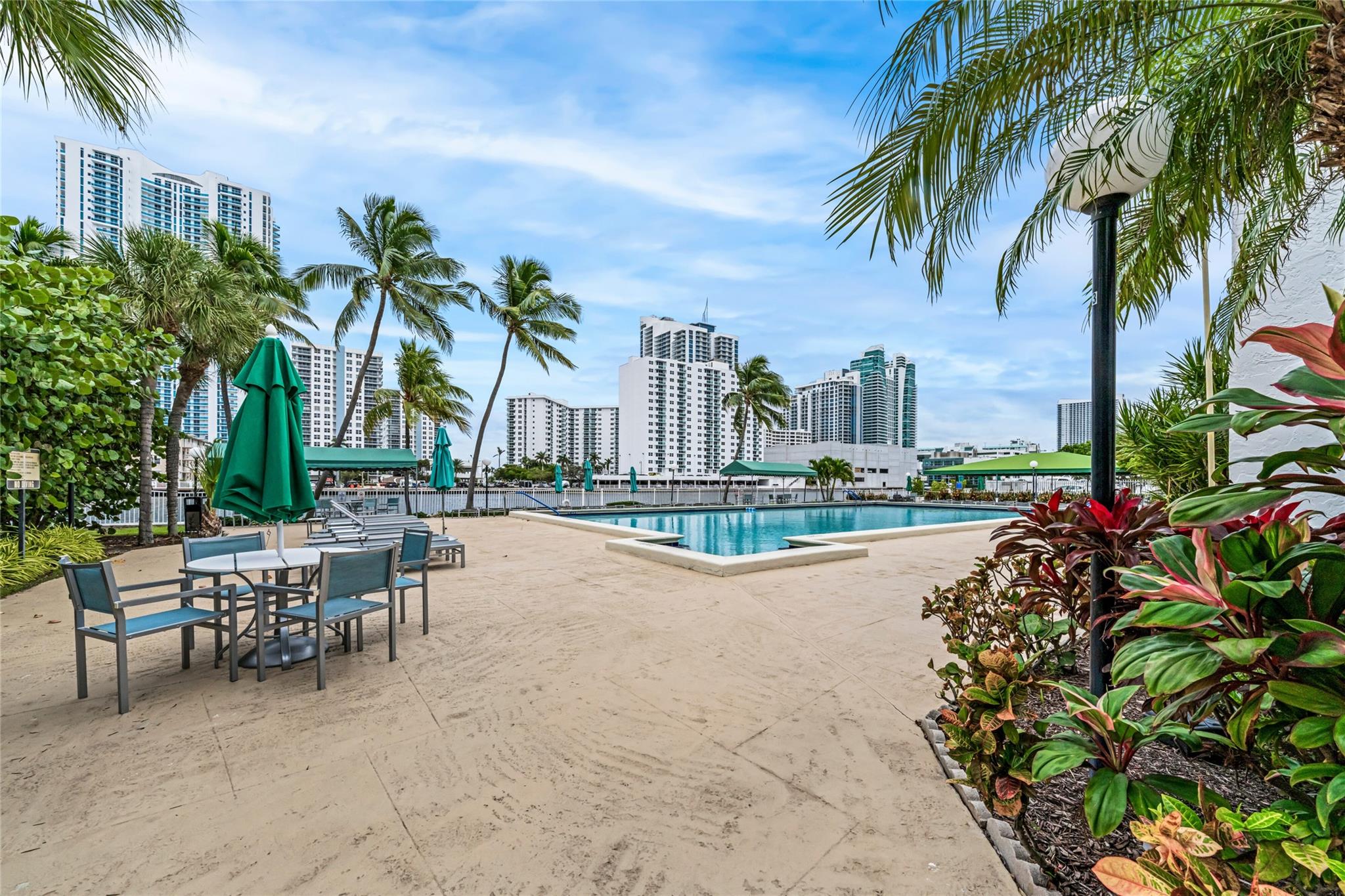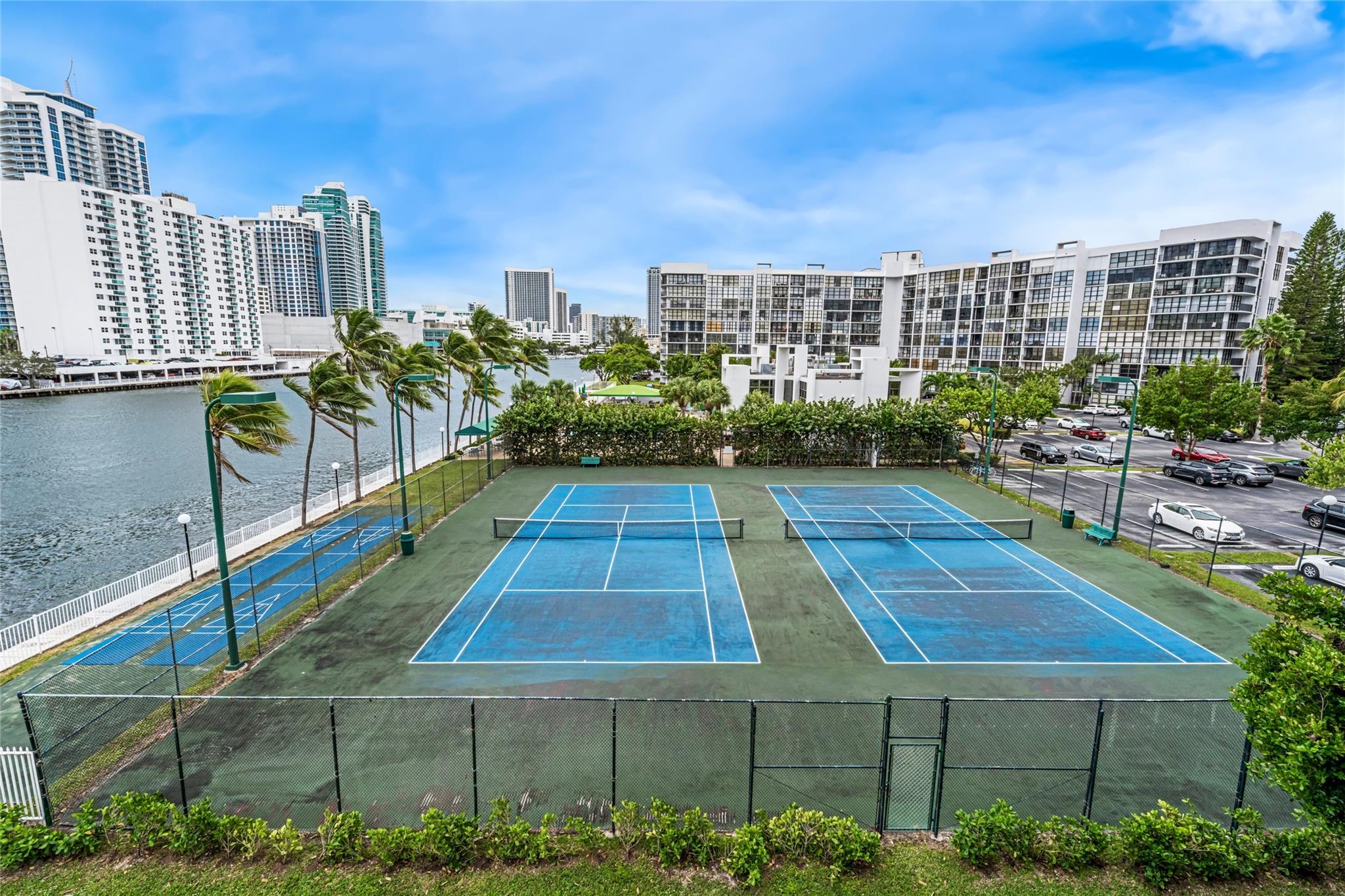 Indulge in luxury from the moment you step into this renovated, 3 bedroom (3rd bedroom has wardrobe cabinet) Oceanview Park condo at Three Islands. Immediately, be captivated by stunning SouthEast views of the Intraoastal Waterway through floor-to-ceiling windows. This corner residence spans 1,430 square feet (1,756 square feet with balcony). Revel in the bright, beautifully floored (waterproof vinyl) space throughout with natural light. The expansive wrap-around balcony embodies the essence of Florida living, offering unparalleled panoramas. Resort style amenities include a waterfront pool, tennis courts, fitness area and more. This renovated condo presents a waterfront haven in and ideal location with unmatched panoramic views.