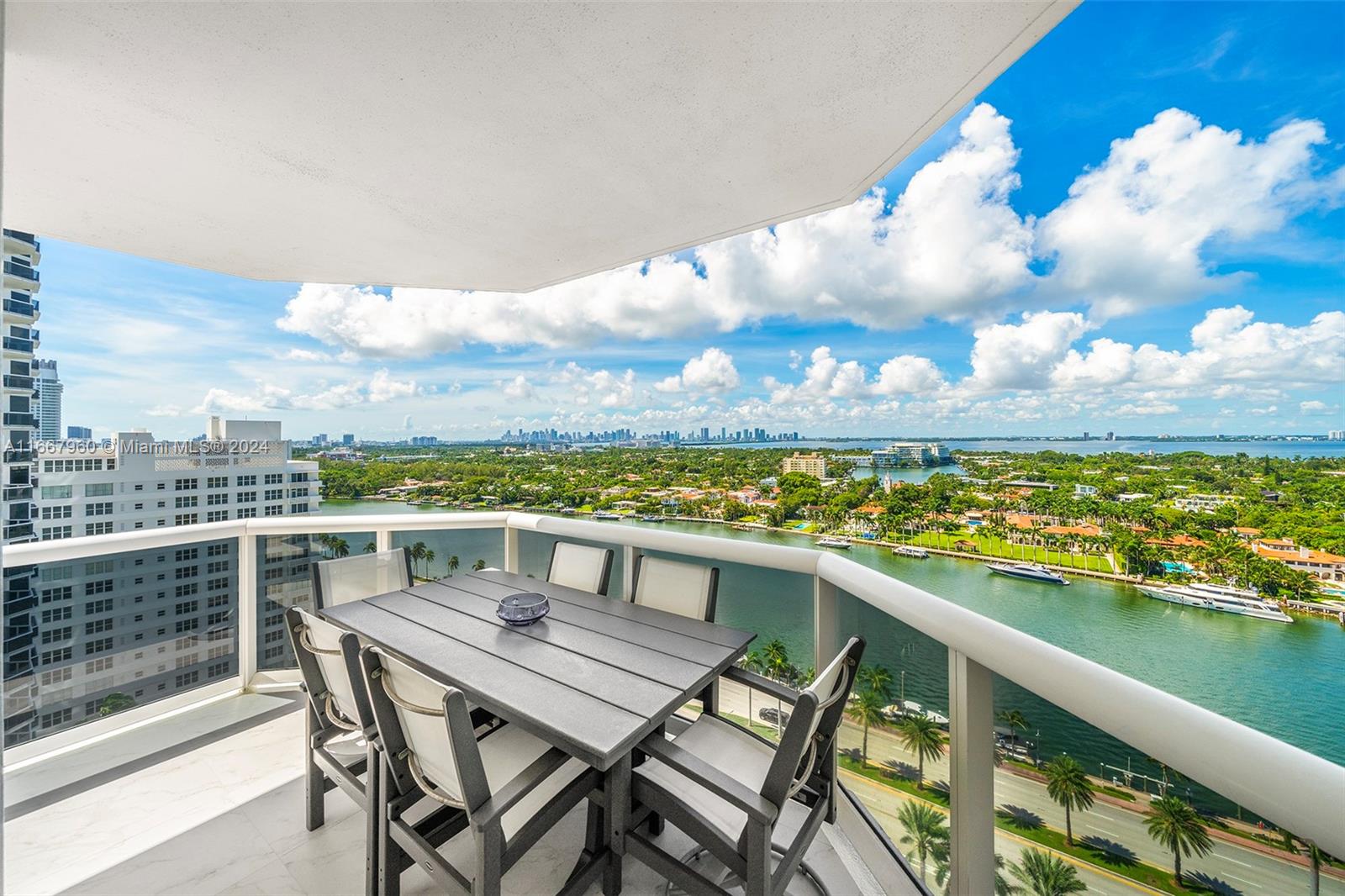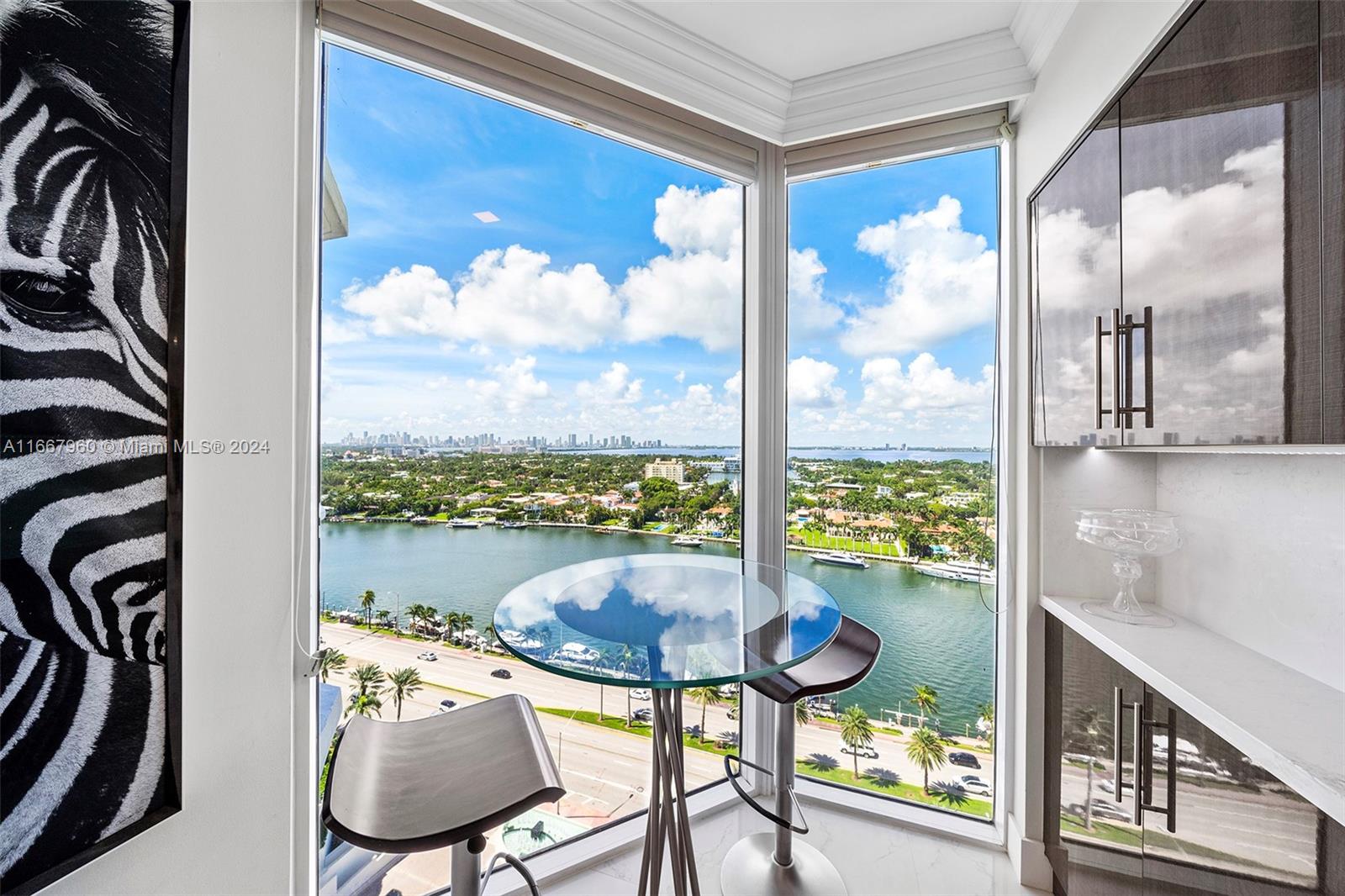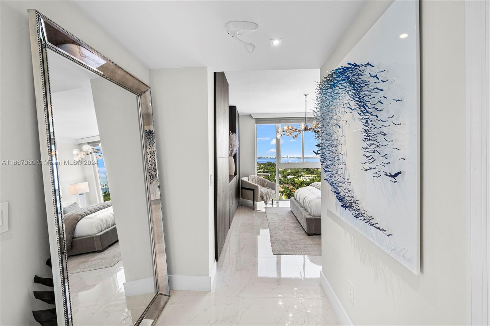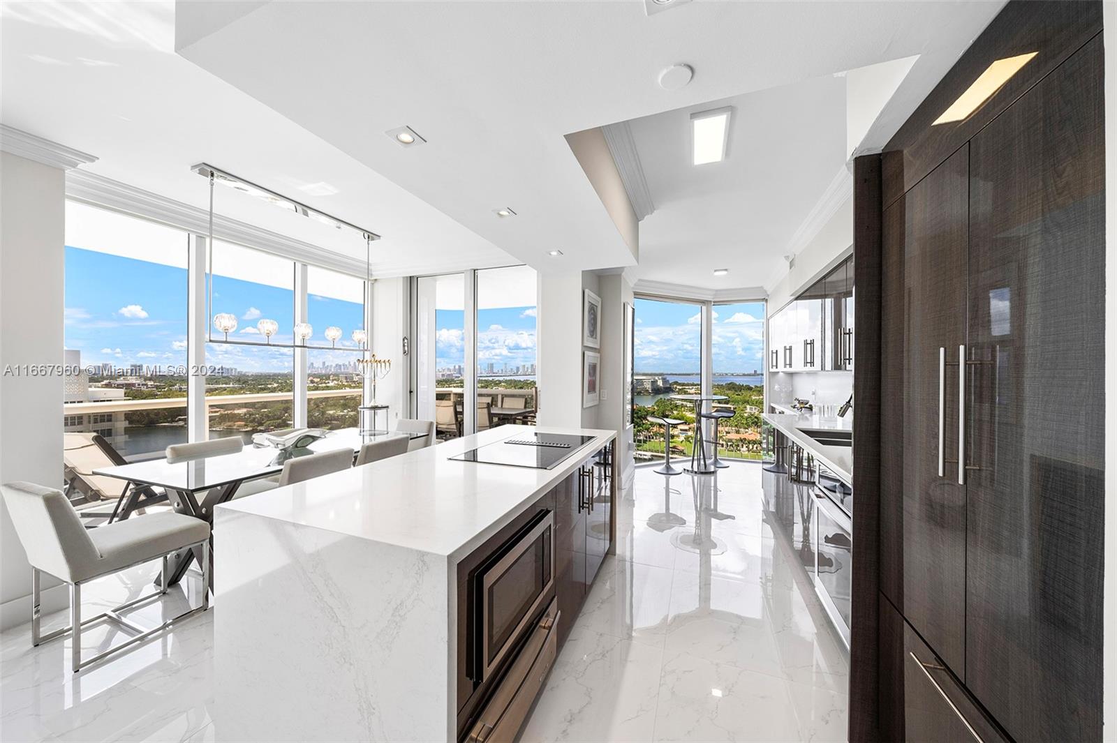 Stunning 2-bedroom, 2-bath corner unit in the prestigious Blue Diamond, Mid-Miami Beach. This beautifully renovated SW corner residence features a wrap-around terrace offering breathtaking views of the Miami skyline, ocean, and bay. Porcelain white flooring throughout creates an airy, modern feel. The open kitchen boasts high-end finishes and flows seamlessly into the large living and dining area, perfect for entertaining. The redesigned primary suite offers ample space, built-ins for generous closet storage, and an en-suite bathroom. The second bedroom also features a walk-in closet and built-ins, maximizing space and functionality. Enjoy luxury living with Blue Diamond's exceptional amenities and services, all in a prime location.