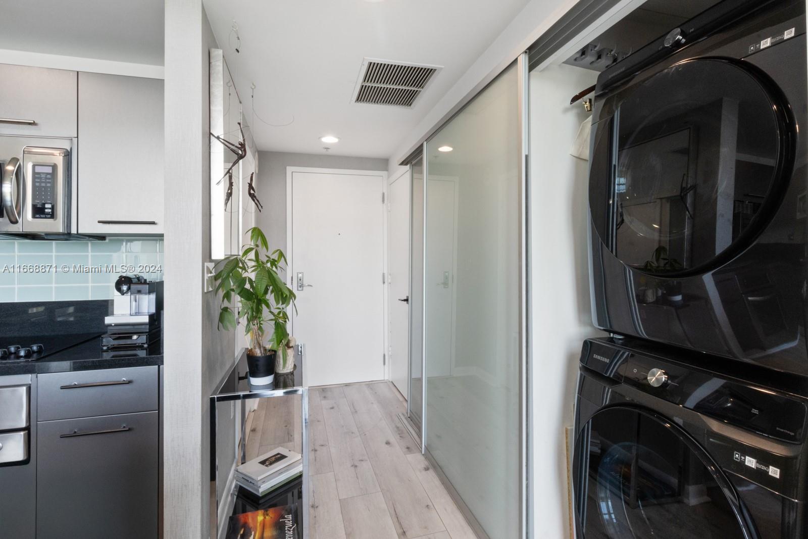This ultra-stylish 978 SqFt, 2-story loft is the sexiest and coolest loft in Vizcayne Condo. With 1B/1.5B and 19-foot floor-to-ceiling impact windows, it offers unobstructed views of Bayfront Park. Upgrades include waterproof laminate flooring, custom wallpaper, a black granite island for six, automatic blinds, and frosted glass doors hiding the pantry, washer/dryer, and extra storage. Both bathrooms have marble floors, with double sinks and a soaking tub in the primary. The walk-in closet features a custom Elfa system. 5-star amenities: 4 pools, gym, spa, sauna, steam room, jacuzzi, cold plunge, cinema, social lounge, and more. Located in walkable Downtown Miami, in front of Bayfront Park and the ocean, public transport. Includes 1 assigned parking spot and storage.
