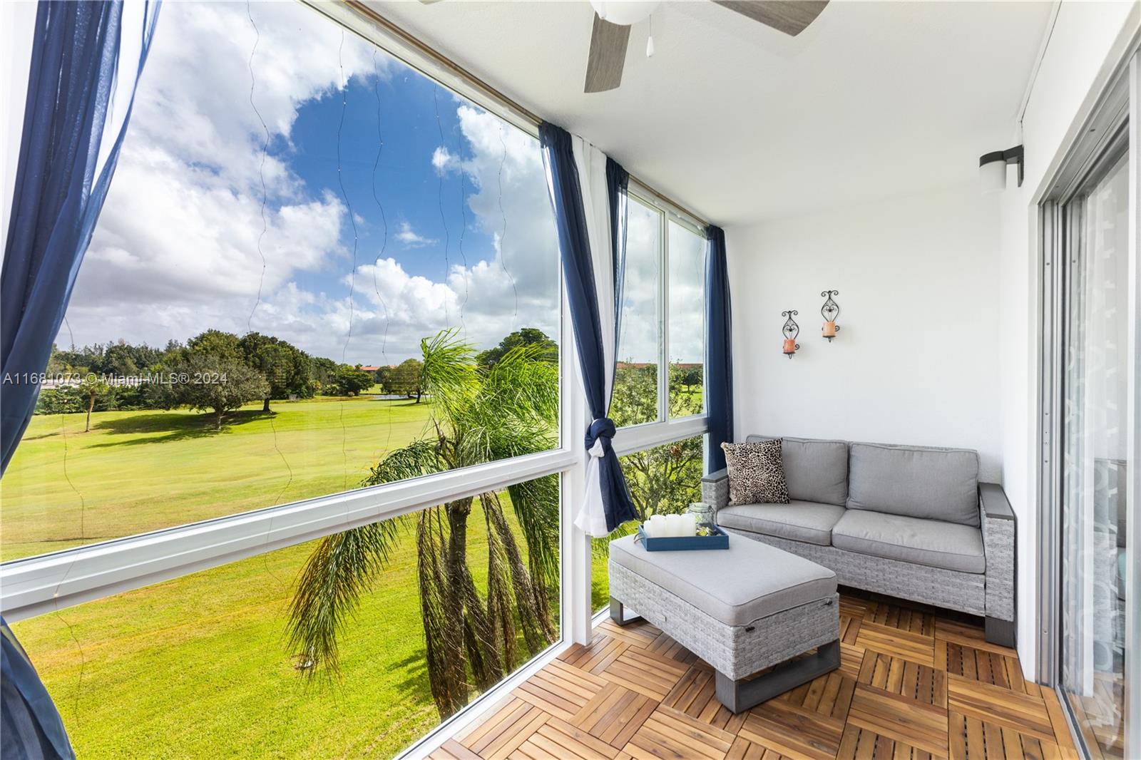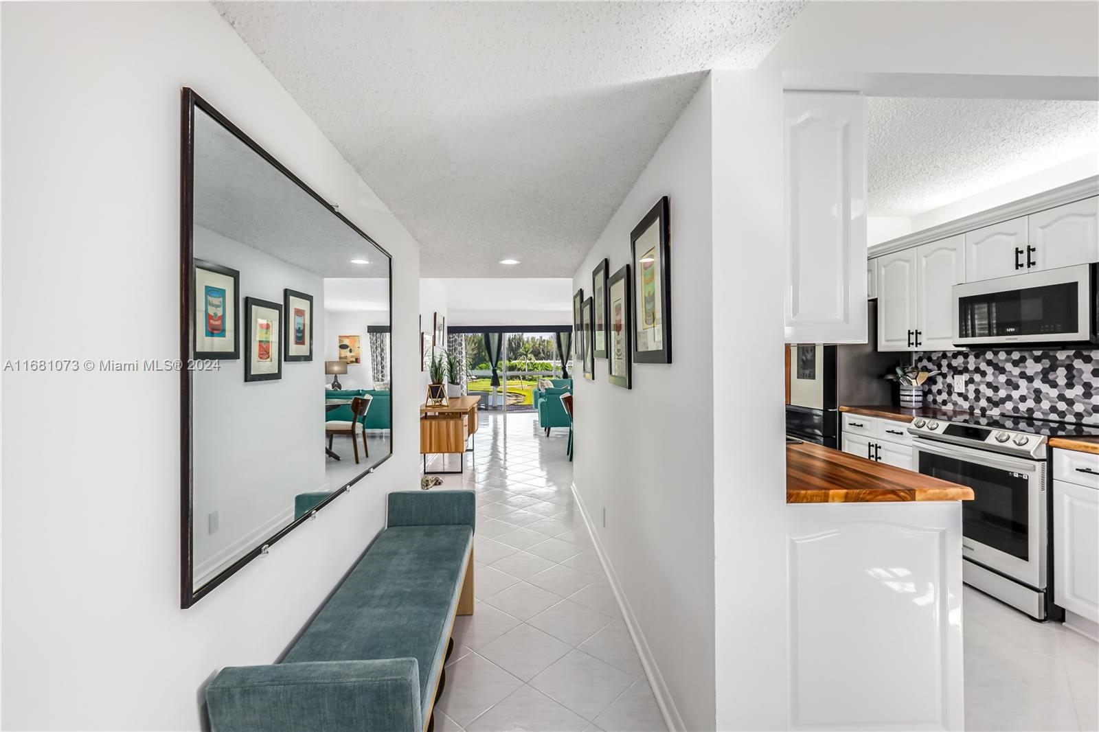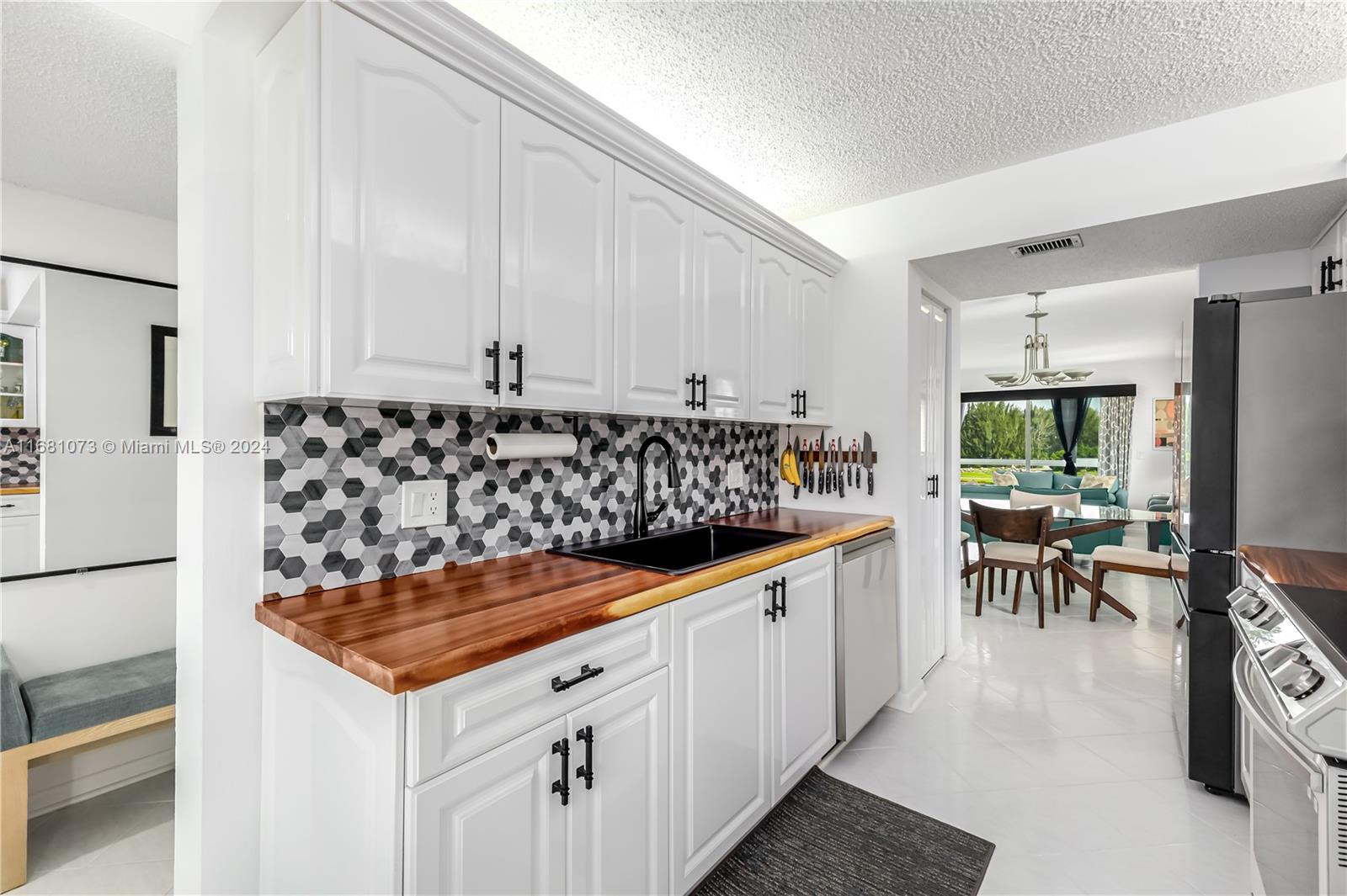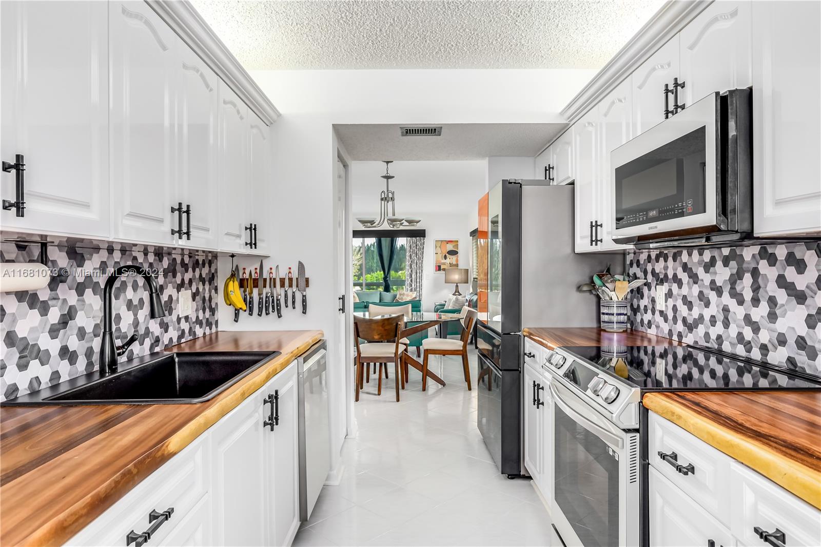 TOTAL RENOVATION! Leasing allowed immediately! Investors Welcome! "14"-line unit is the most desirable in Century Village due to it being a corner unit with 4-extra windows. 314 offers a new A/C (condenser and compressor) all new hurricane impact windows and door (enclosed balcony which overlooks the green golf course and lagoon/lake). New Samsung-BESPOKE model appliances (dishwasher, range/oven, microwave, dishwasher). Full-size washer/dryer. Butcher Block countertops and hexagon pattern backsplash. Large walk-in closets and lovely natural light throughout. 40-year recertification complete. No assessments per sellers. 55+ community offering every amenity you can think about including 71-course golf club, 1,042-seat theatre, world class clubhouse and transportation, multiple tennis courts.