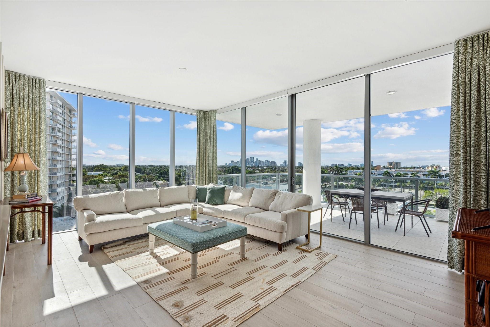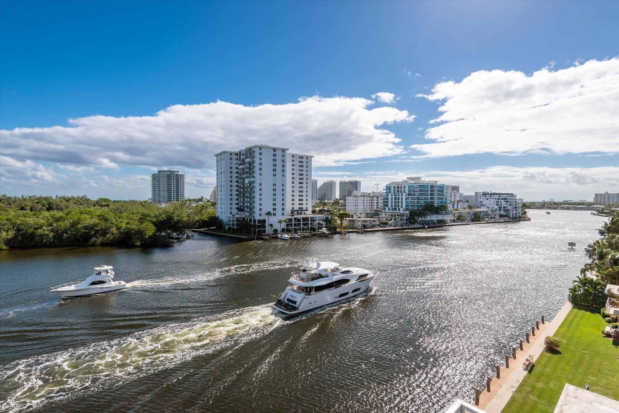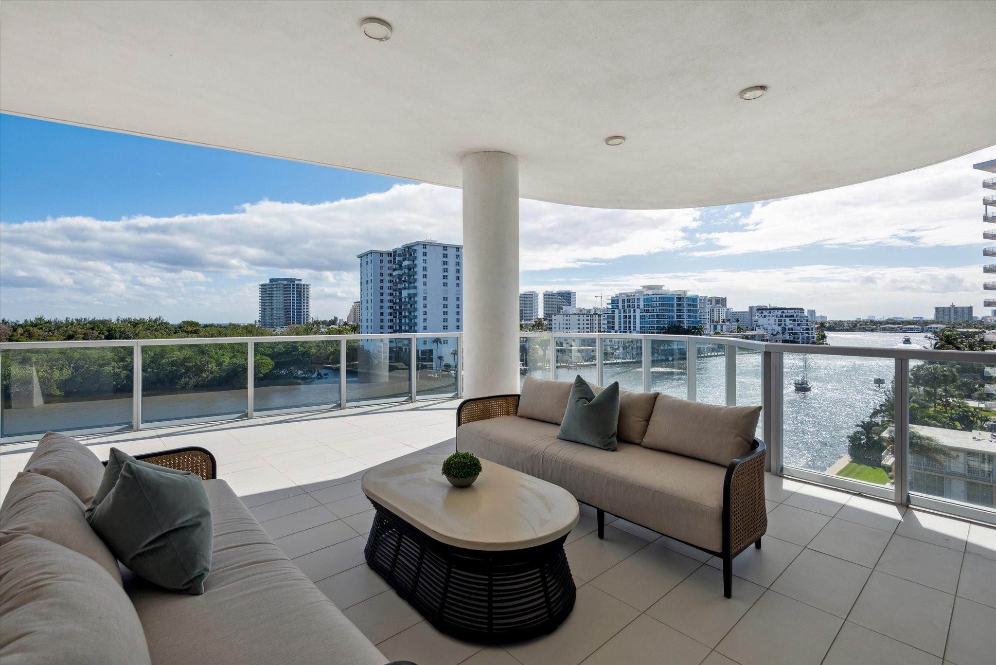 Located directly on the Intracoastal Waterway, Aquablu consists of 35 luxury residences. This flow-through SE corner unit offers sweeping views of the water/historic Bonnet House/City skyline from the impressive balconies. Private double door foyer entry opens to a great room with 10' ceilings & glass walls, highlighting the views & bathing the space in natural light. Professionally designed touches abound in the open-concept living/ dining spaces. The chef's kitchen boasts high-end appliances with a massive island, walk-in pantry, & immense counter space. Wake up to amazing sunrises from the Primary suite, which overlooks the water with a spa bath & 2 large walk-in closets. 2 additional en-suite bedrooms & two assigned covered parking spaces are located near beaches, shopping, & dining.