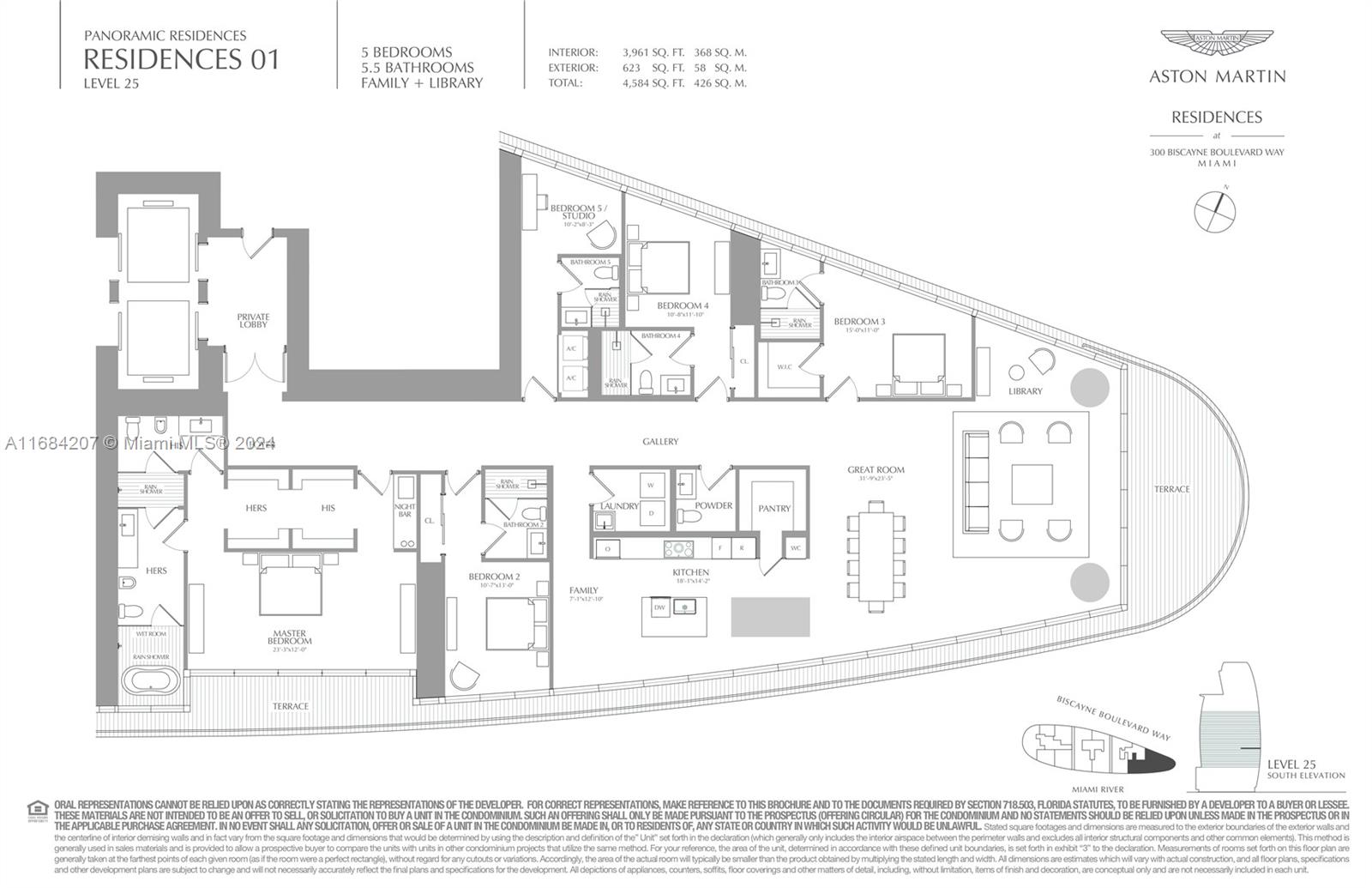 Discover sophisticated elegance at Residence #2501 at the renowned Aston Martin Residences! This highly coveted corner unit 01 line boasts the most spacious floor plan in the building & features 5 bedrooms, 5.5 bathrooms, & picturesque sweeping views of the Bay & Miami skyline. With walls of floor-to-ceiling glass, the interiors of this sky estate are flooded w/natural light. The chef's kitchen is fully equipped w/Gaggenau appliances & walk-in pantry. The wrap-around terrace is perfect for those that love to entertain. The lavish primary suite features dual spa-like bathrooms & massive walk-in closet. 43,000 SF of amenities including a 2-story fitness center, sky pool, full-service spa, & so much more. This residence seamlessly blends sophistication, comfort, and iconic Aston Martin style!