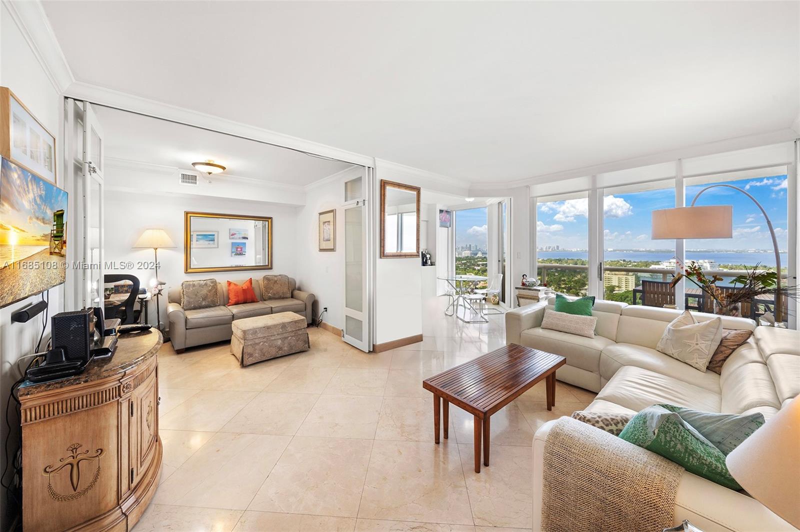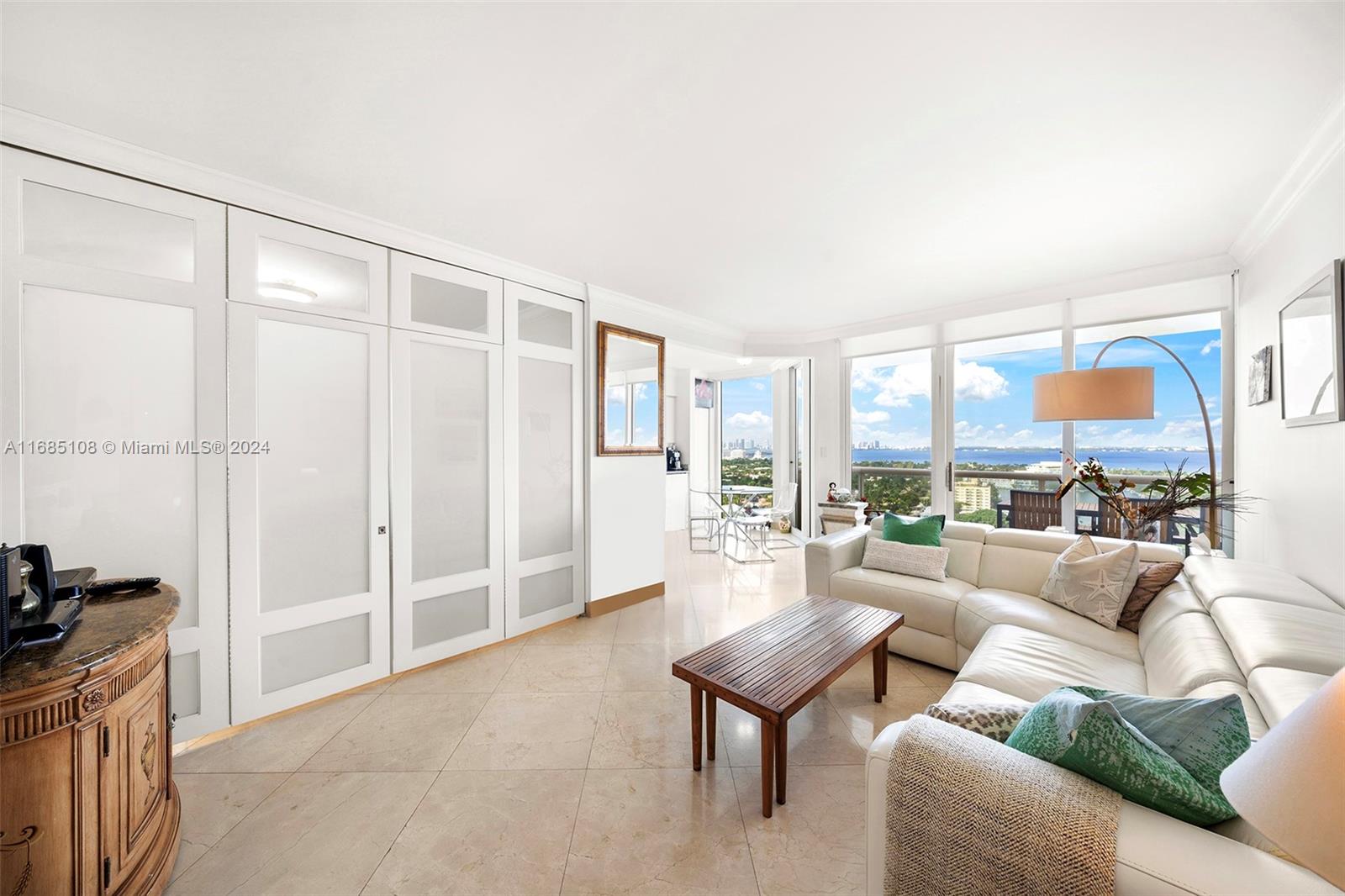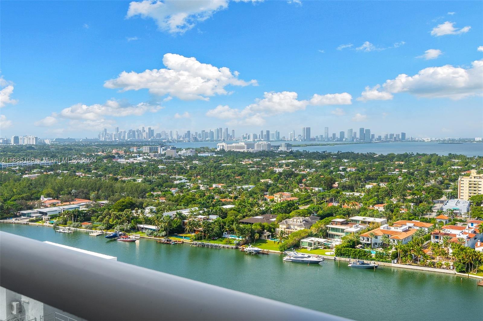 This one-bedroom, two-bath residence boasts a spacious living area and an open kitchen that flows into a large living room. Enjoy spectacular, unobstructed views of the Miami skyline and bay through floor-to-ceiling windows, filling the space with natural light. The home features beautiful marble floors throughout, adding elegance to every room. The primary bedroom includes an en-suite bathroom and a custom walk-in closet. Additionally, the versatile den has been designed as a second bedroom. Located in Miami Beach, the building offers incredible amenities for luxurious living.