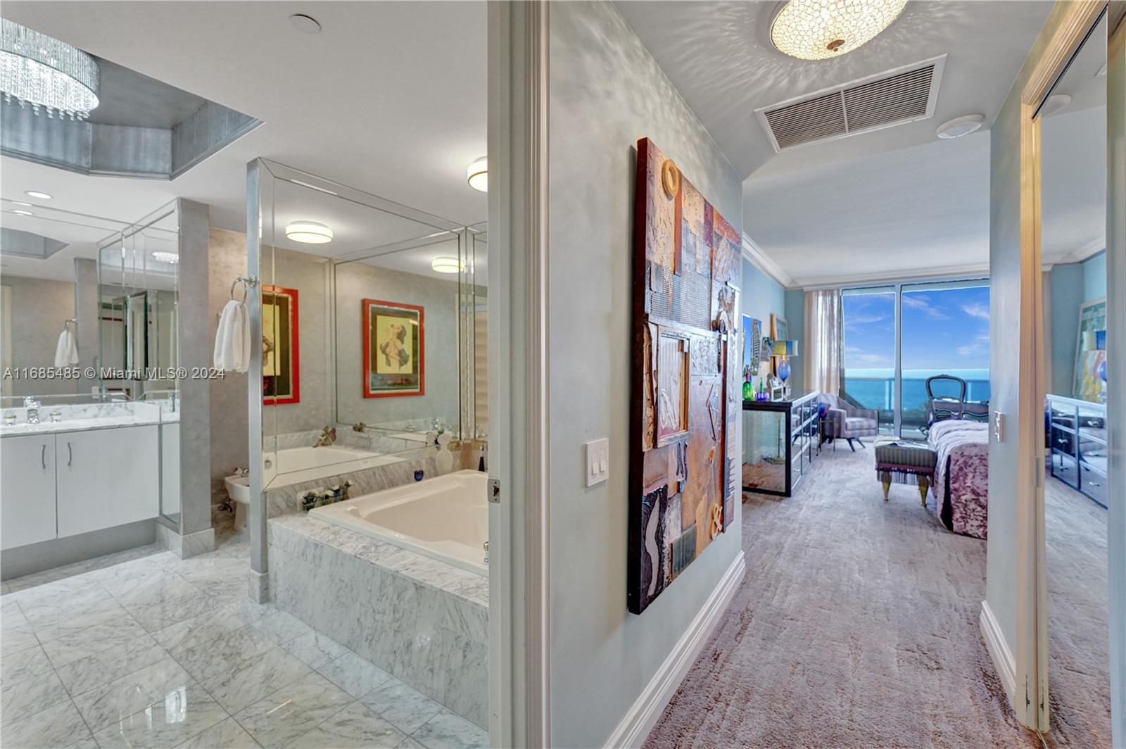 Come home in your private elevator straight to your foyer. This expansive unit encompasses 2,240 sq. ft. of thoughtfully designed living space, 2BD, 3BD. Layout maximizes natural light, creating a bright & inviting atmosphere. Elegant finishes enhance the sophisticated feel of the home. Kitchen: fully renovated, KitchenAid SS appliances, custom solid wood & glass cabinetry, quartz countertops & backsplash. Bar area. Enjoy breathtaking views of the Ocean, Intracoastal waterways marina & skyline. Electric shades throughout except in the liv. rm. Recessed lighting. 2 BA’s updated. New HVAC- 2018. Impact windows & doors. One Island Place, gated resort style community w/direct access to the Waterways Marina. Easy access to beaches, restaurants, shopping, houses of worship & top-tier schools.