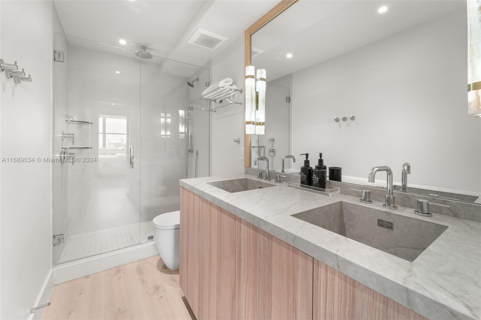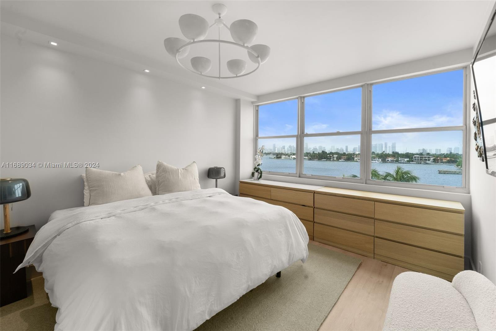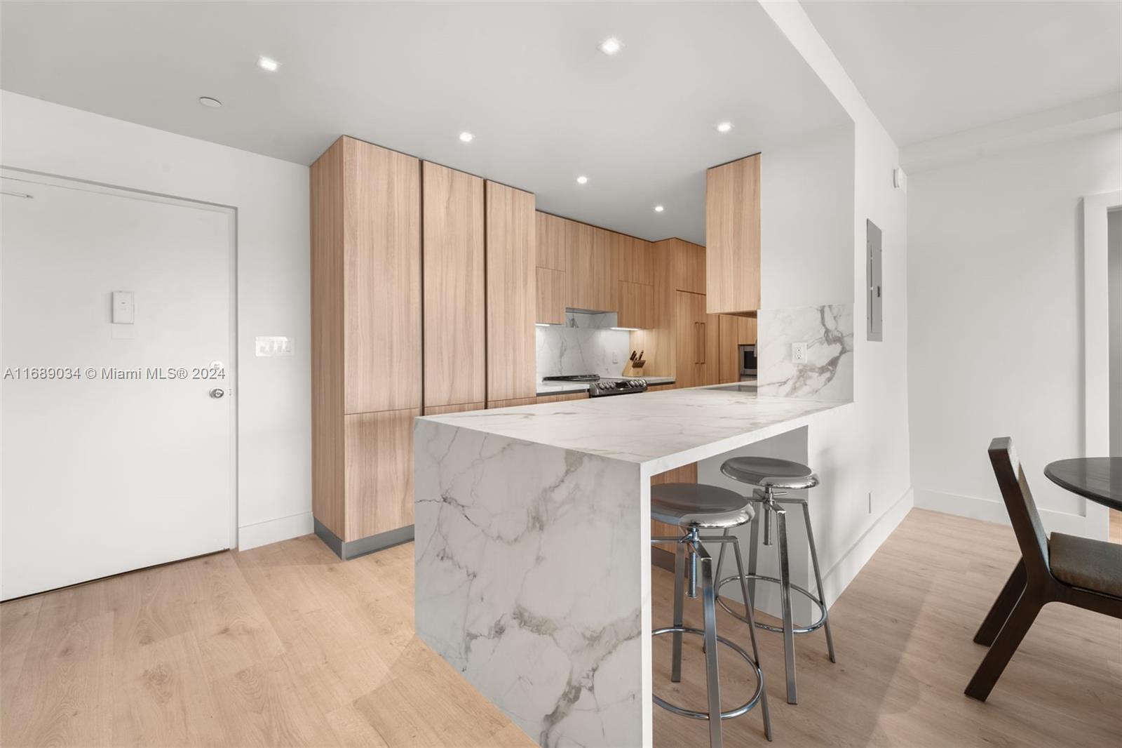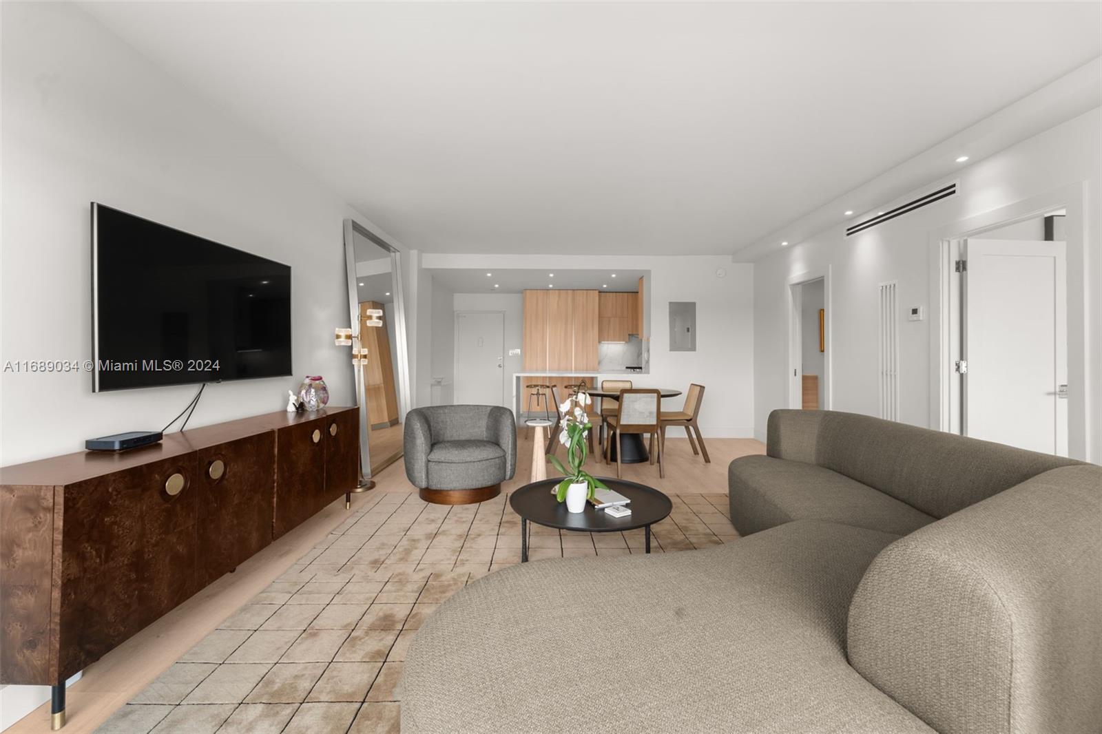 Presenting 3 Island Ave 5F on Belle Isle—an "Architectural Digest" quality renovation with no detail overlooked. This exquisite 1 bedroom, 1.5 bath residence boasts sweeping views of Biscayne Bay. The custom-designed kitchen features sleek Italian cabinetry and top-of-the-line appliances, including a Fisher Paykel refrigerator and wine cooler. The oversized terrace, framed by brand-new impact windows, showcases breathtaking bay views. Located in a mid-century modern gem, this building was designed by renowned architect Morris Lapidus, making this home a perfect blend of luxury, style, and timeless design