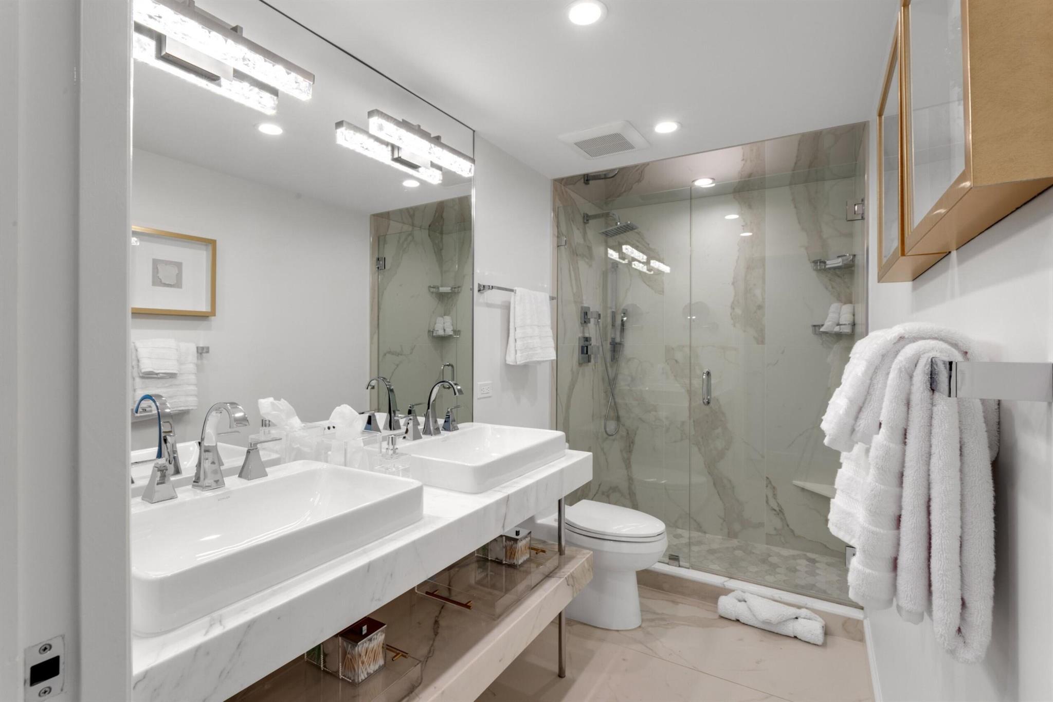 Enjoy unimpeded water and sunset views from this 2BR/2BA first floor corner unit with an open living concept design. This gorgeous home was recently completely gutted and rebuilt with impact floor to ceiling windows and doors in every room, new kitchen, new baths, new coral tile floors, and new hide-a-way Bluetooth blinds throughout. Exquisite finishes include Gracie hand painted wallpaper, elegant kitchen with under-lit counters & top of the line all new Thermador appliances plus marble bathrooms with custom floating vanities. Villa Serein condo complex living uniquely boutique with only 2 stories high and 8 units. Sold beautifully furnished right down to the dishes, flatware, pots, pans and bed linens too! All brand new.