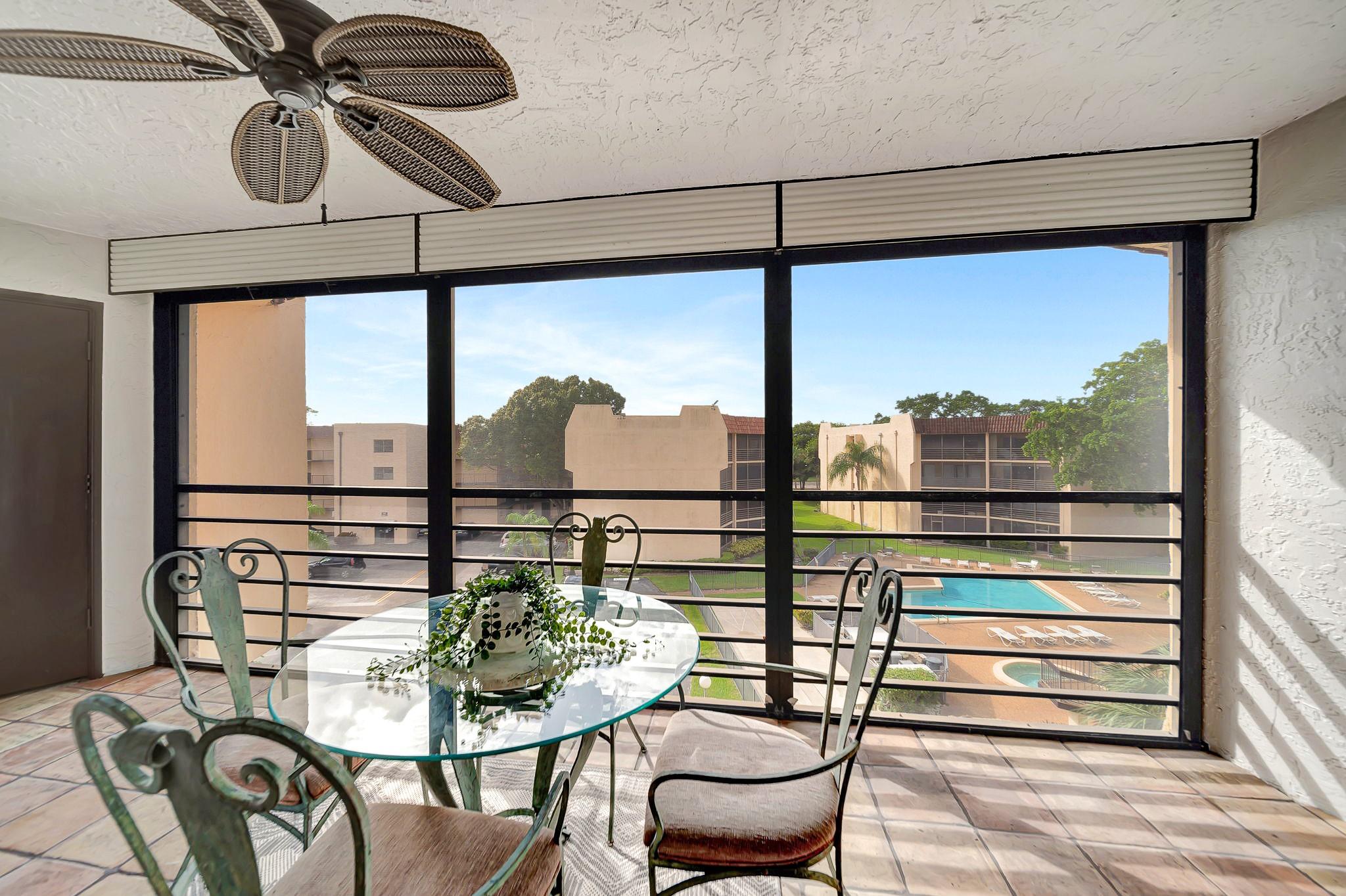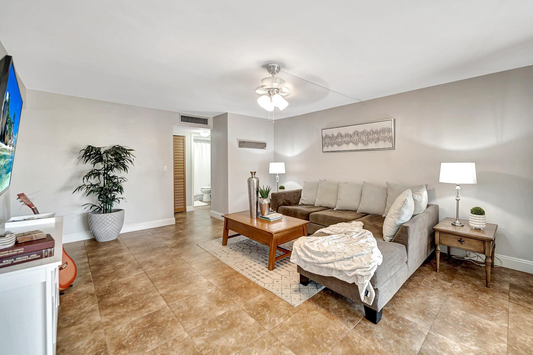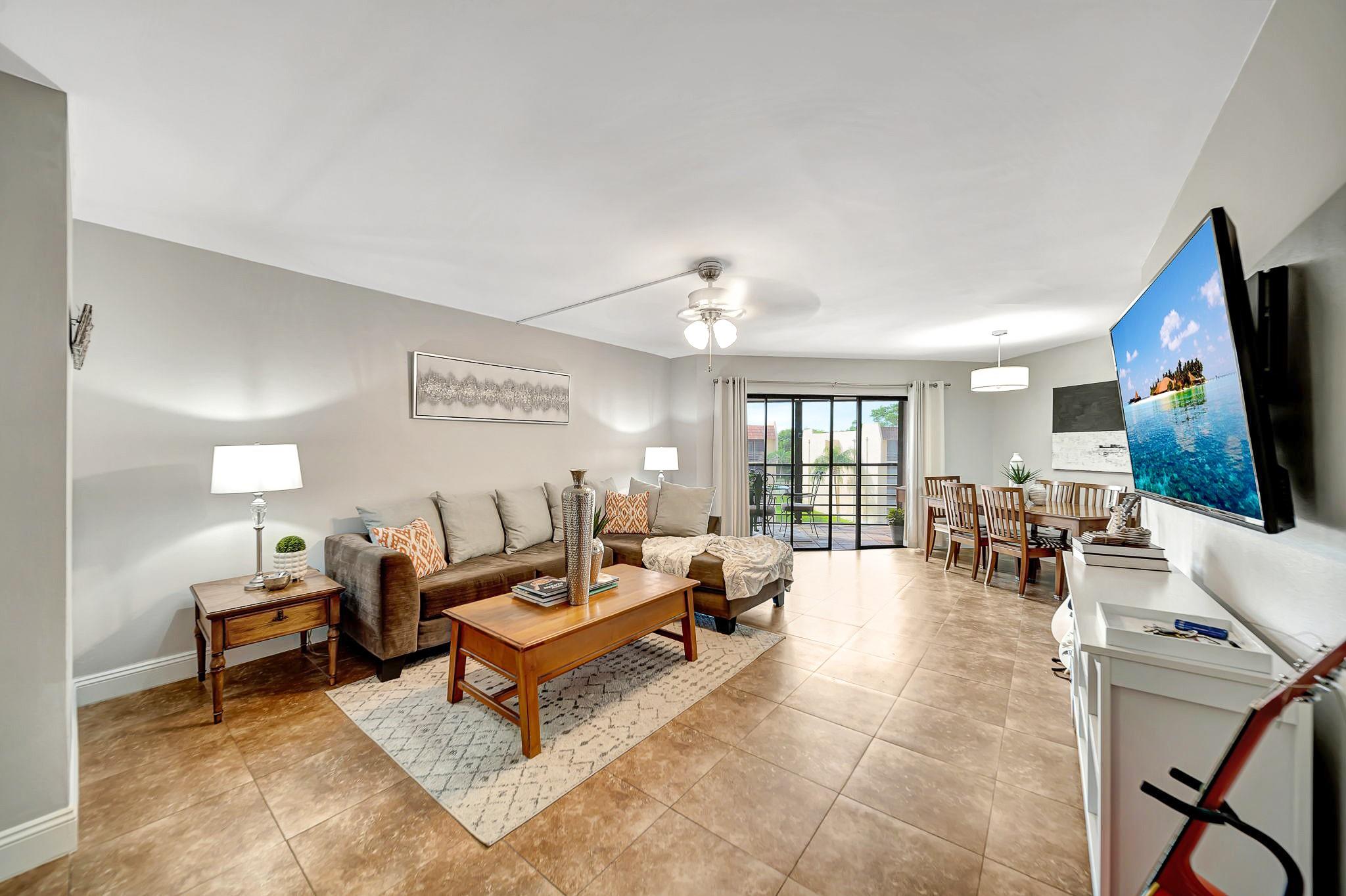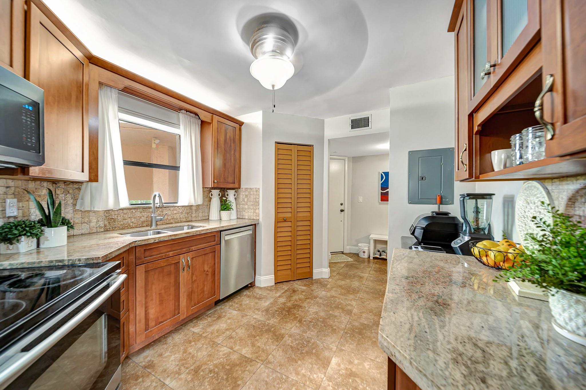 ABSOLUTELY STUNNING TURNKEY 2-bedroom 2 bath condo located in the heart of Plantation. This unit features: a spacious living room flowing into the formal dining area which leads into a spacious kitchen with natural wood cabinetry and a large pantry. Aesthetically pleasing kitchen features: granite countertop with matching backsplash and well-maintained stainless appliances. The split bedroom plan with guest bathroom, allows for great privacy. The oversize primary suite features a large walk-in closet with additional closet. This large primary suite has sliding glass doors that lead out to the screened patio overlooking the pool area. Patio is large enough to entertain your guests for a dinner, yet cozy enough to have have your coffee, or cocktails. Extra storage room on the patio.