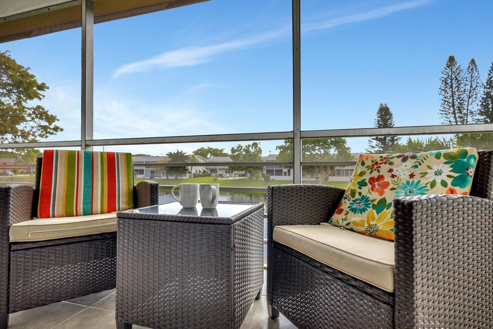 Enjoy uour morning coffee in this peaceful water view in the florida room. Fully furnished, turn key with brand new furniture, including a murphy bed for guests. Cul de sac building, steps to the pool and very close to the fitness center and amenities. Tile floor, 2 AC units, hurricane shutters in the front and in the back. Enjoy buses to go to the clubhouse, watch entertainement at the theater, card games, billar rooms, bungo, music, library, yoga, pilates and dance classes. Also pratice your favorite sports: tennis, pickleball, bocce ball, sailboat rentals, shuffleboard. This is a very safe 55 and plus community with gards at the gate. Close to shopping centers, restaurants and medical facilities. Move in ready ! Easy to show !