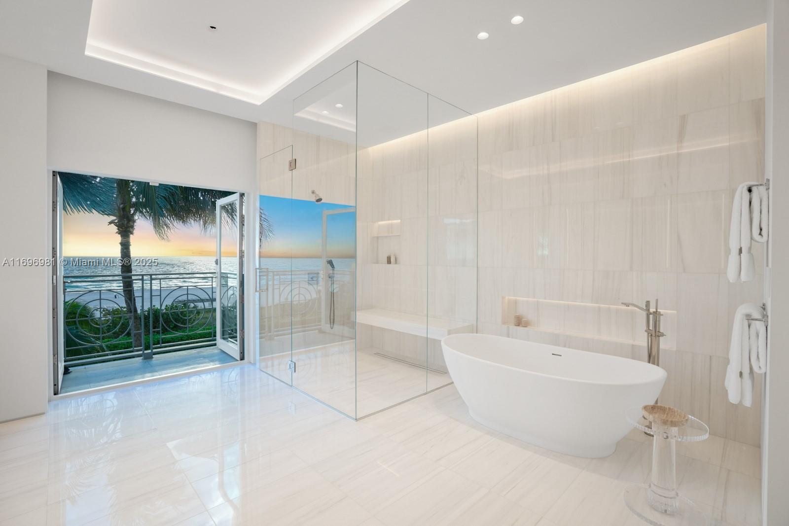 Step Inside With Me! This immaculate Beach House is a rare opportunity to own an oceanfront home at the esteemed Bath Club. Completely reconstructed in 2024 with interiors by Deborah Wecselman, its appx 6,100SF of sophisticated spaces are defined by Italian millwork, honed marble floors, specialty doors, tray ceilings, & architectural staircase. The 21' ceiling foyer unfolds to an oceanfront lounge with panoramic views and access to the private pool. The minimalist modern kitchen features Bon Vivant cabinets, sleek central island, and breakfast area while formal dining is partitioned by a custom milled pocket door. The primary is a chic retreat with oak flooring, spa-like bath & impressive dressing room. Plus: top floor study, elevator & discreet garage entry. Presented turnkey/furnished.