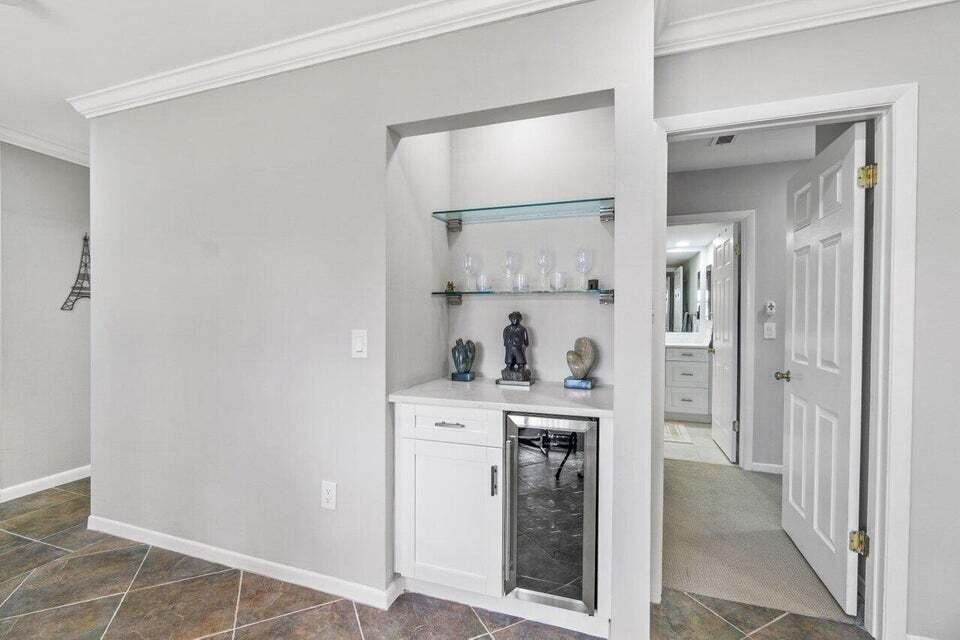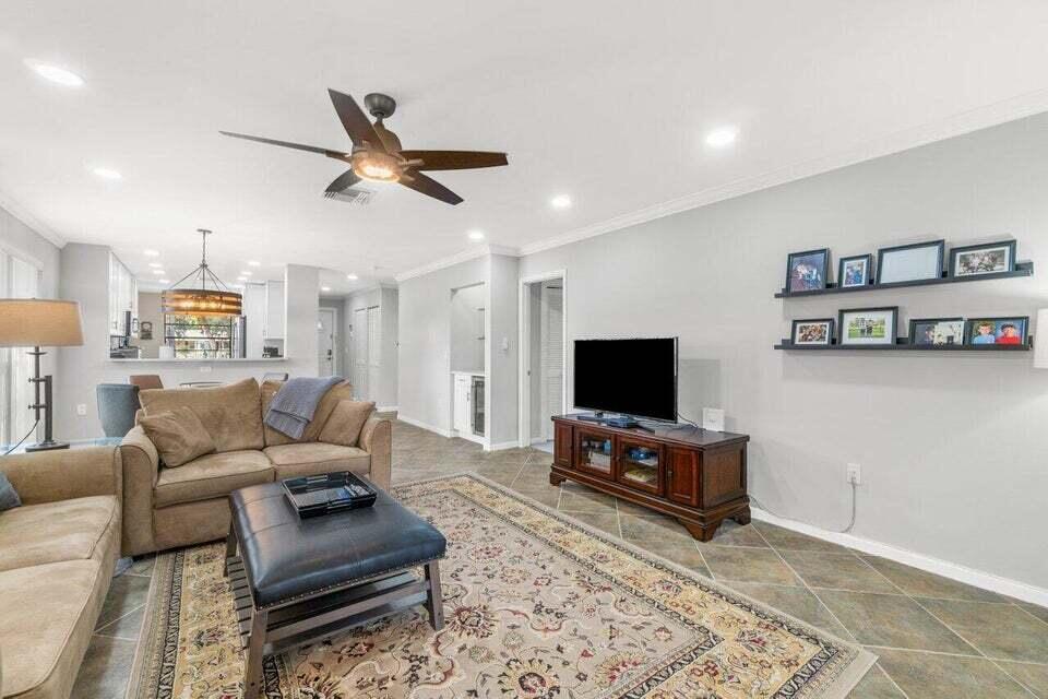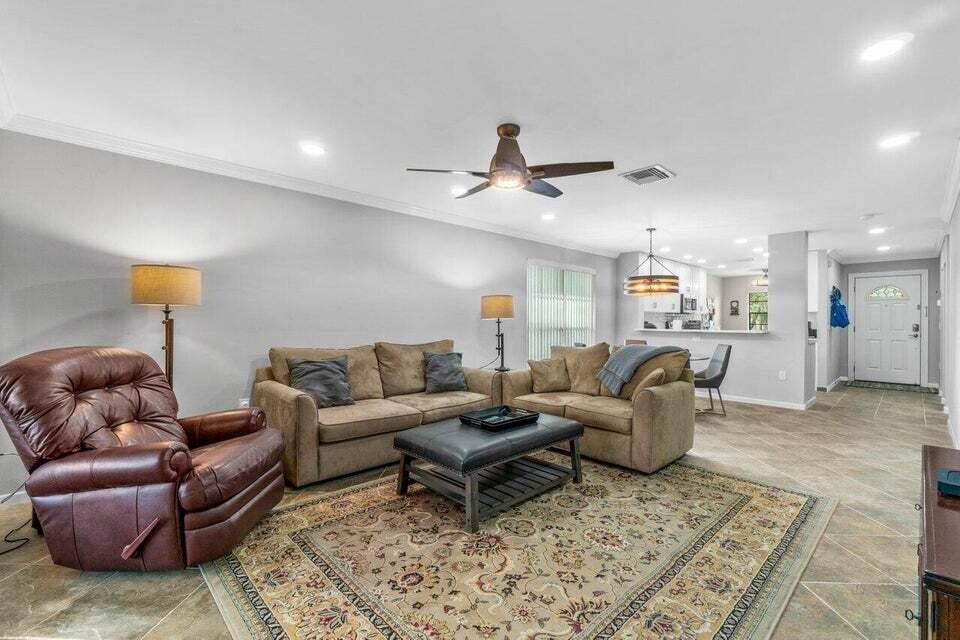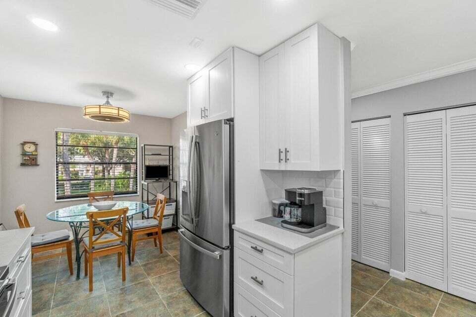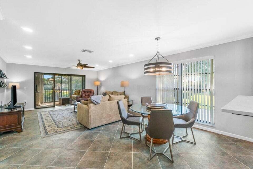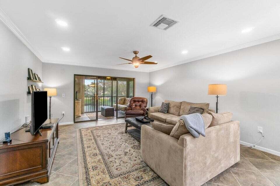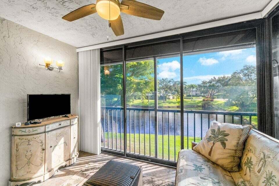 Experience the epitome of modern elegance in this fully remodeled 2nd Fl corner condo. This residence boasts contemporary finishes, and captivating lake view. The living area features sleek slate flooring, and luxurious carpet in the bedrooms. LED lighting & crown molding for a polished touch ( No POPCORN here). Open concept gourmet kitchen stainless appliances, quartz counters. Enjoy the versatile glass enclosed Florida Room ( conv. screened porch), perfect for relaxing /entertaining. This Fabulous condo combines sophistication, comfort, & vibrant lifestyle the Hunters Run Country Club offers.
