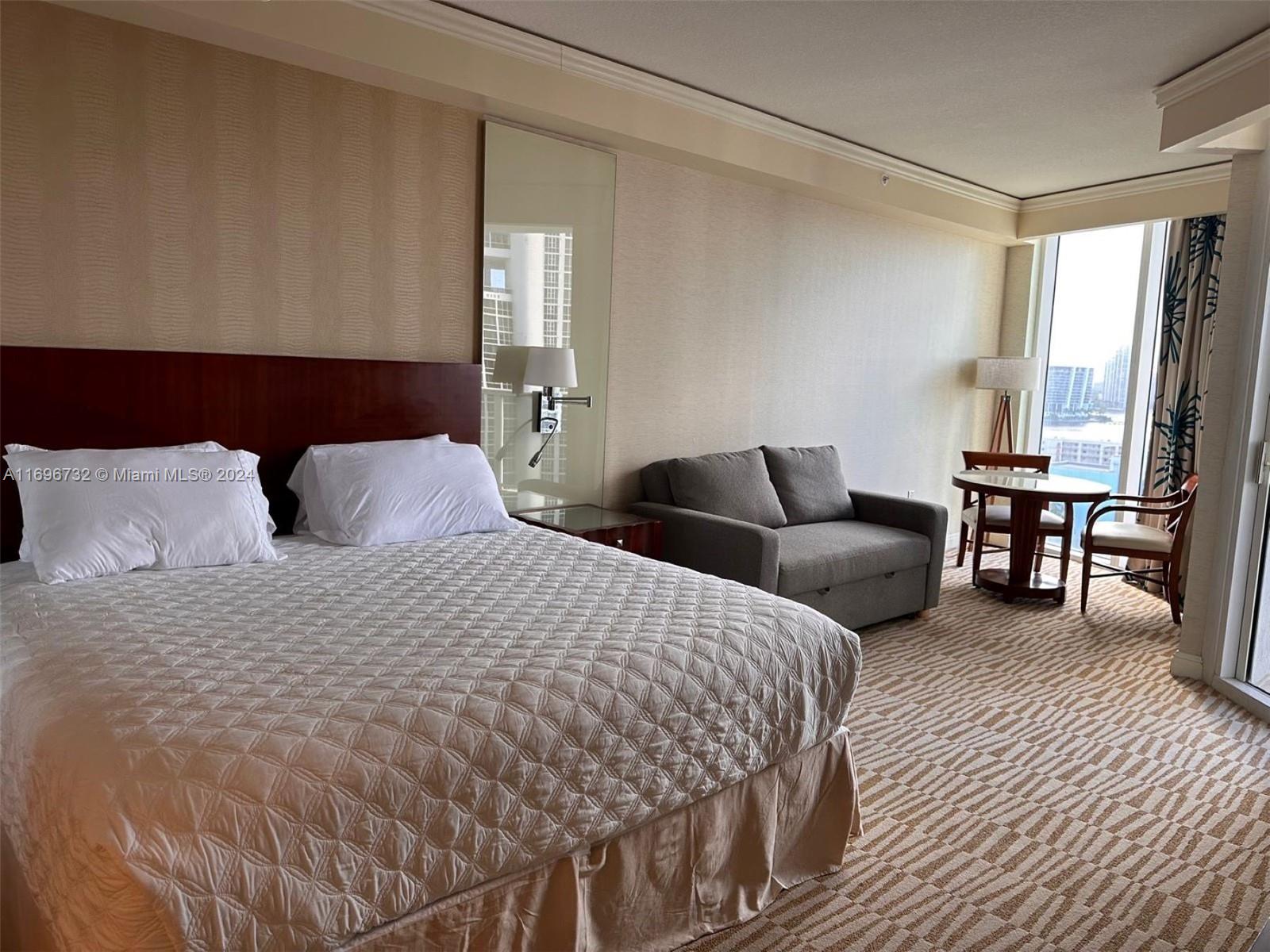 Cozy furnished studio with a partial ocean view, located at TRUMP INTERNATIONAL BEACH RESORT, nestled on one of Miami's premier beaches and conveniently close to Aventura Mall, South Beach, and amazing restaurants. The studio features a king-size bed, sofa bed, kitchenette, dining table, and workstation. The resort offers outstanding amenities, including two pools, four restaurants, a tennis court, daily kids’ entertainment, a renovated lobby, a gym, a spa, and more. It can be rented daily, either privately or through the hotel rental program. Please contact the listing agent for more information regarding the private rental program.