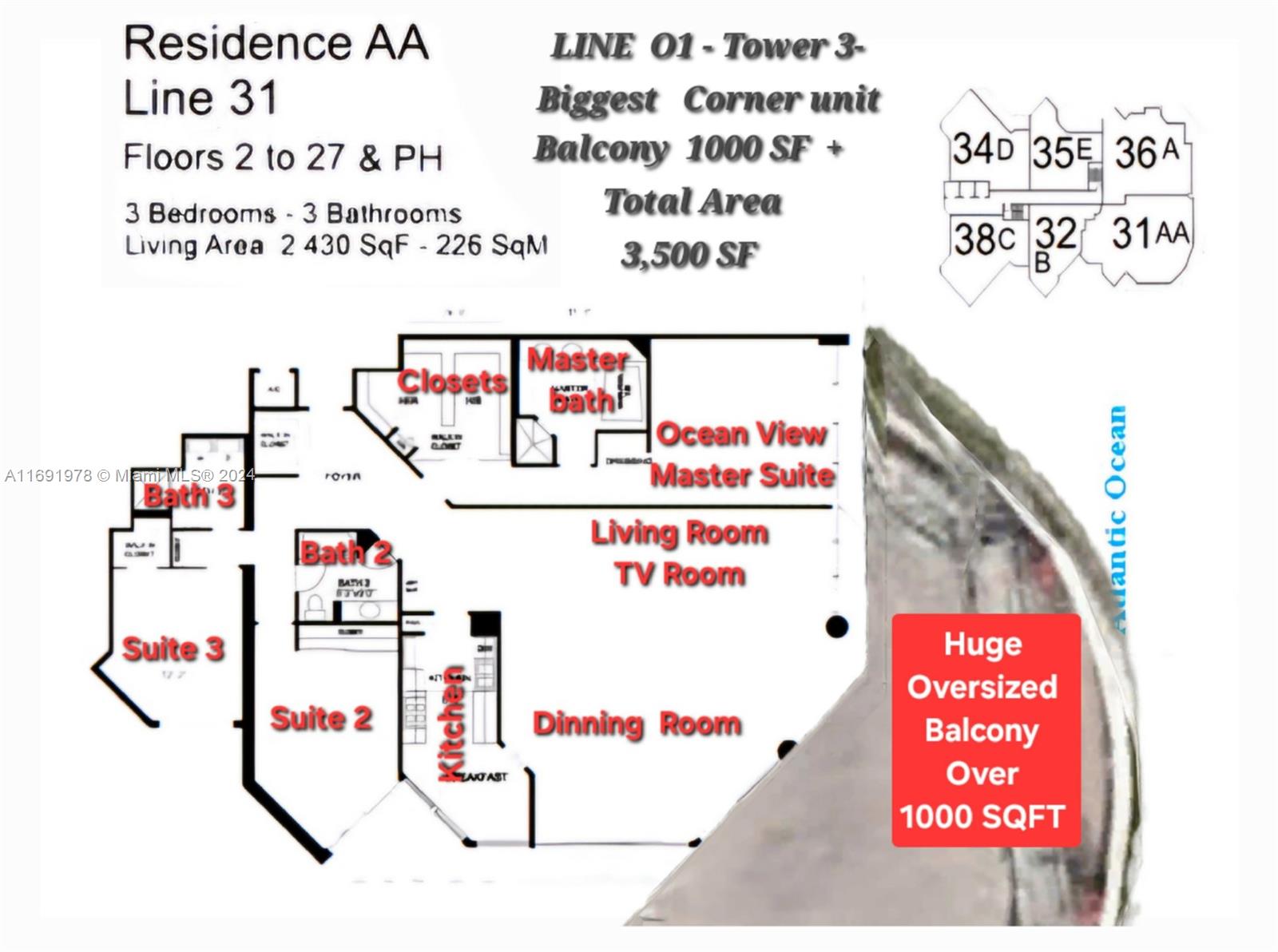 The best priced unit with 3 Bedroom, direct ocean view and over 2000 SQFT, Oceania III-431- Line 01 in Renovated Building- in a Luxurious Condo in Sunny Isles Beach. Experience unparalleled elegance in this stunning 3-bedroom, 3-bathroom, extra large balcony, over 1000 SQFT, Making this total area unit over 3,500 SF. Boasting breathtaking direct ocean views, an open living area, and floor-to-ceiling windows in every room, this spacious and bright unit is designed for comfort and style. The split floor plan offers privacy, while the building’s exceptional amenities include a full-service private beach club, pet-friendly policy.