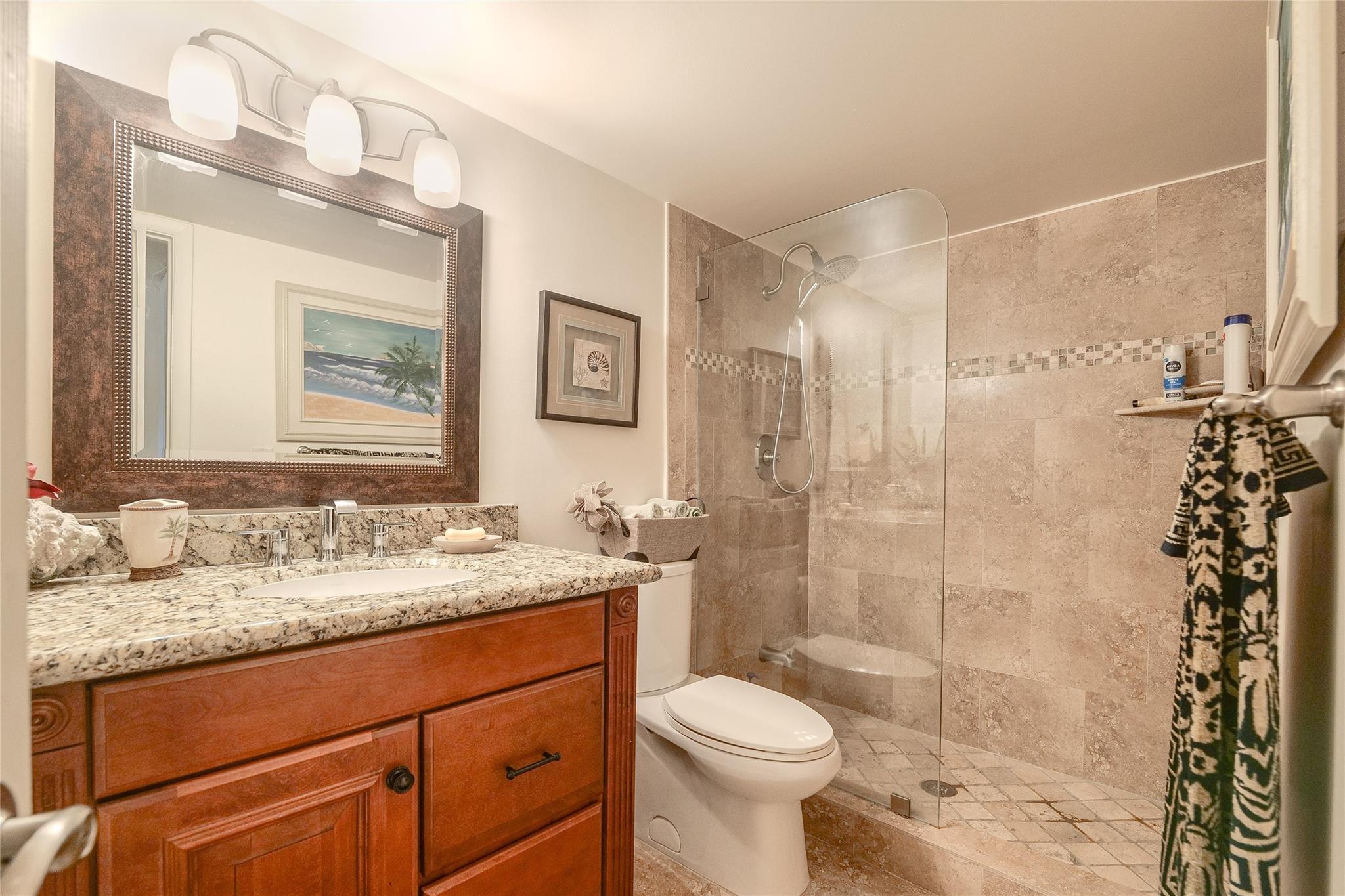 Reduced! Completely renovated! Large! Spacious! With 2 terraces! One with view on pool and one on small lakes and lawns, with roll shades! Washer & dryer in unit! Kitchen boasts granite & stainless steel appliances. Both bathrooms remodeled too! Sold partially furnished! Neutral tiles & laminate floors! impact hurricane windows! Lakes of Environ is well-maintained with new roof, elevator, new paint; new keyless entry security system; new heated pool, new pool furniture, newly sealed parking lot with many guest parking spaces. No pending special assessments. State inspections done! Included in maint: pest control, internet & cable TV, & Cultural Center offers: fitness center, billiard room, bowling alley, tennis court, pickleball courts, BBQ areas. heated pools, activities & more!