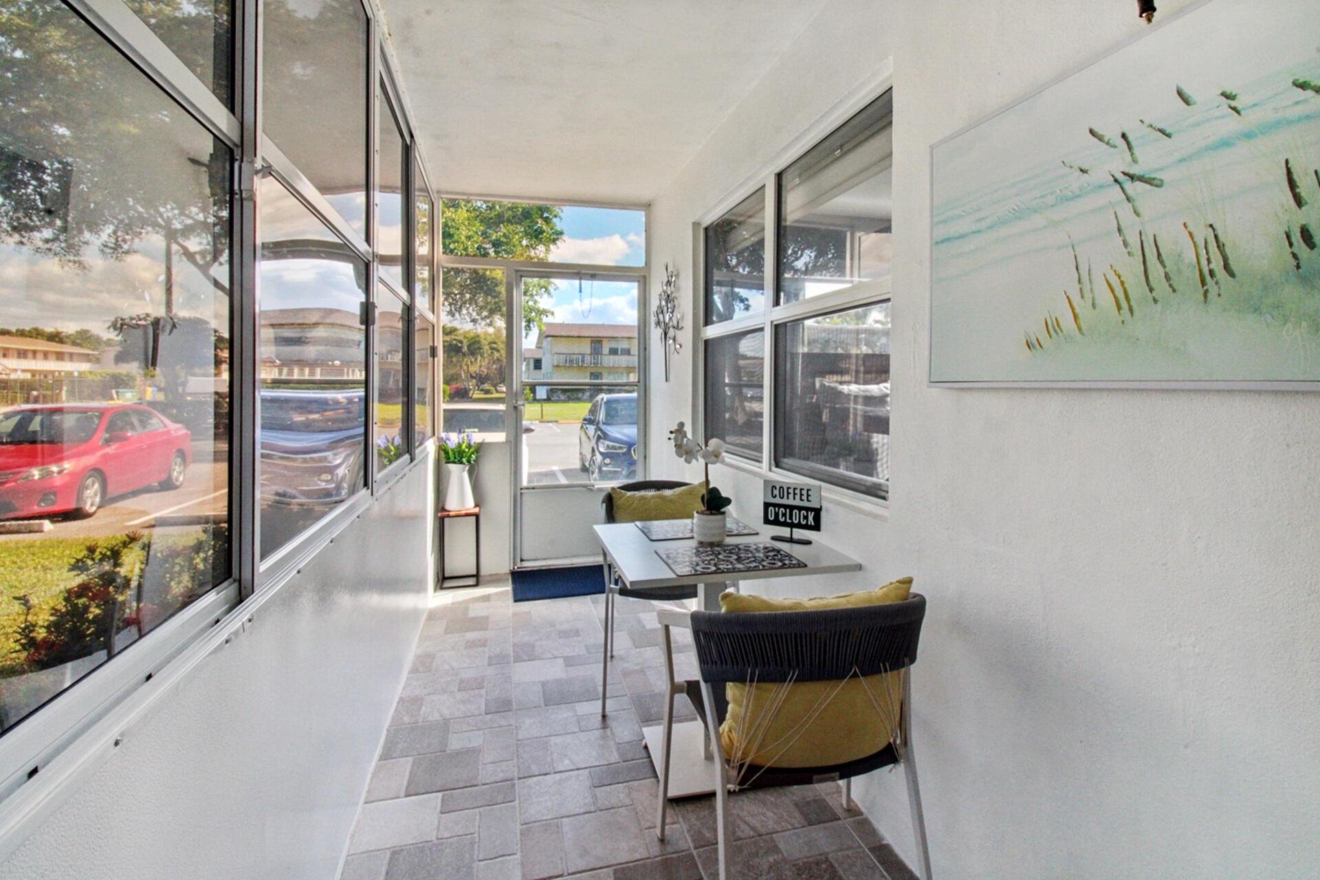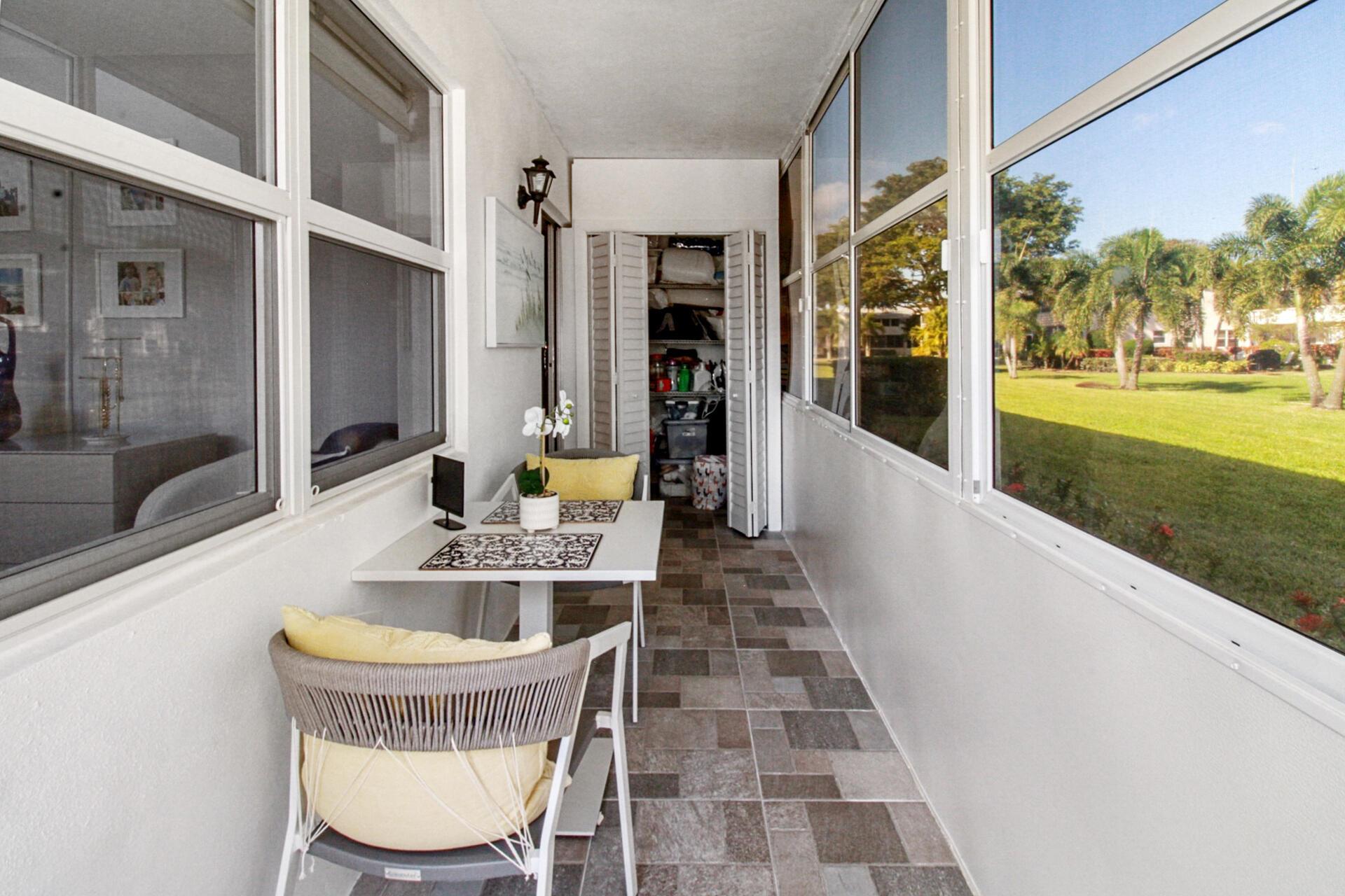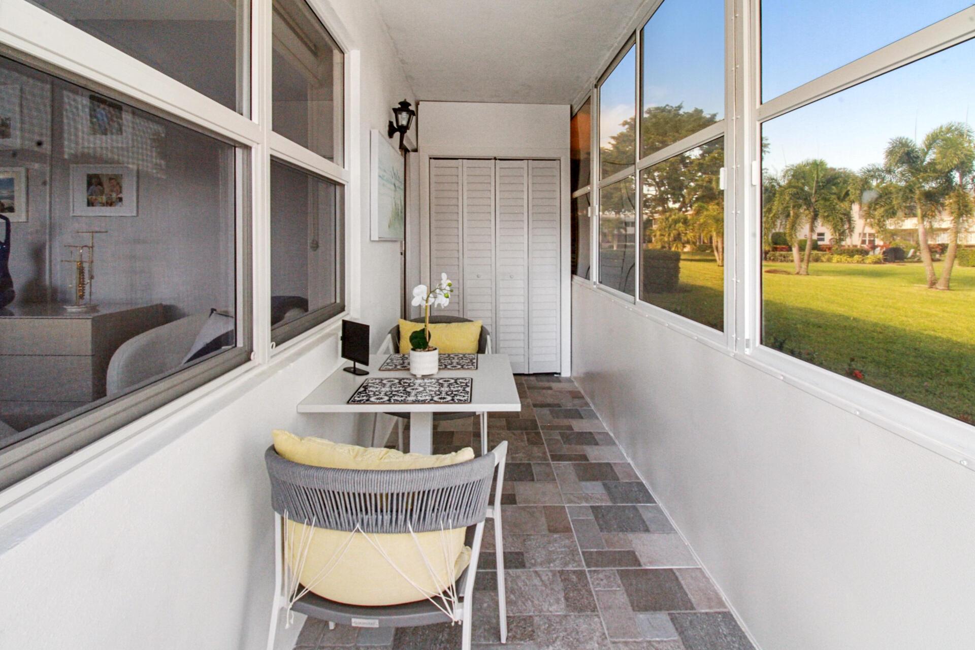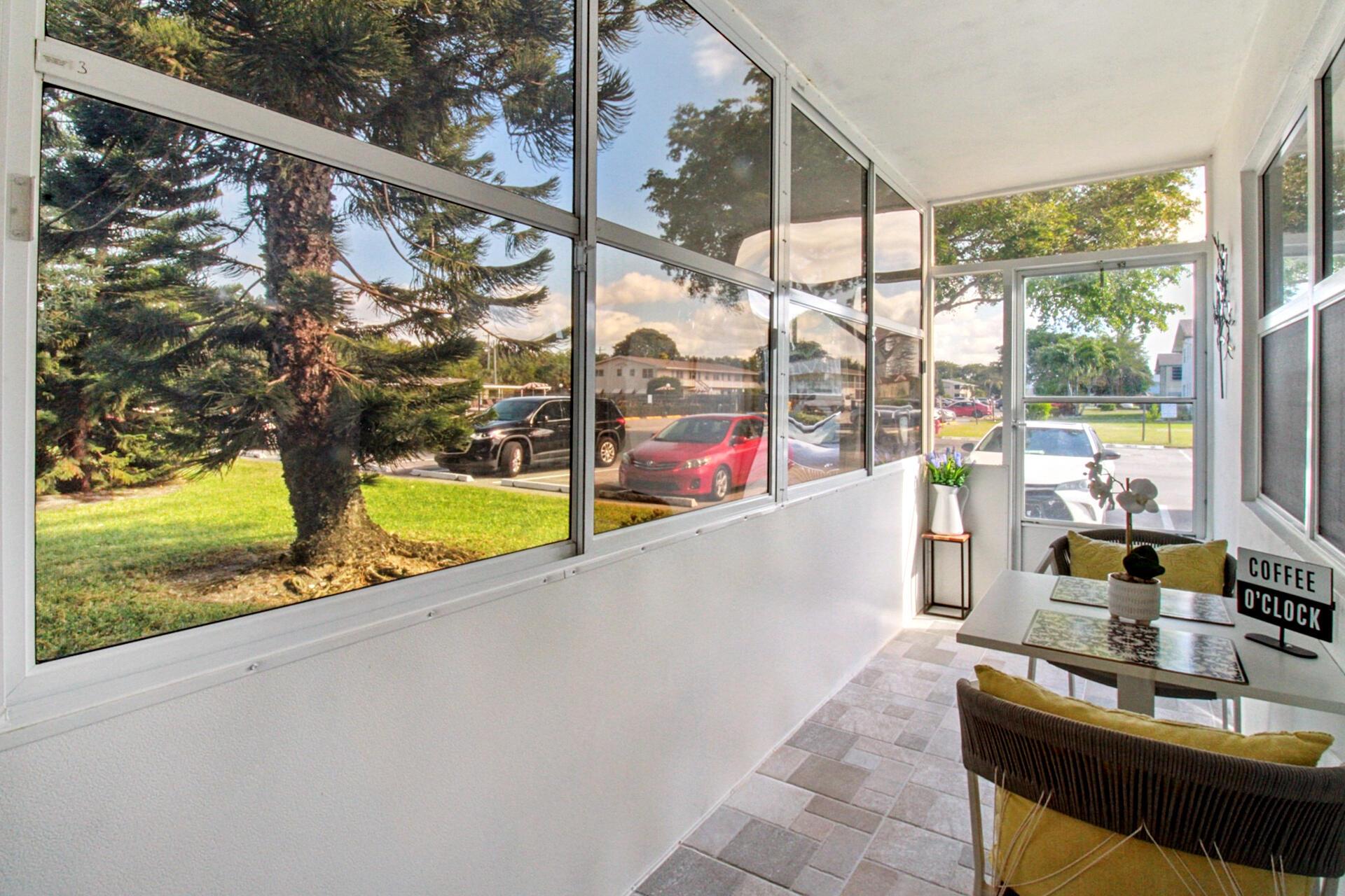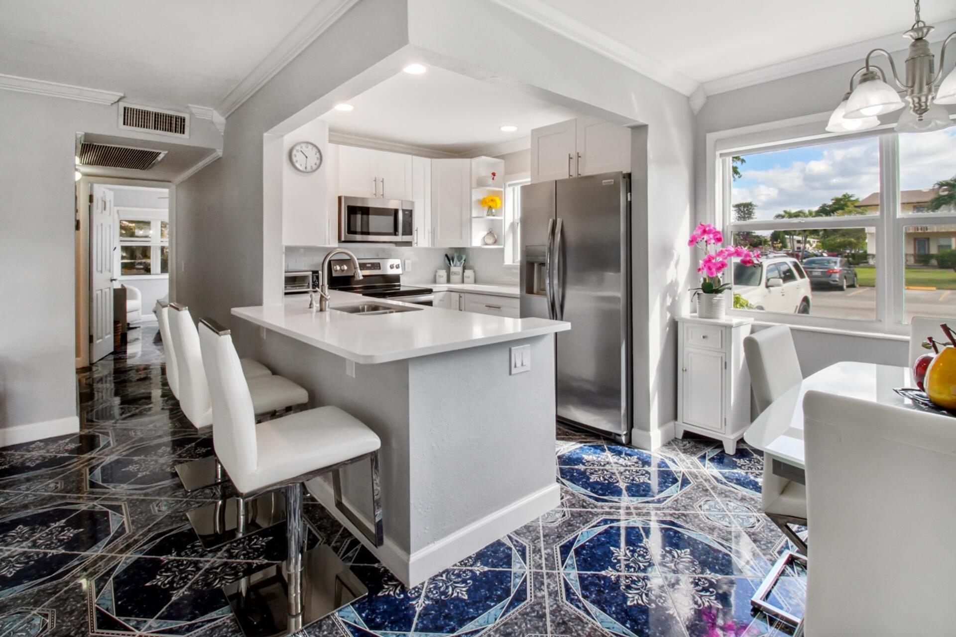 Sophisticated and elegant 1st floor corner unit with a functional and stylish layout. This condo includes 2 beds, 2 fully-renovated full-baths, Open-concept Kitchen, Stainless Steel Appliances, Custom-build Cabinetry, Italian porcelain tile throughout, Impact windows. Beautiful enclosure porch with extra-storage. Freshly painted, Roof 2024. Furnishing negotiable. Century Village is 55+ Community, 13 pools, Clubhouse, fitness center, library, activity rooms, indoor pool, sauna, pickleball, tennis, and many more. Free community and local buses! 24-hour security and manned entrances. 1 mile away from FL Turnpike and 4 miles away from I-95. Very close to PBI airport.