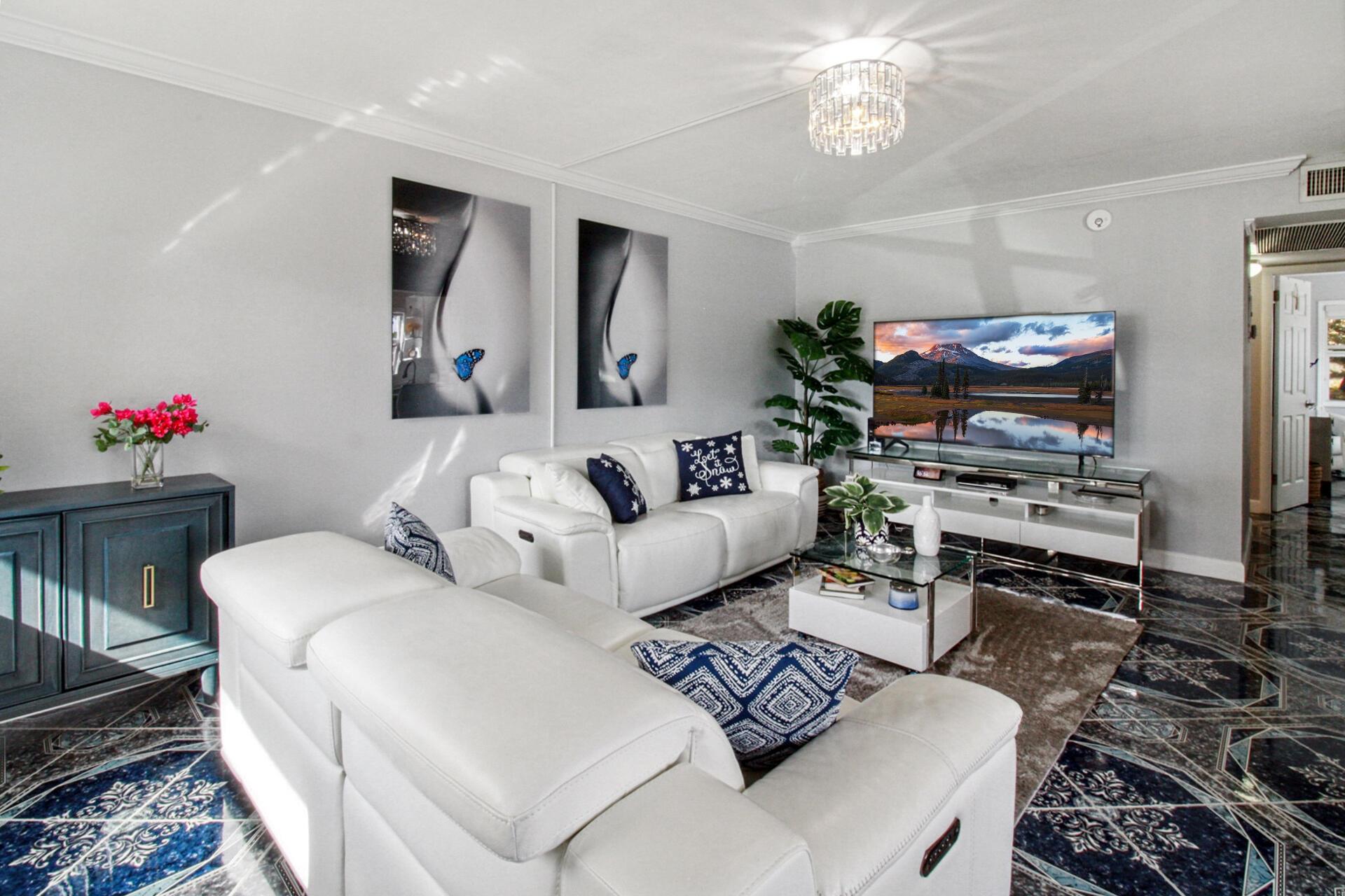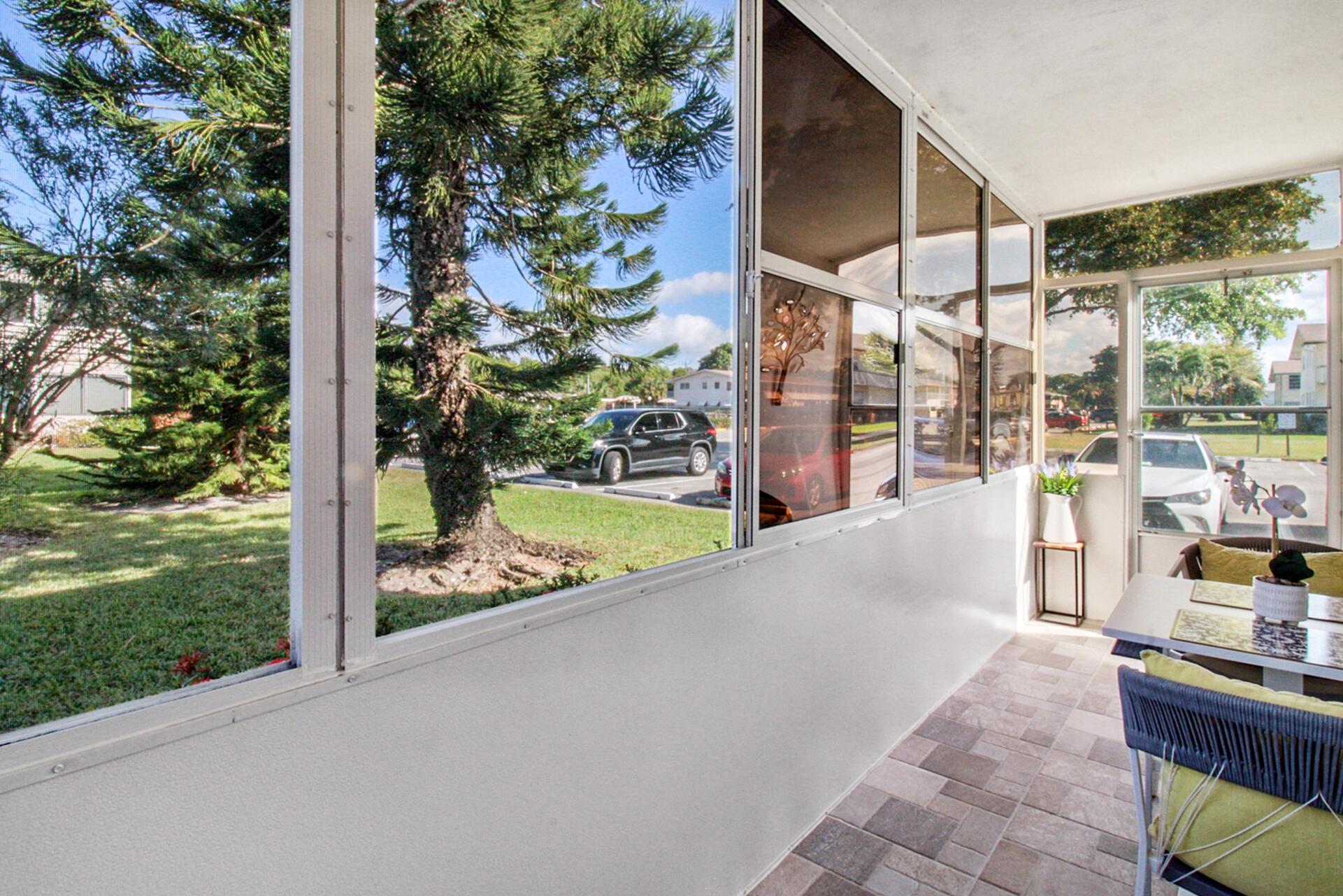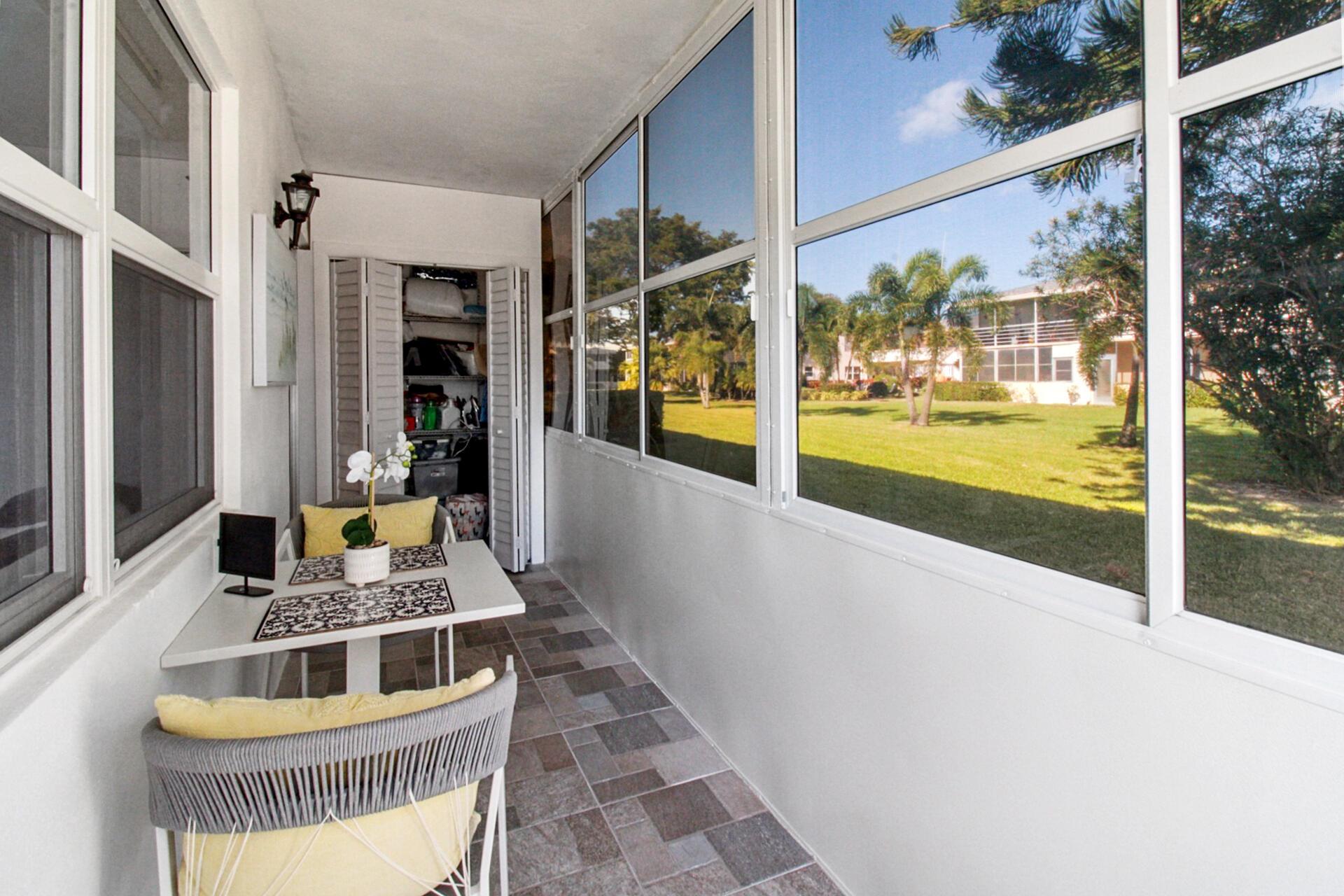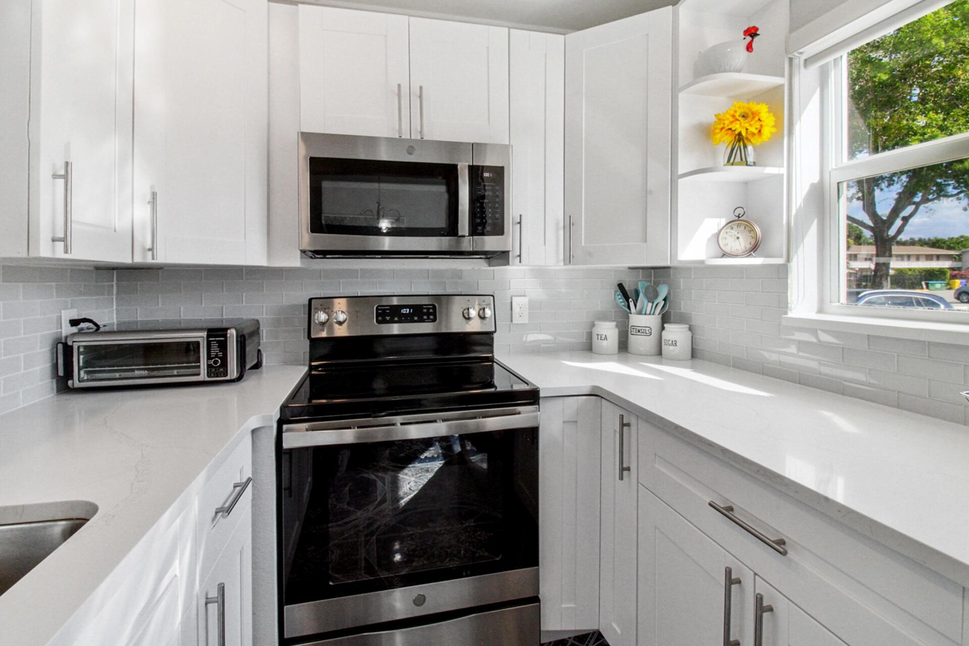 Sophisticated and elegant 1st floor corner unit with a functional and stylish layout. This condo includes 2 beds, 2 fully-renovated full-baths, Open-concept Kitchen, Stainless Steel Appliances, Custom-build Cabinetry, Italian porcelain tile throughout, Impact windows. Beautiful enclosure porch with extra-storage. Freshly painted, Roof 2024. Furnishing negotiable. Century Village is 55+ Community, 13 pools, Clubhouse, fitness center, library, activity rooms, indoor pool, sauna, pickleball, tennis, and many more. Free community and local buses! 24-hour security and manned entrances. 1 mile away from FL Turnpike and 4 miles away from I-95. Very close to PBI airport.