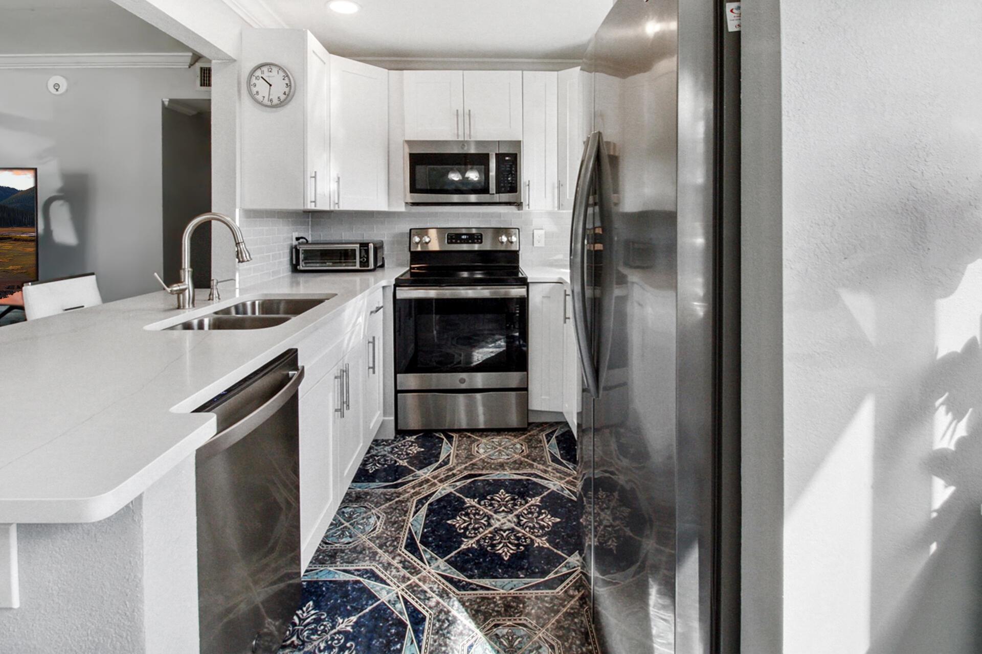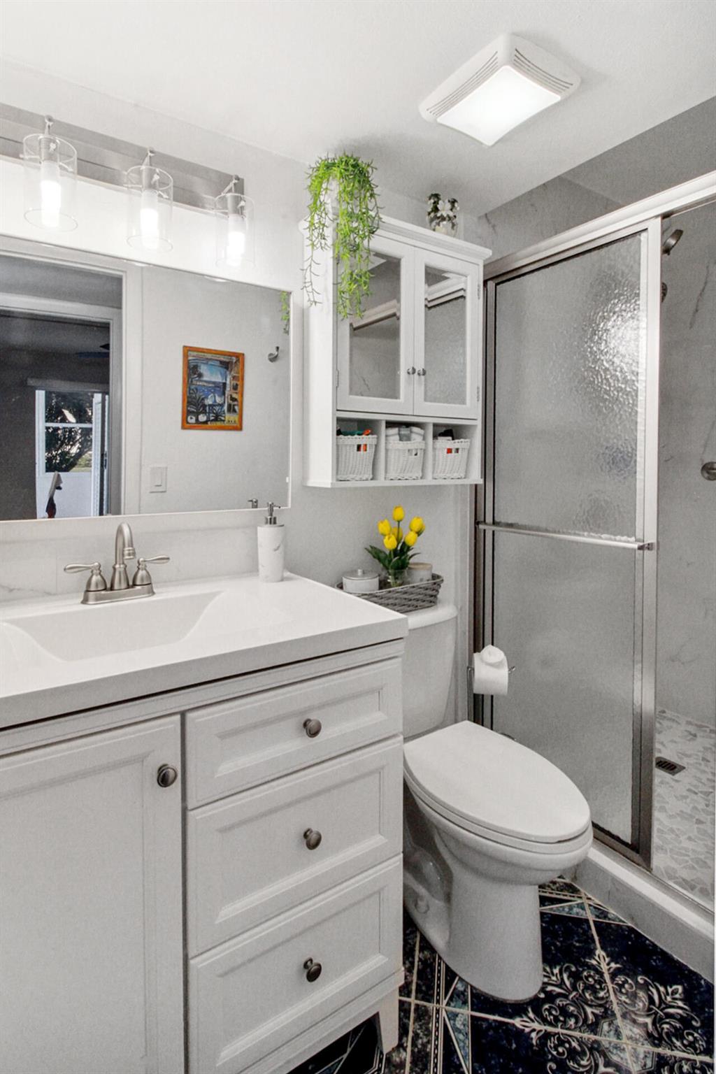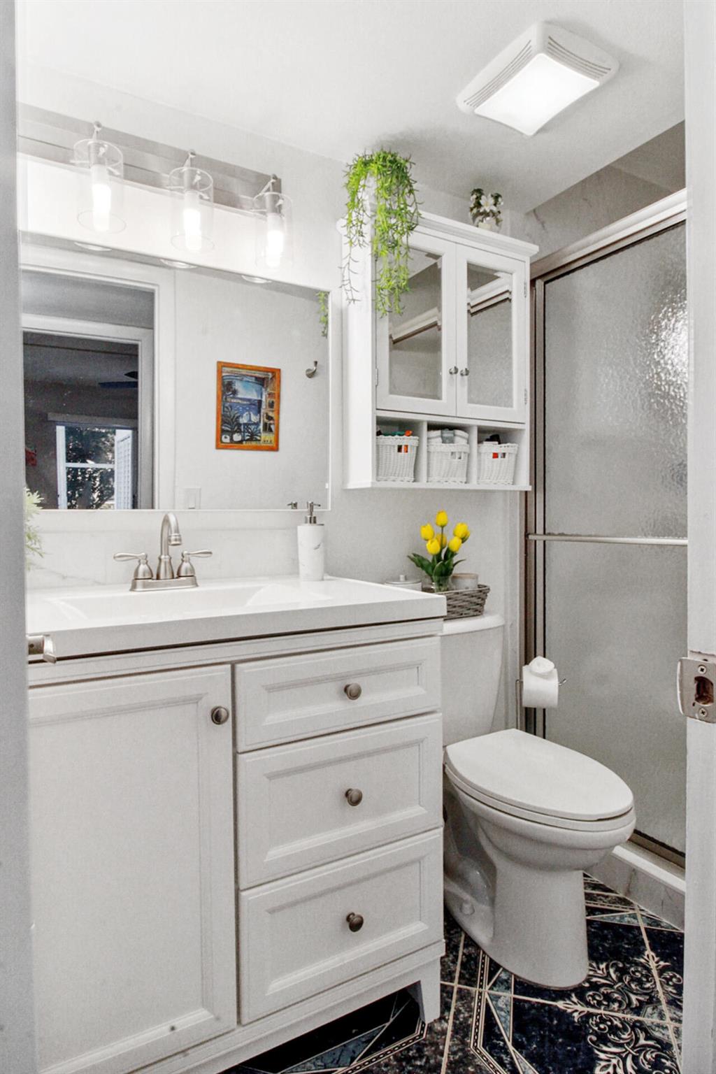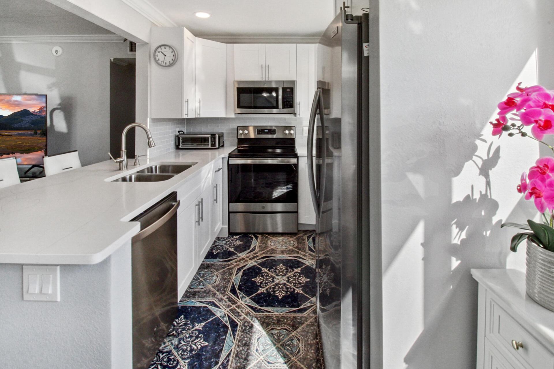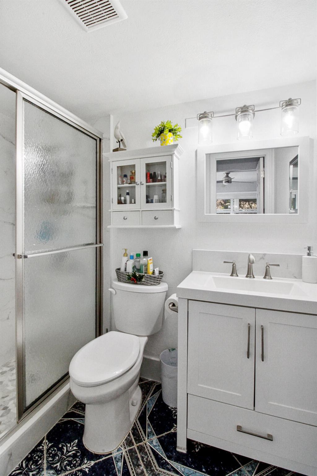 Sophisticated and elegant 1st floor corner unit with a functional and stylish layout. This condo includes 2 beds, 2 fully-renovated full-baths, Open-concept Kitchen, Stainless Steel Appliances, Custom-build Cabinetry, Italian porcelain tile throughout, Impact windows. Beautiful enclosure porch with extra-storage. Freshly painted, Roof 2024. Furnishing negotiable. Century Village is 55+ Community, 13 pools, Clubhouse, fitness center, library, activity rooms, indoor pool, sauna, pickleball, tennis, and many more. Free community and local buses! 24-hour security and manned entrances. 1 mile away from FL Turnpike and 4 miles away from I-95. Very close to PBI airport.