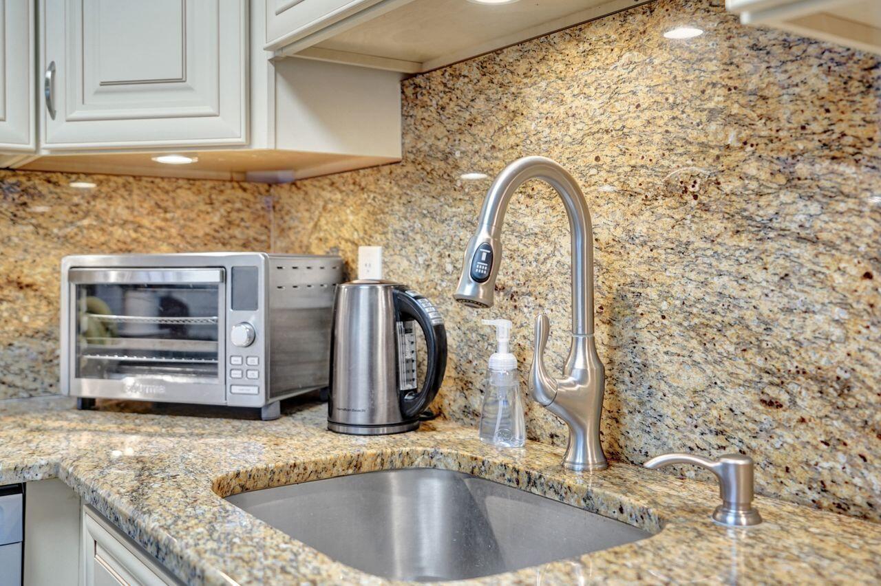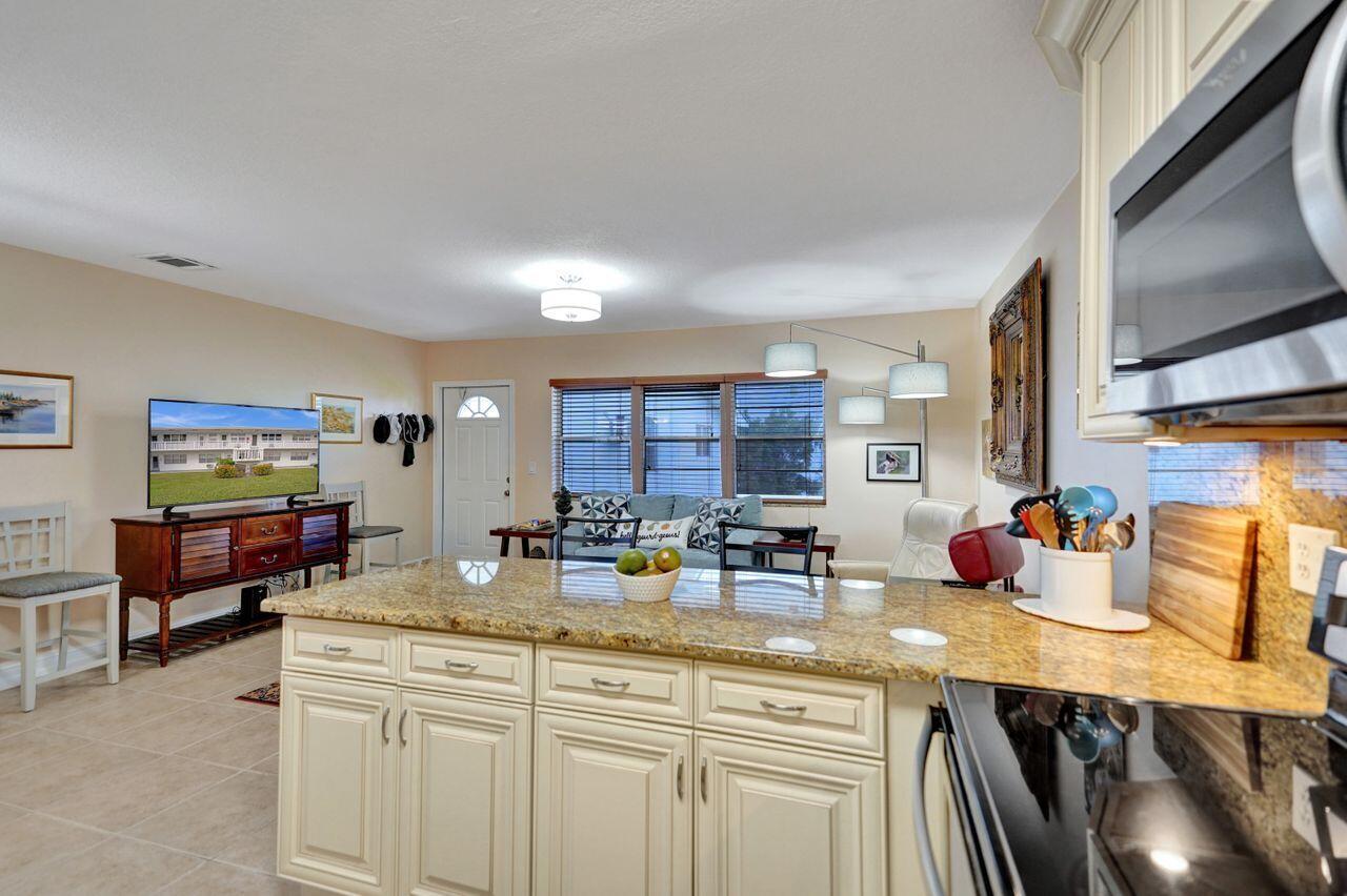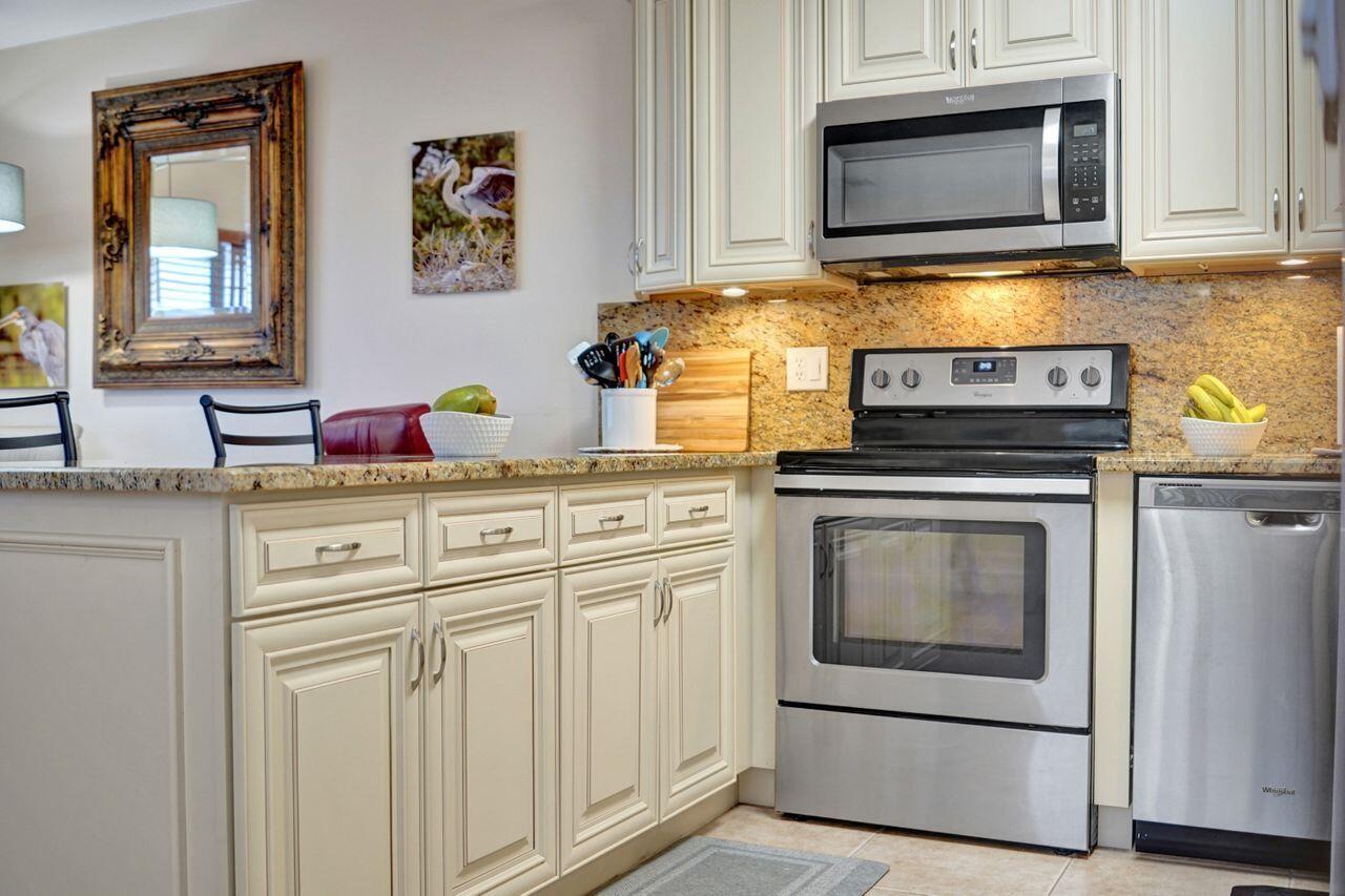 Your slice of paradise awaits with this IMMACULATE furnished renovated 1 BR 1.5 BA second-floor corner unit. Enjoy southern, eastern & northern exposures in this turnkey sanctuary with a peaceful garden view. This standout unit features CENTRAL AC (no AC wall units); OPEN KITCHEN; walk-in shower; tankless water heater; walk-in closet & enclosed patio. NEW kitchen features granite countertops, stainless appliances & custom lighting. Basic cable included in maintenance. NEW electric panel 2022; NEW ROOF 2023; NEW screens 2023. CONVENIENTLY LOCATED near Haverhill entrance & clubhouse! 1 assigned parking space & guest parking available. Gated/24 hr. security. All owner-occupied blg. (no renting). Century Village offers many activities - from tennis to bocce ball, you will have it all!