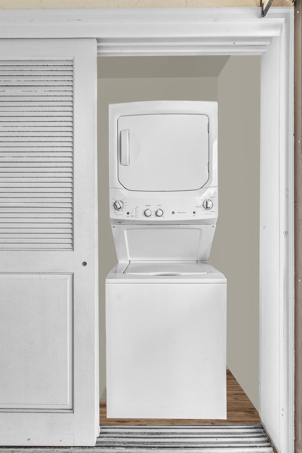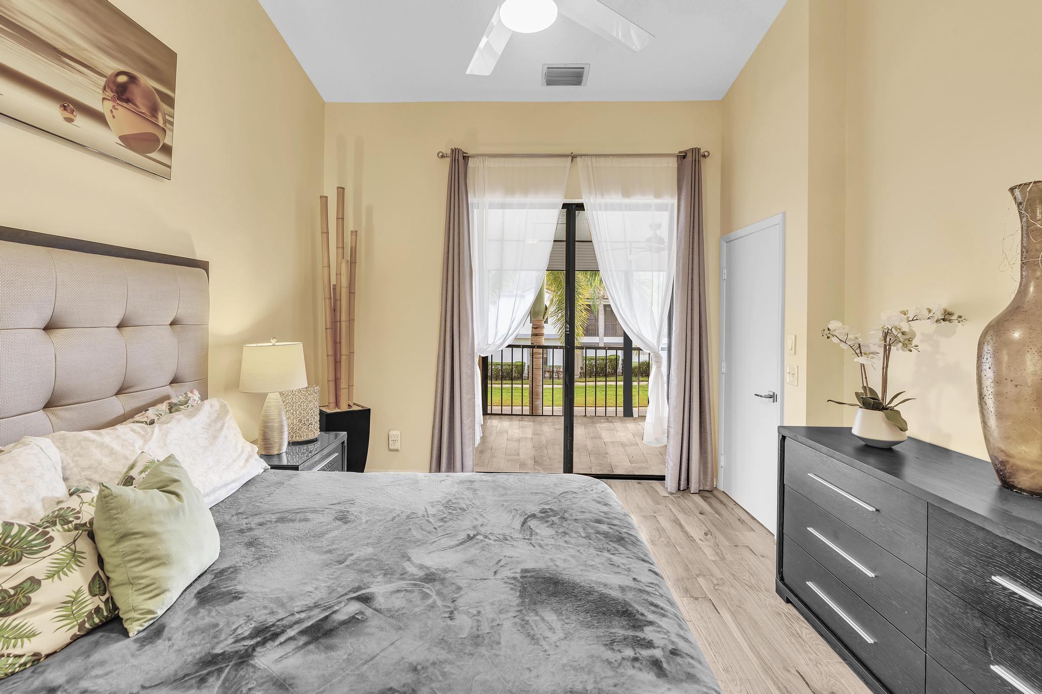 Welcome to this charming 2-bedroom, 2-bathroom second-floor unit, featuring a newer AC (2021), The home boasts stylish porcelain tiles, vinyl flooring in the bedrooms, and fresh paint with updated lighting and fans. Enjoy the convenience of an in-unit newer washer and dryer. Step outside to your private balcony, complete with newer screens and shutters, perfect for relaxation. Modern beautiful accent wall in the living room adding even more charm to this gorgeous property. Residents can take advantage of resort-style amenities, including a large pool, jacuzzi, and stunning views from a fully-equipped gym. This unit is perfect for those seeking comfort and convenience in a vibrant community! HOA fees paid quarterly.