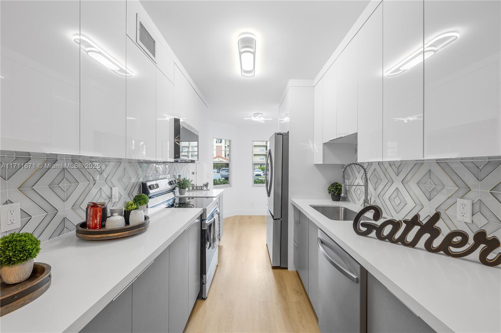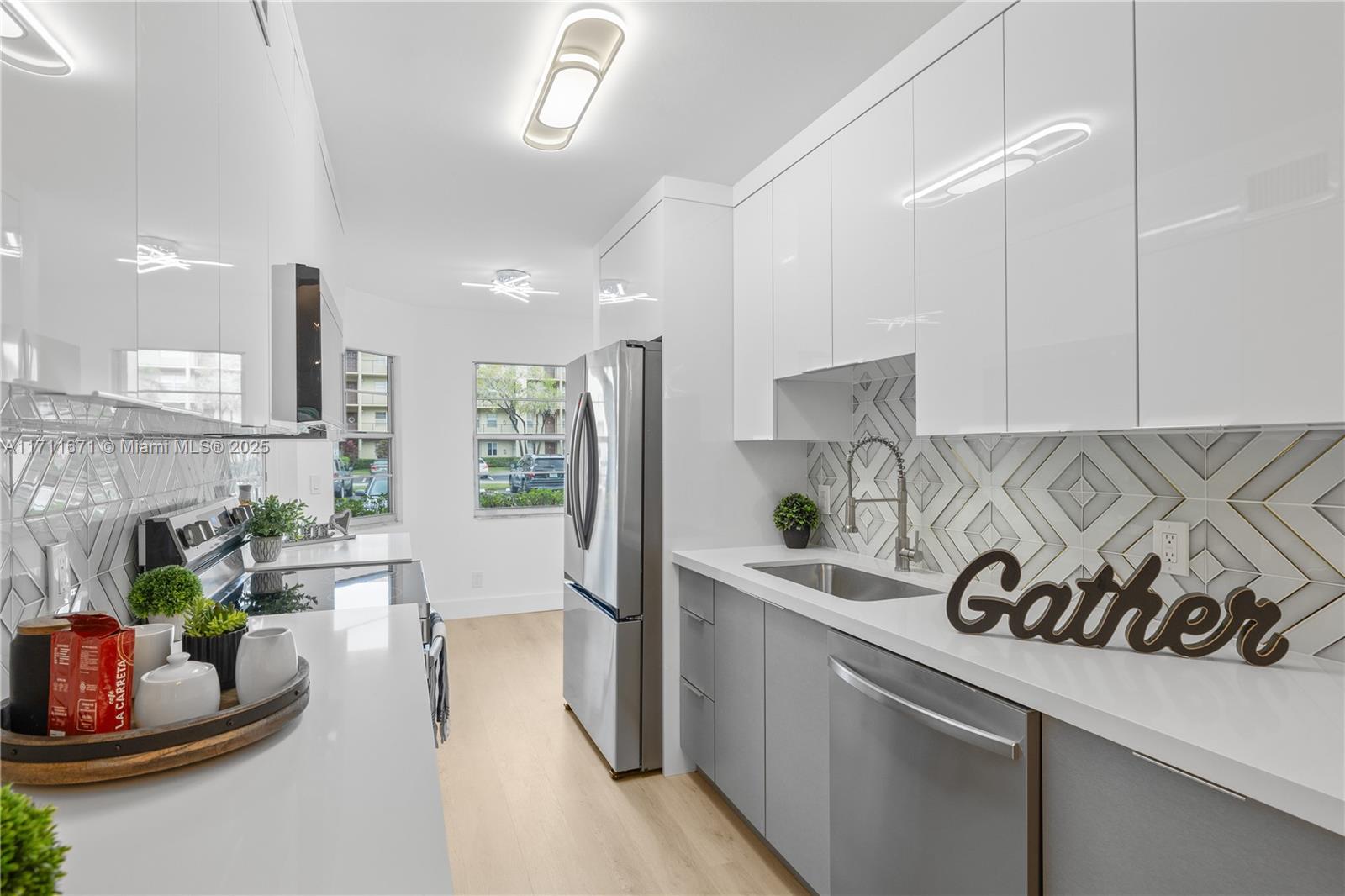 Charming Fully Remodeled Condo in Century Village, Pembroke Pines. First-floor, offering unparalleled convenience and modern elegance. Every detail has been thoughtfully updated to provide a luxurious living experience. The kitchen boasts sleek, modern cabinets that reach the ceiling, offering ample storage and a contemporary aesthetic. Brand new AC, Washer/Dryer. Stylish vinyl flooring, freshly painted, LED lighting. The bathrooms have been completely modernized. Accordion shutters. Located in Pembroke Pines, a vibrant 55+ community, residents enjoy a wealth of amenities including a golf course, swimming pools, fitness centers, and a bustling clubhouse with social activities. This condo offers easy access to shopping, dining, and entertainment, making it the perfect place to call home.