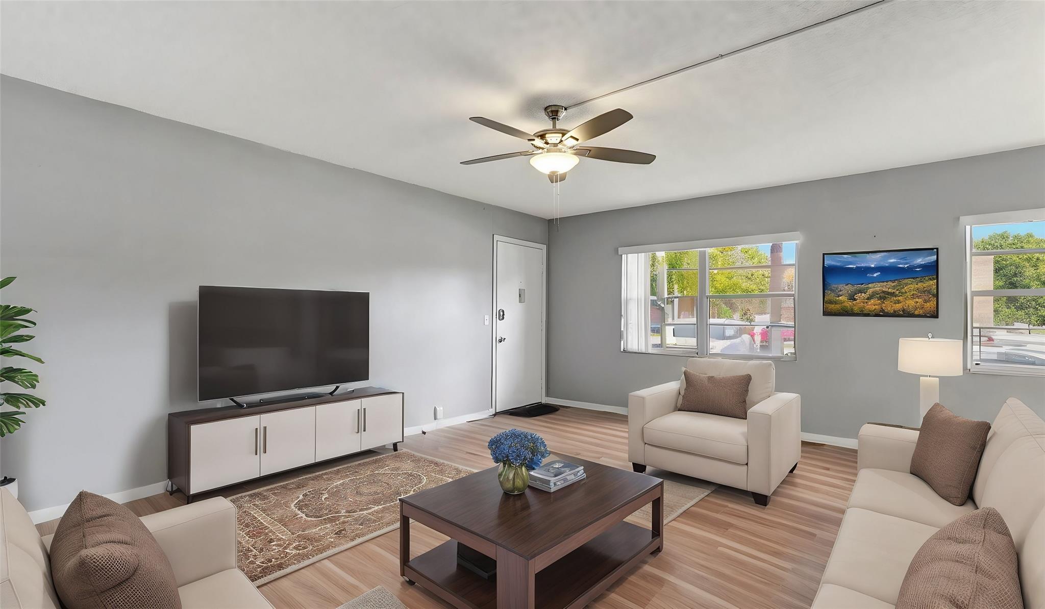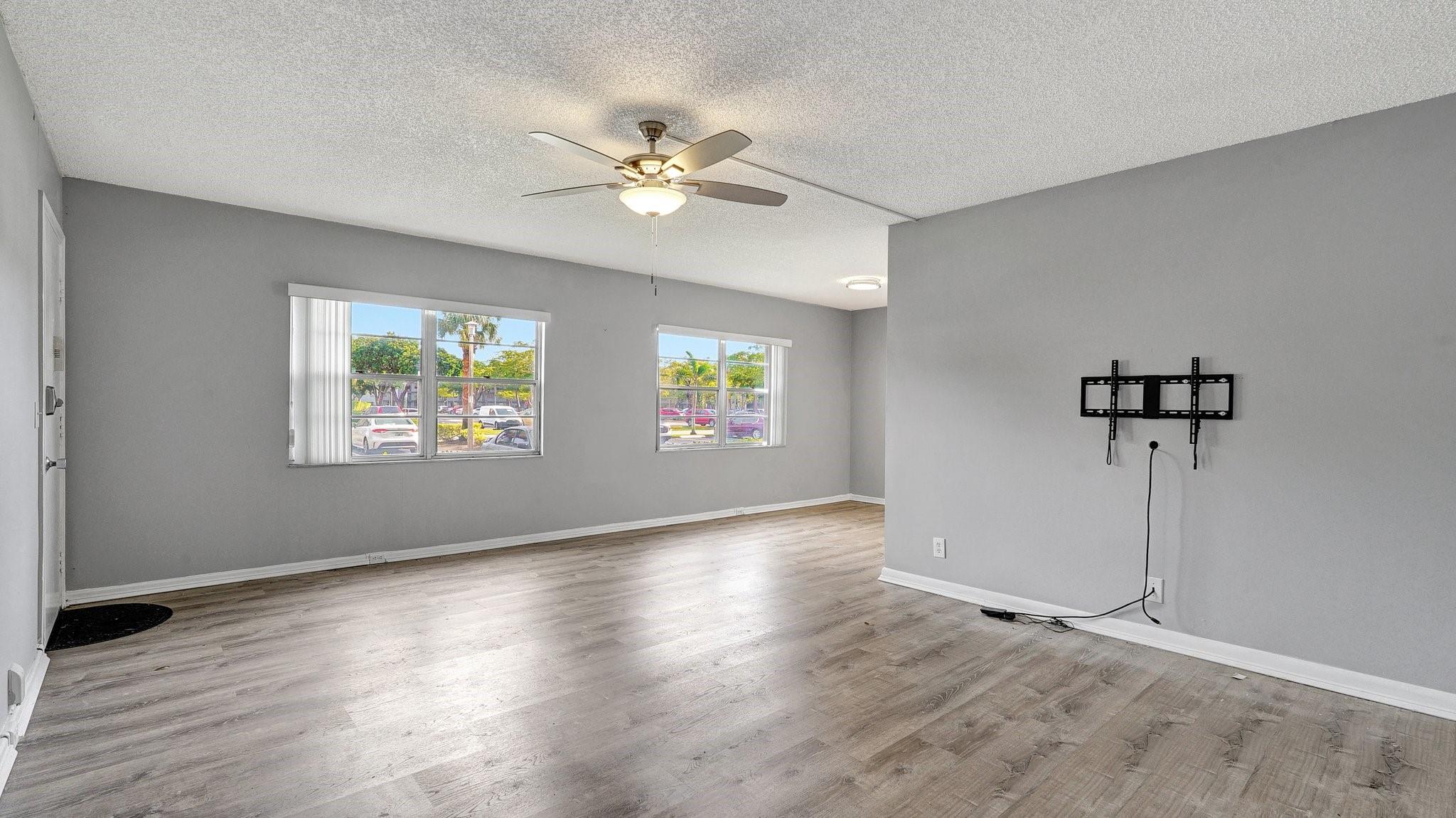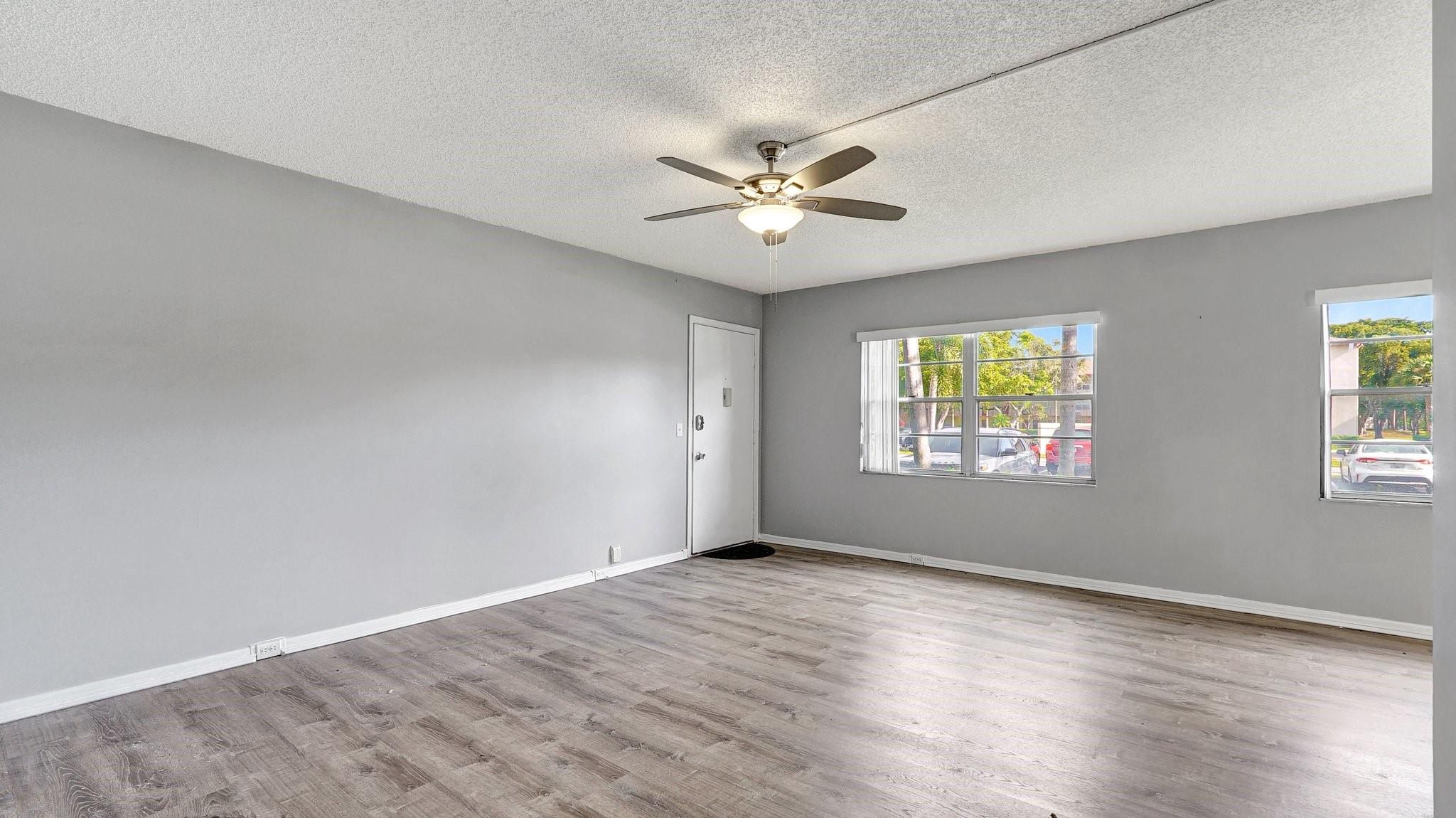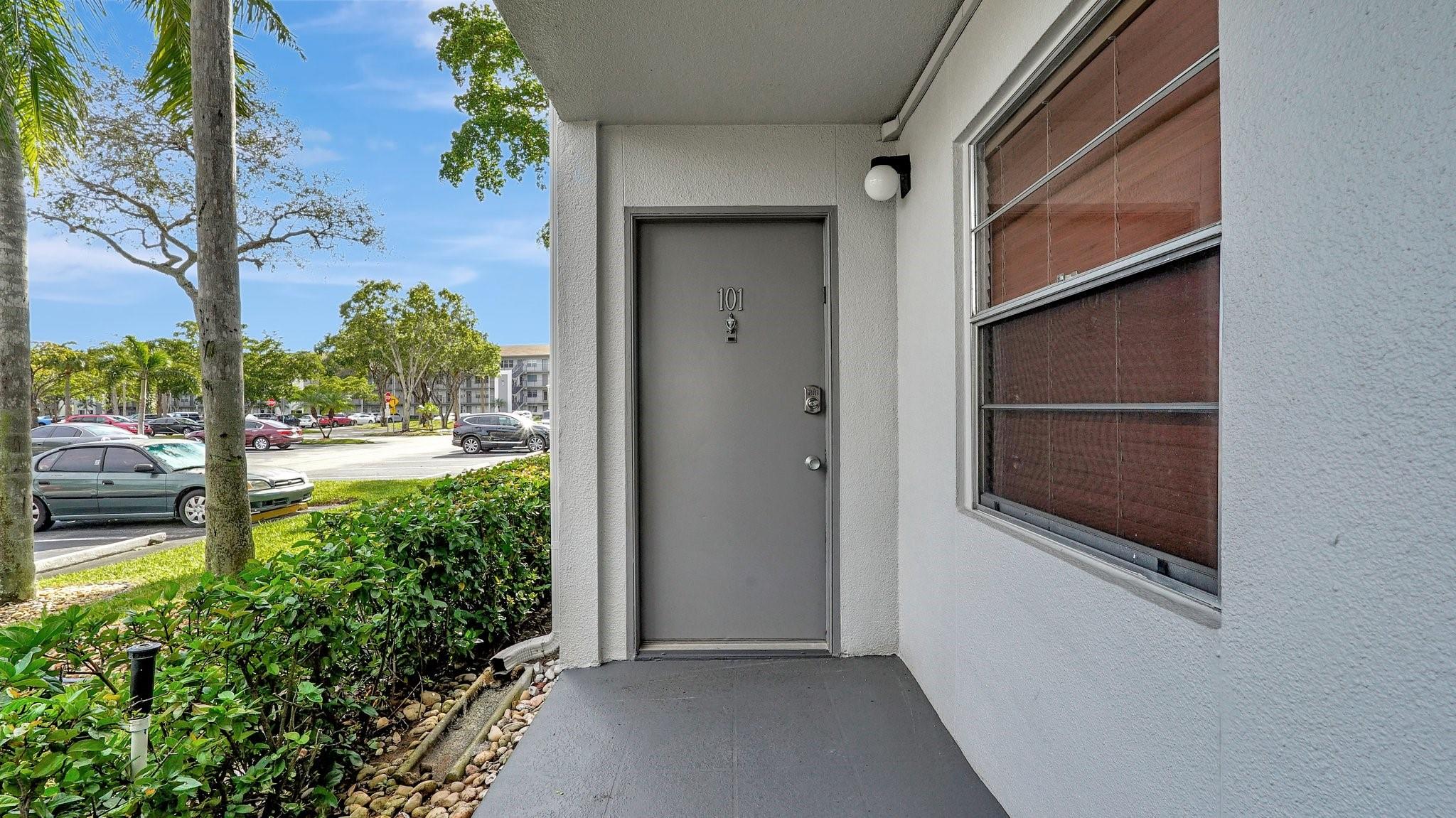 Fabulous 1st Floor Corner Unit!!! Open floor plan that is remodeled, new flooring throughout with amazing views of water and no rear neighbor. Lots of windows that allow all of the natural light that you need to see the beautiful scenery. Two bedrooms and two full bath which leaves your master bedroom with its own private bathroom and walk in closet. Updated kitchen with quartz countertops. Just bring your toothbrush and live the lifestyle so desired in Century Village. 24/7 security in a gated community provides peace of mind. Private screened patio with extra built-in storage. AC 2022 Water, Cable, and Internet Included in the HOA payment. 1 assigned parking. Plenty of guest parking. FREE shuttle service to shops and restaurants. CAN BE RENTED IMMEDIATELY AND READY TO MOVE.