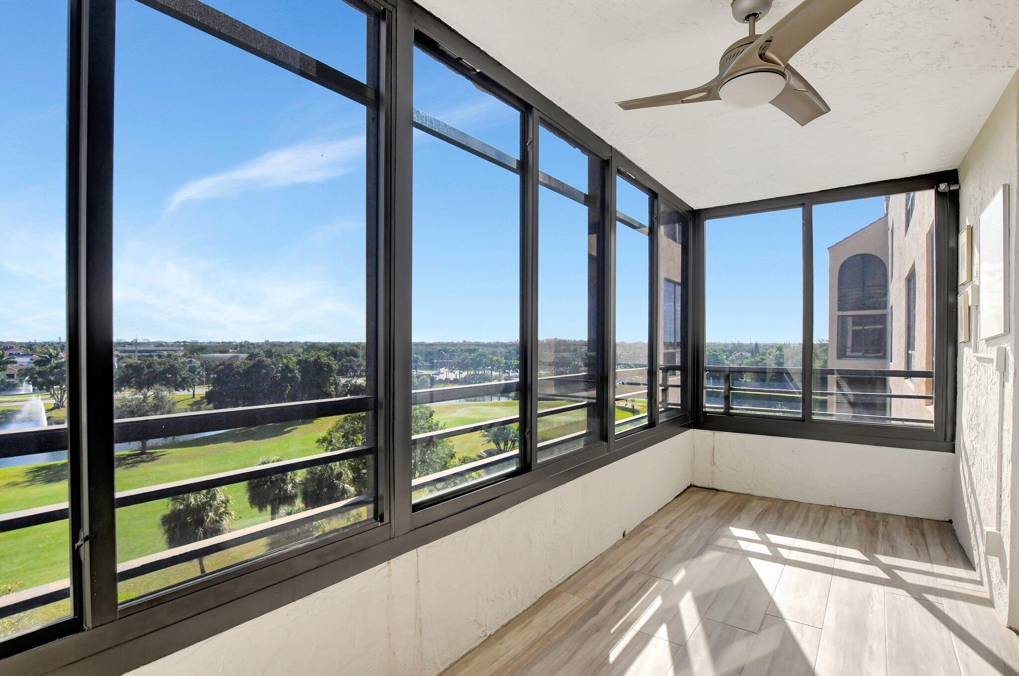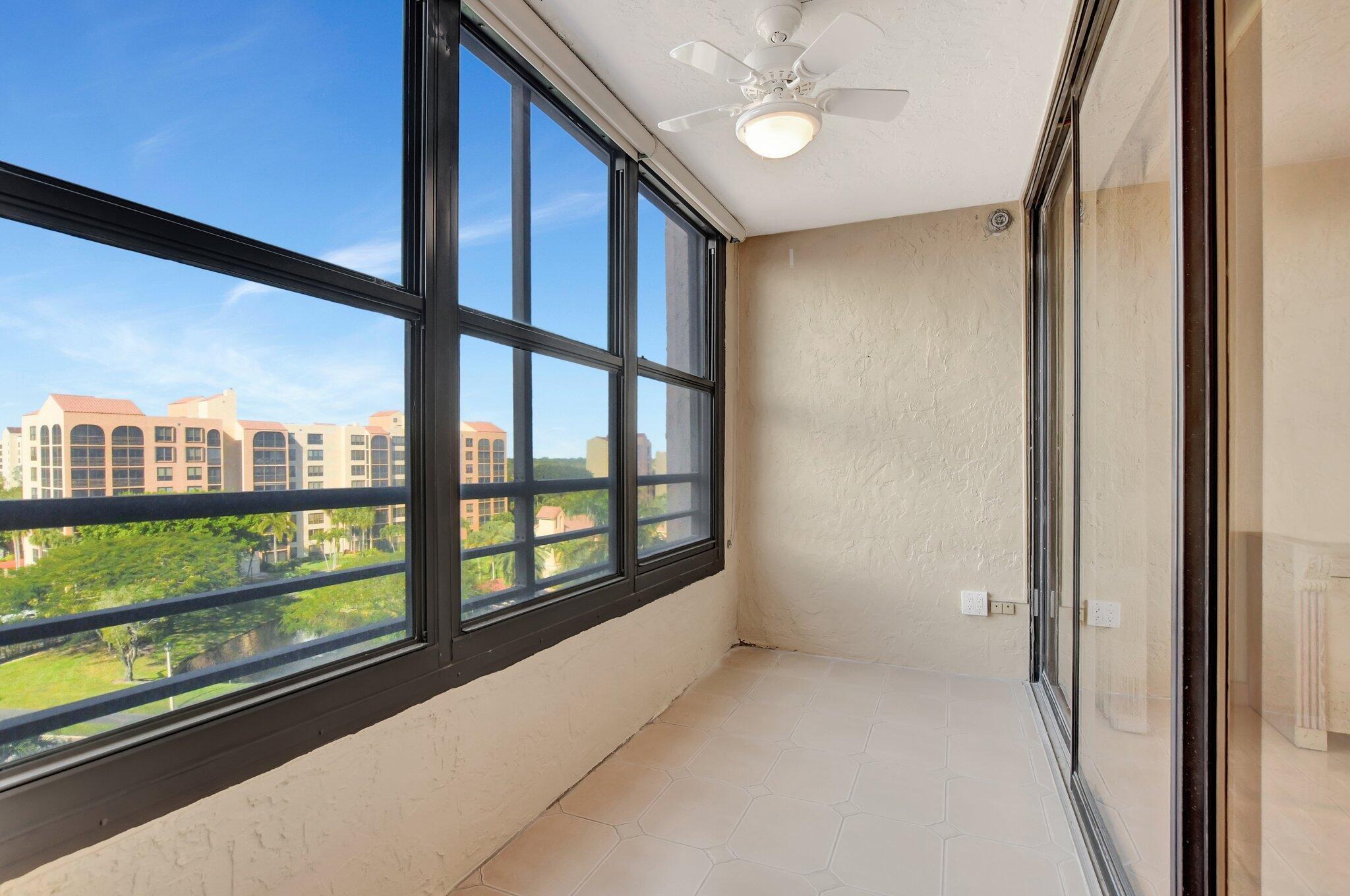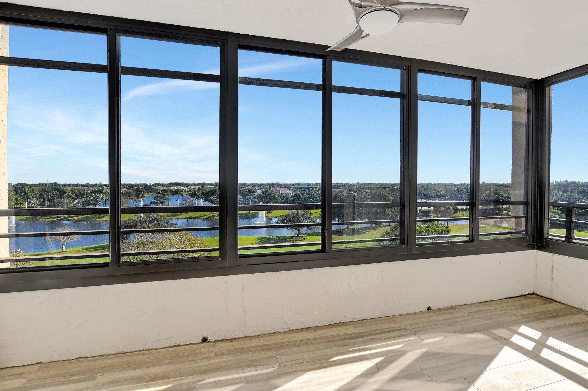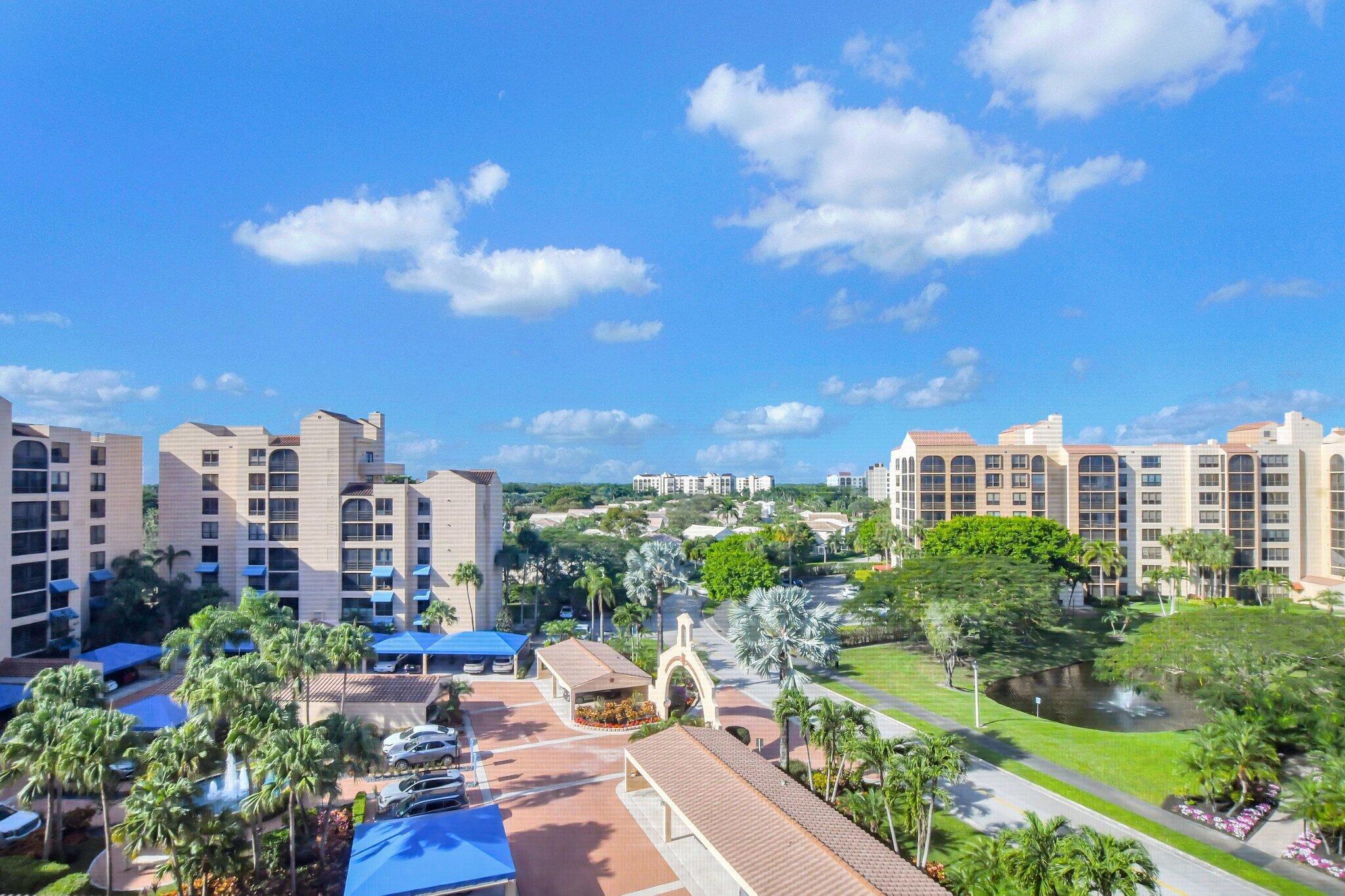 Highly desirable Brittany model on a high floor with stunning golf and water views now available in Promenade at Boca Pointe! The open kitchen has been beautifully updated with white cabinets, stainless steel appliances, custom counters, and a stylish backsplash. Both patios are glass-enclosed, with hurricane glass on the back patio and a storage closet. Marble floors adorn the living areas, while the bedrooms feature cozy carpet. Recent updates include A/C and water heater replacements within the last 5 years. The spacious primary suite offers a large walk-in closet and an additional storage closet. Additional features include plantation shutters, a half bath, an open den or 3rd bedroom, and one assigned covered parking space. Enjoy the community pool, clubhouse, and on-site manager!
