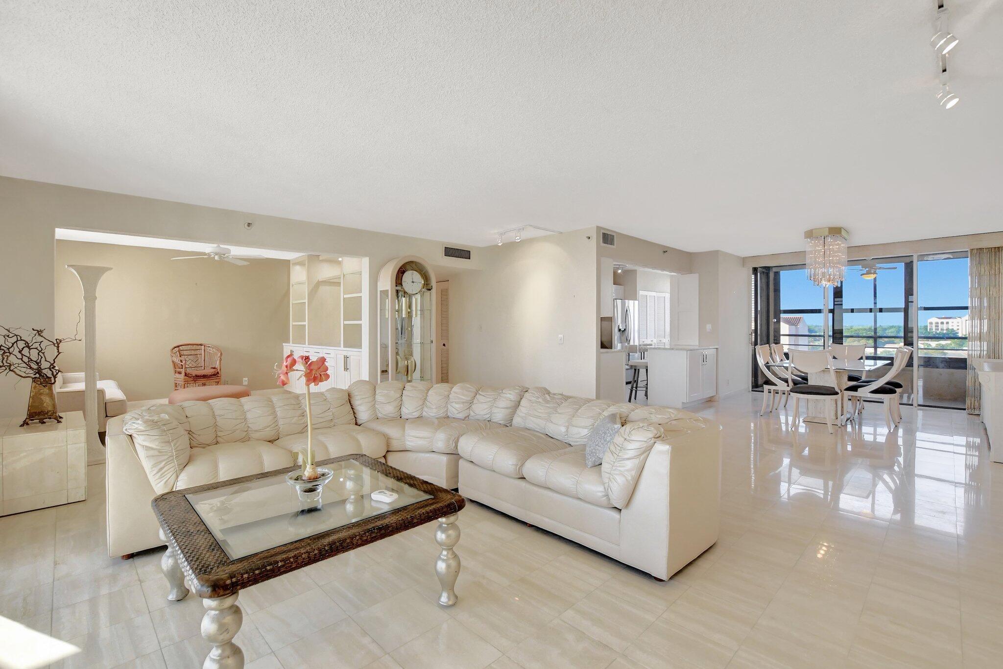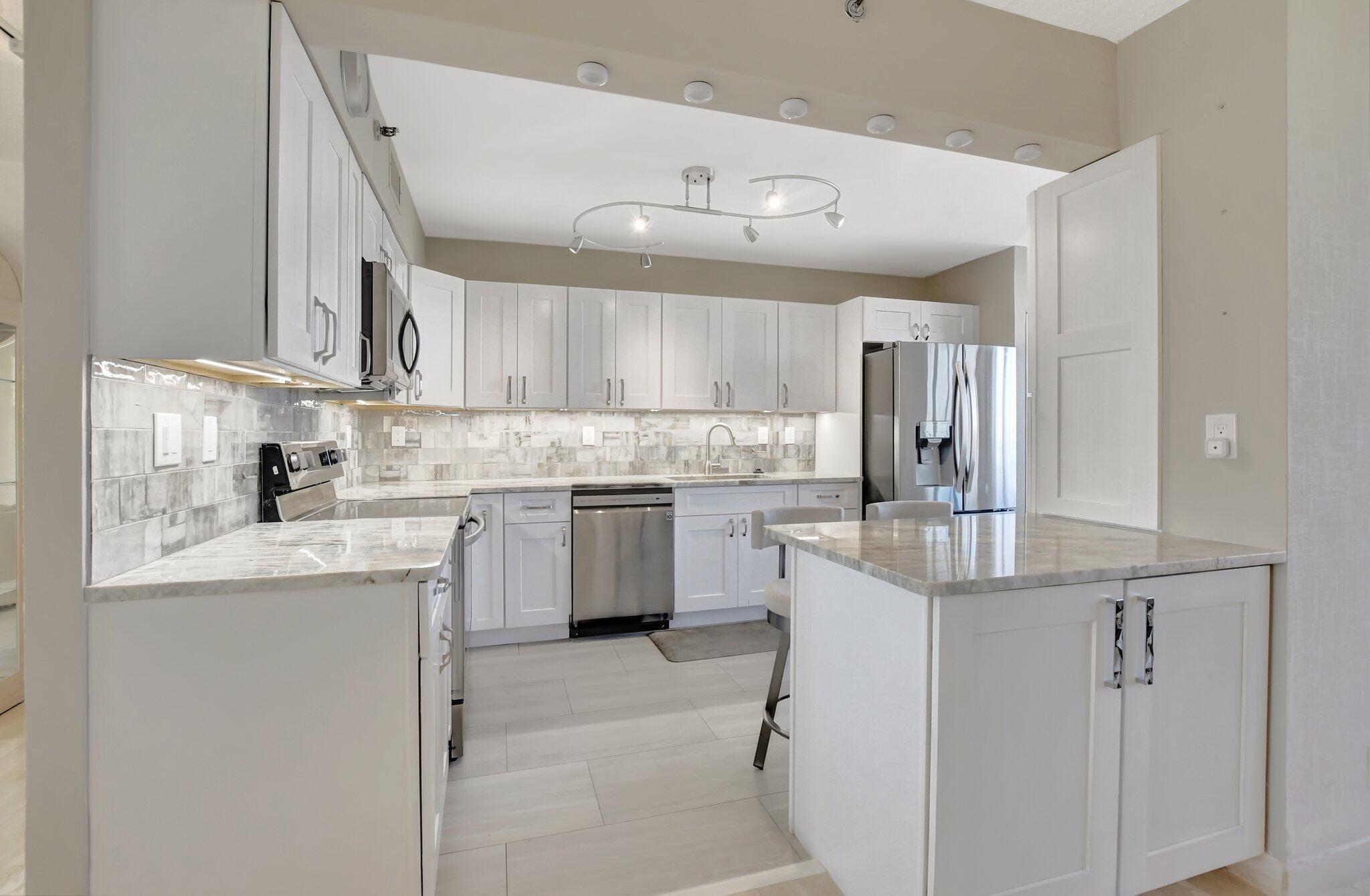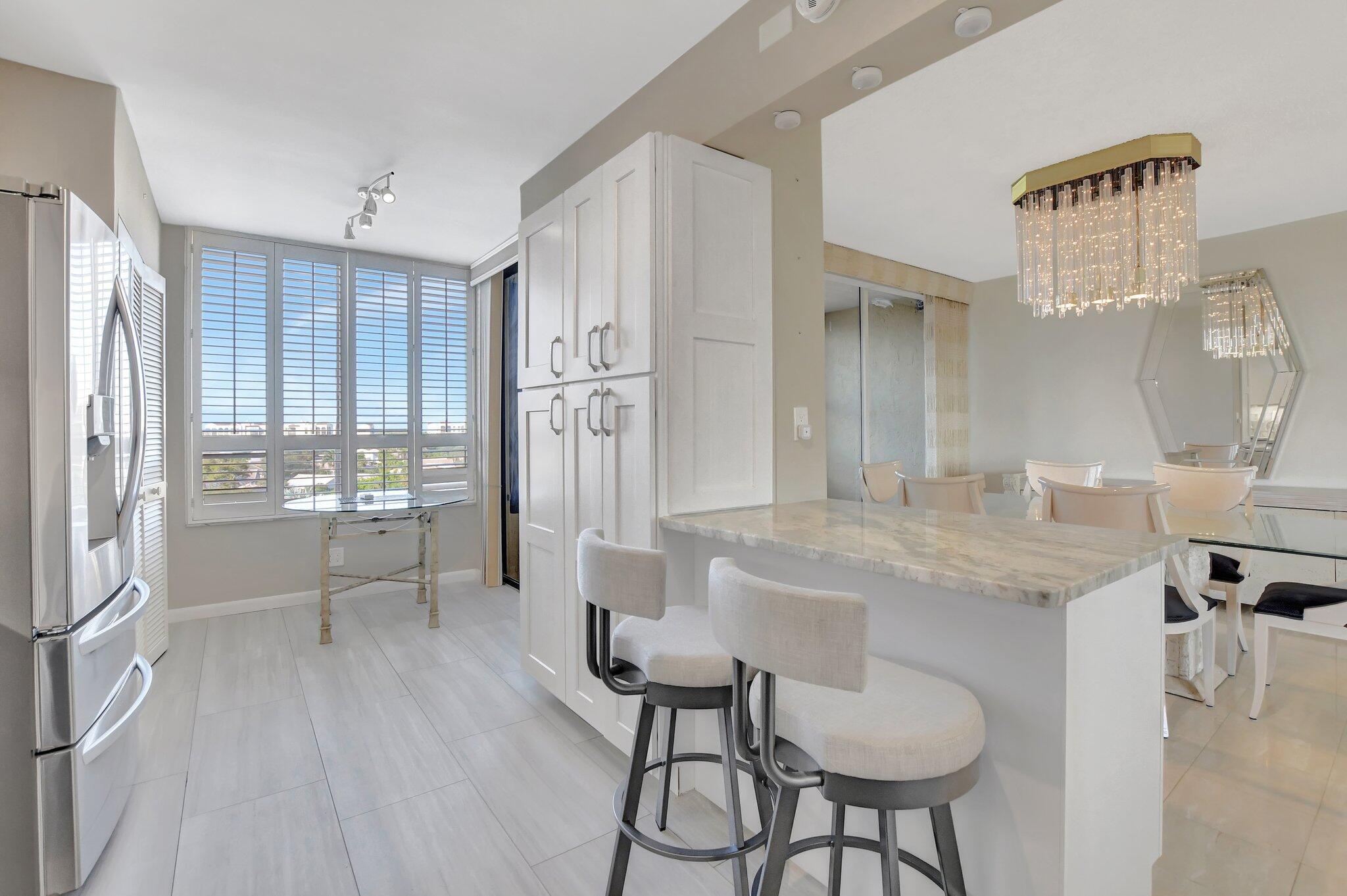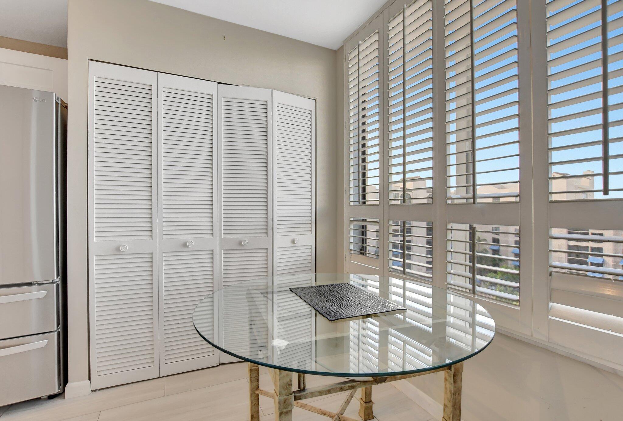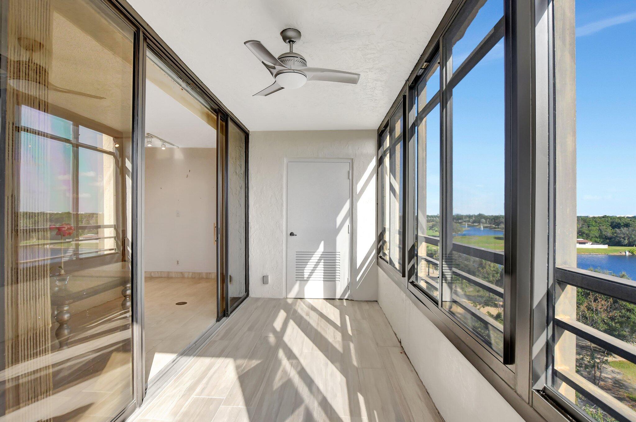 Highly desirable Brittany model on a high floor with stunning golf and water views now available in Promenade at Boca Pointe! The open kitchen has been beautifully updated with white cabinets, stainless steel appliances, custom counters, and a stylish backsplash. Both patios are glass-enclosed, with hurricane glass on the back patio and a storage closet. Marble floors adorn the living areas, while the bedrooms feature cozy carpet. Recent updates include A/C and water heater replacements within the last 5 years. The spacious primary suite offers a large walk-in closet and an additional storage closet. Additional features include plantation shutters, a half bath, an open den or 3rd bedroom, and one assigned covered parking space. Enjoy the community pool, clubhouse, and on-site manager!