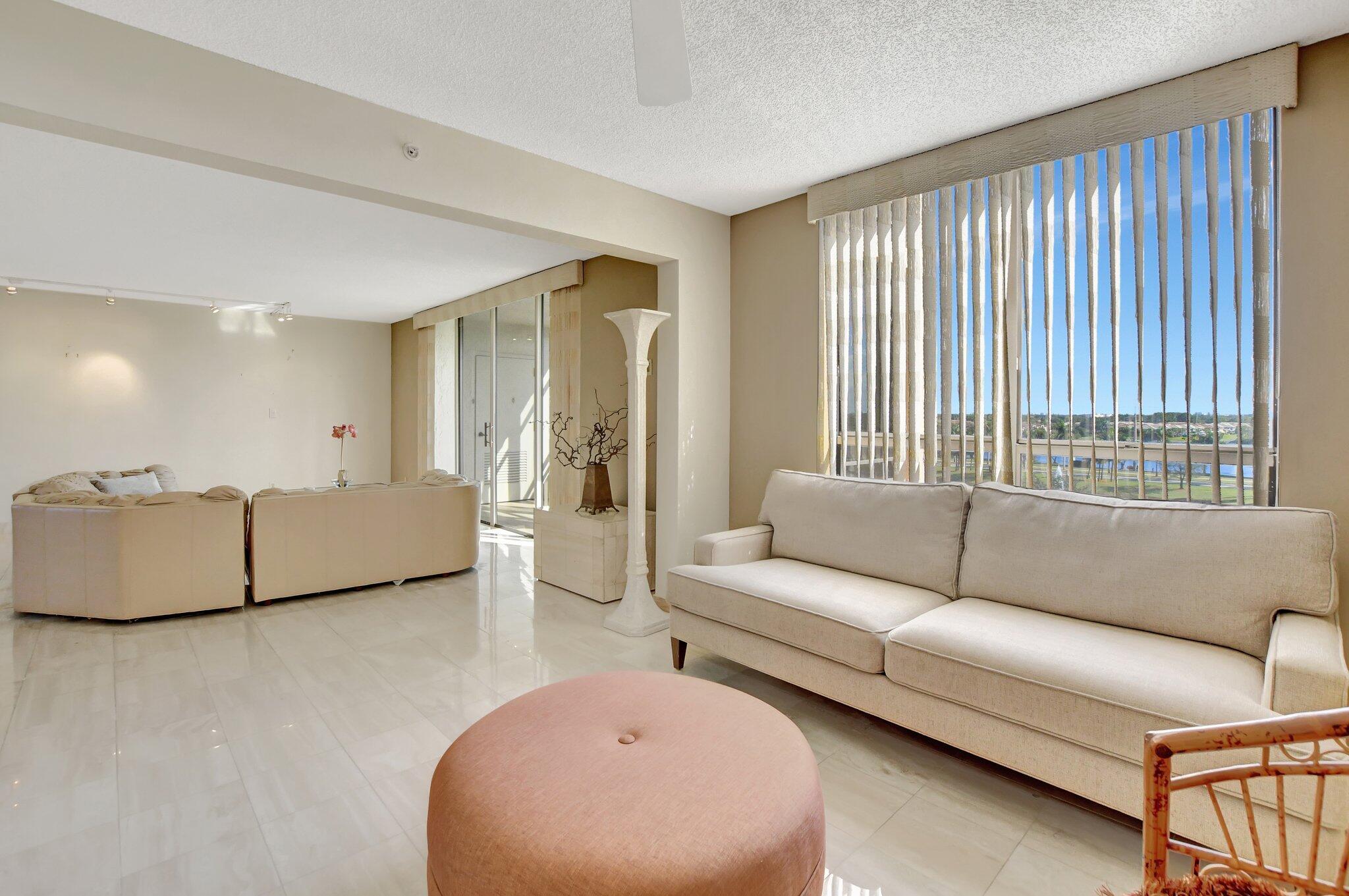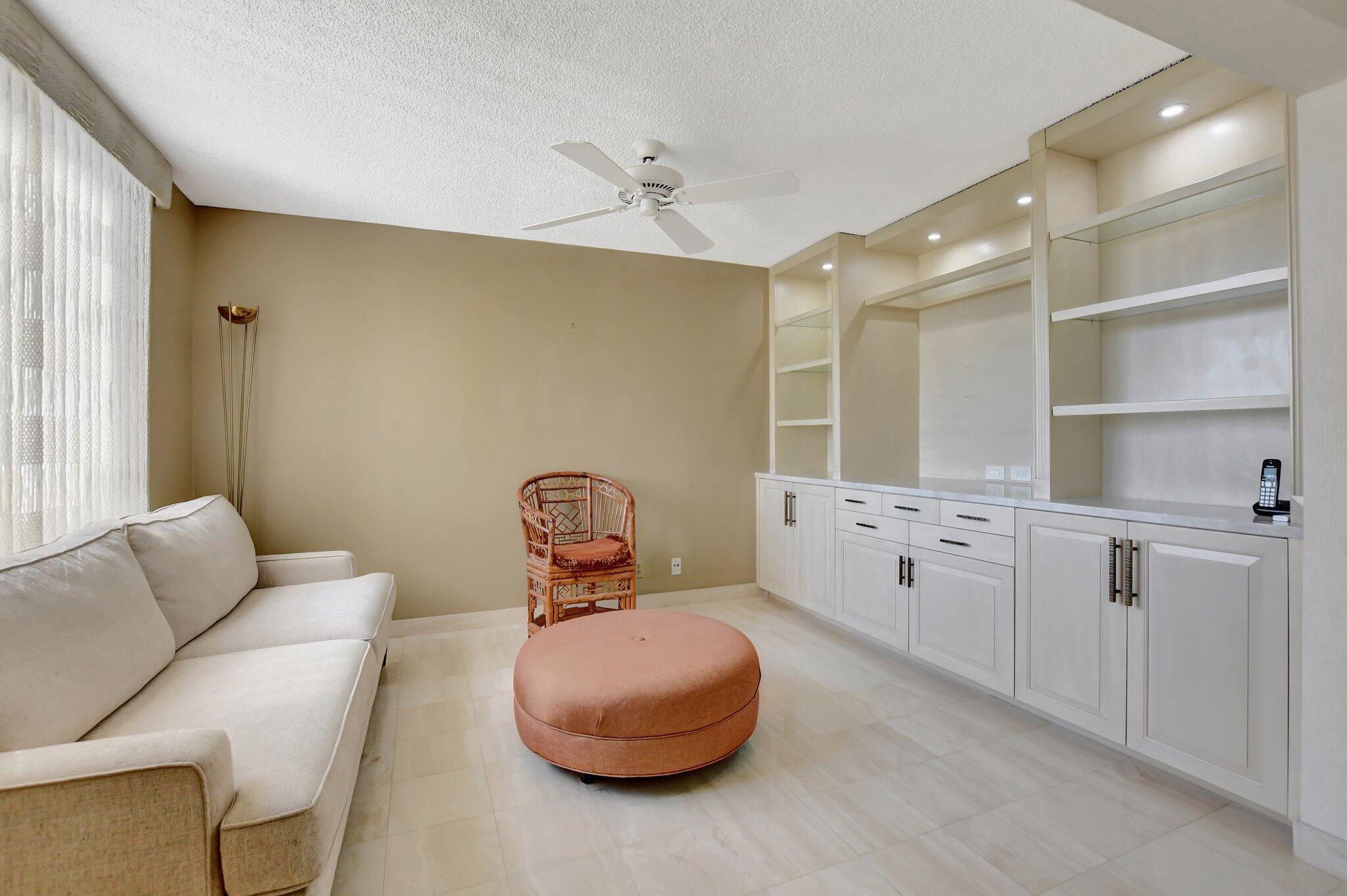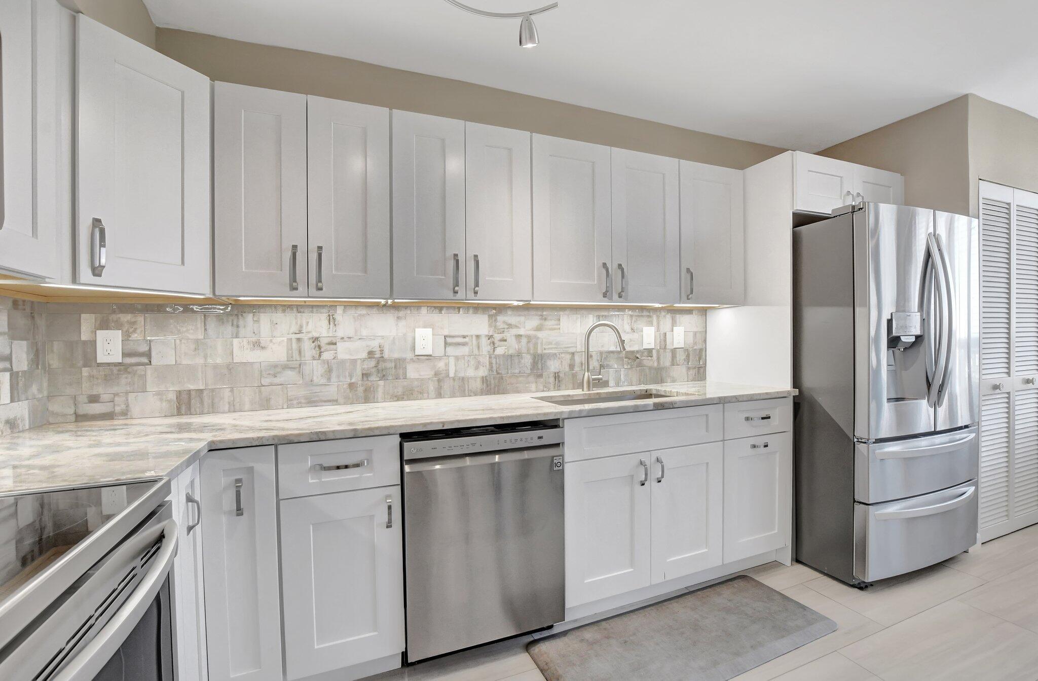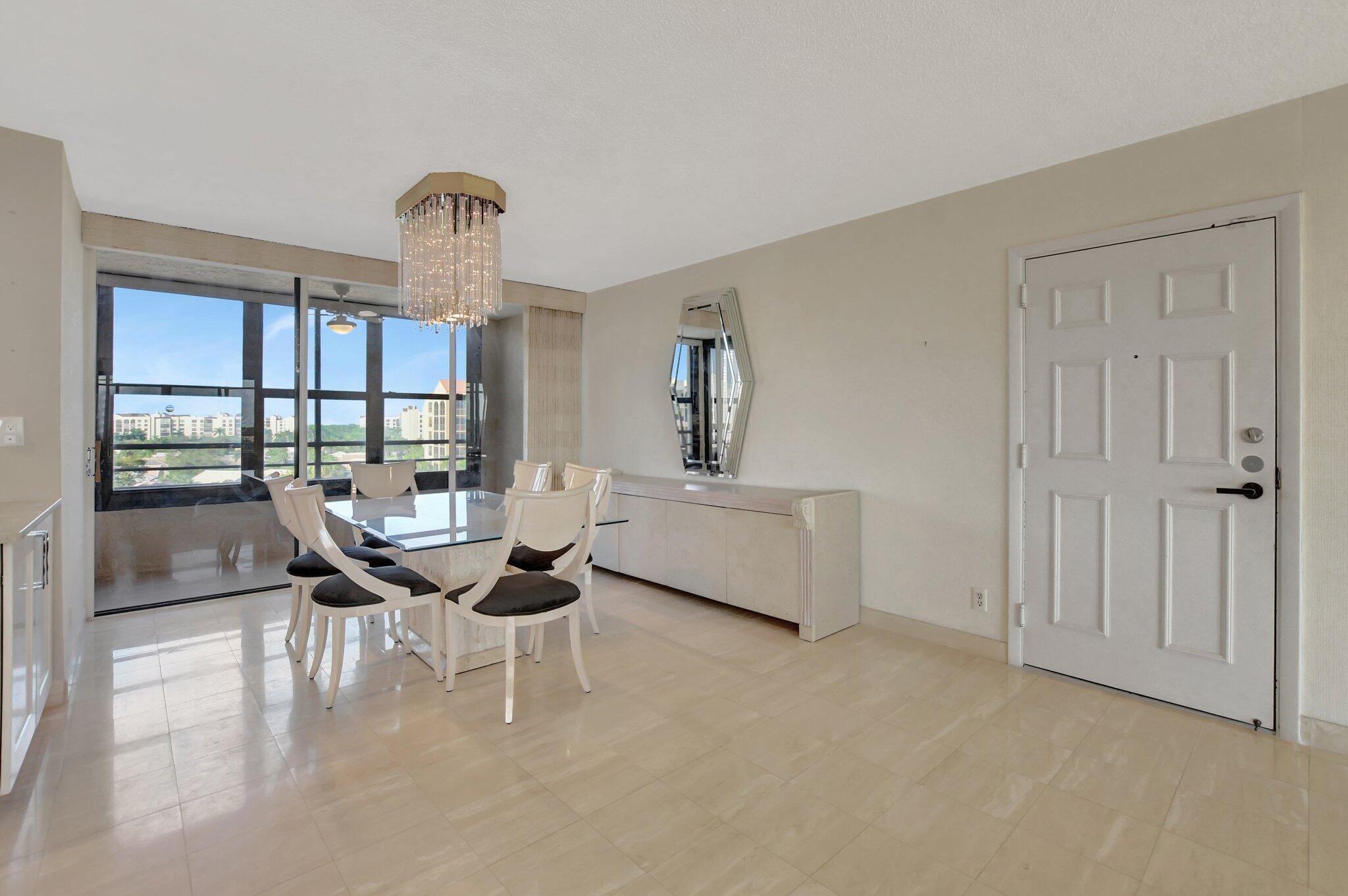 Highly desirable Brittany model on a high floor with stunning golf and water views now available in Promenade at Boca Pointe! The open kitchen has been beautifully updated with white cabinets, stainless steel appliances, custom counters, and a stylish backsplash. Both patios are glass-enclosed, with hurricane glass on the back patio and a storage closet. Marble floors adorn the living areas, while the bedrooms feature cozy carpet. Recent updates include A/C and water heater replacements within the last 5 years. The spacious primary suite offers a large walk-in closet and an additional storage closet. Additional features include plantation shutters, a half bath, an open den or 3rd bedroom, and one assigned covered parking space. Enjoy the community pool, clubhouse, and on-site manager!