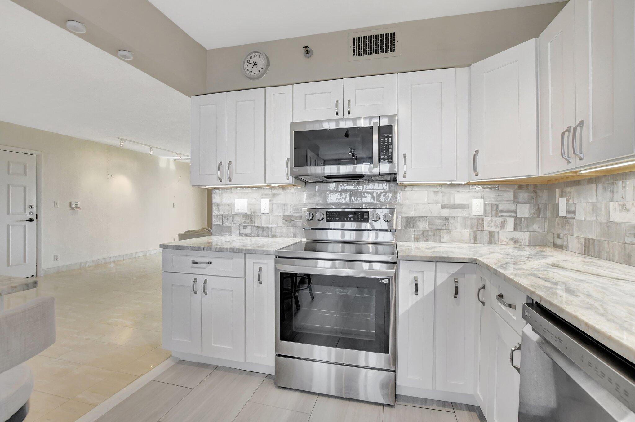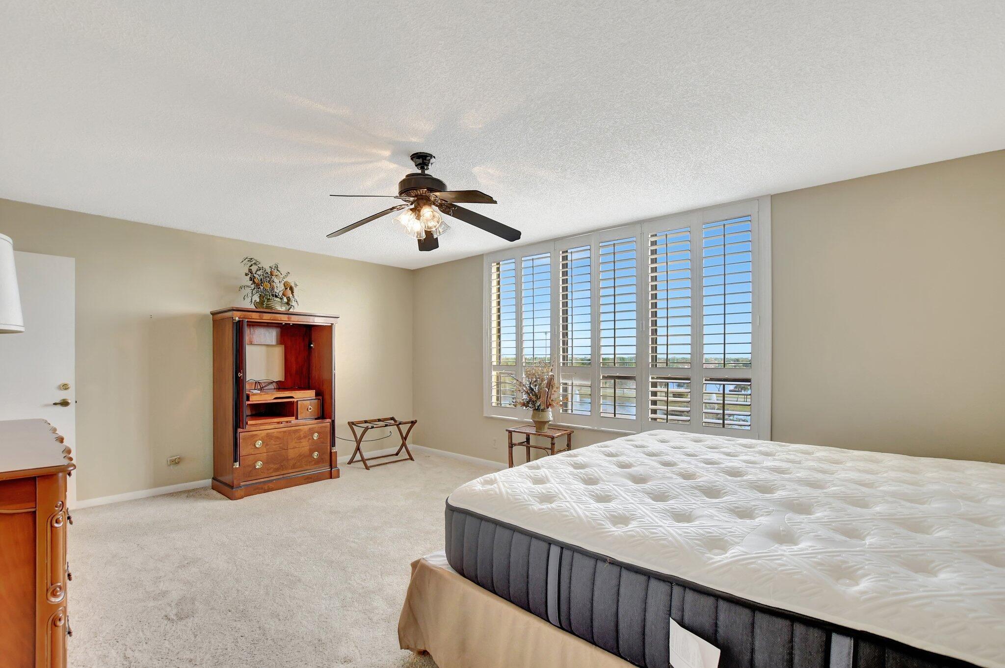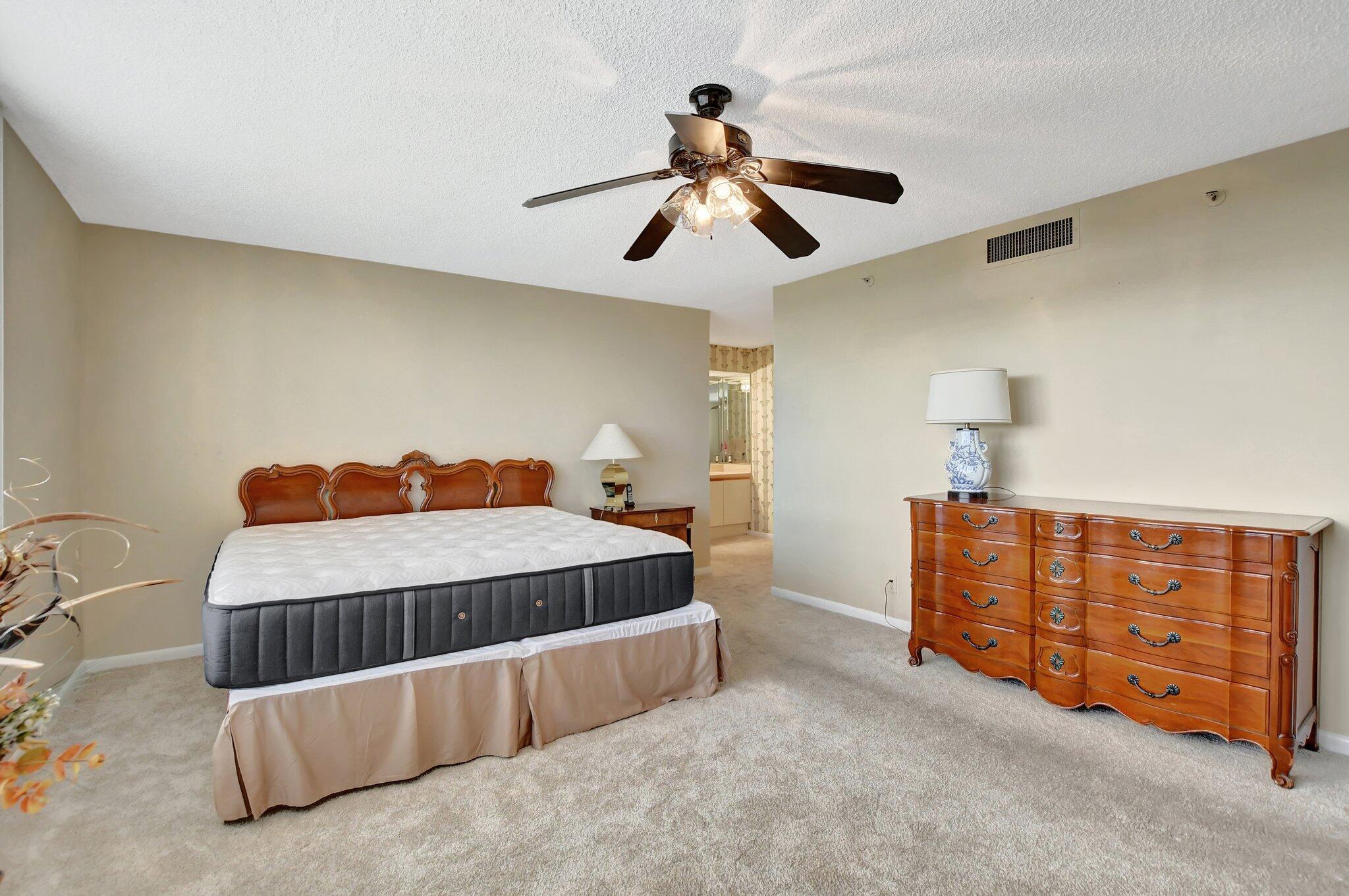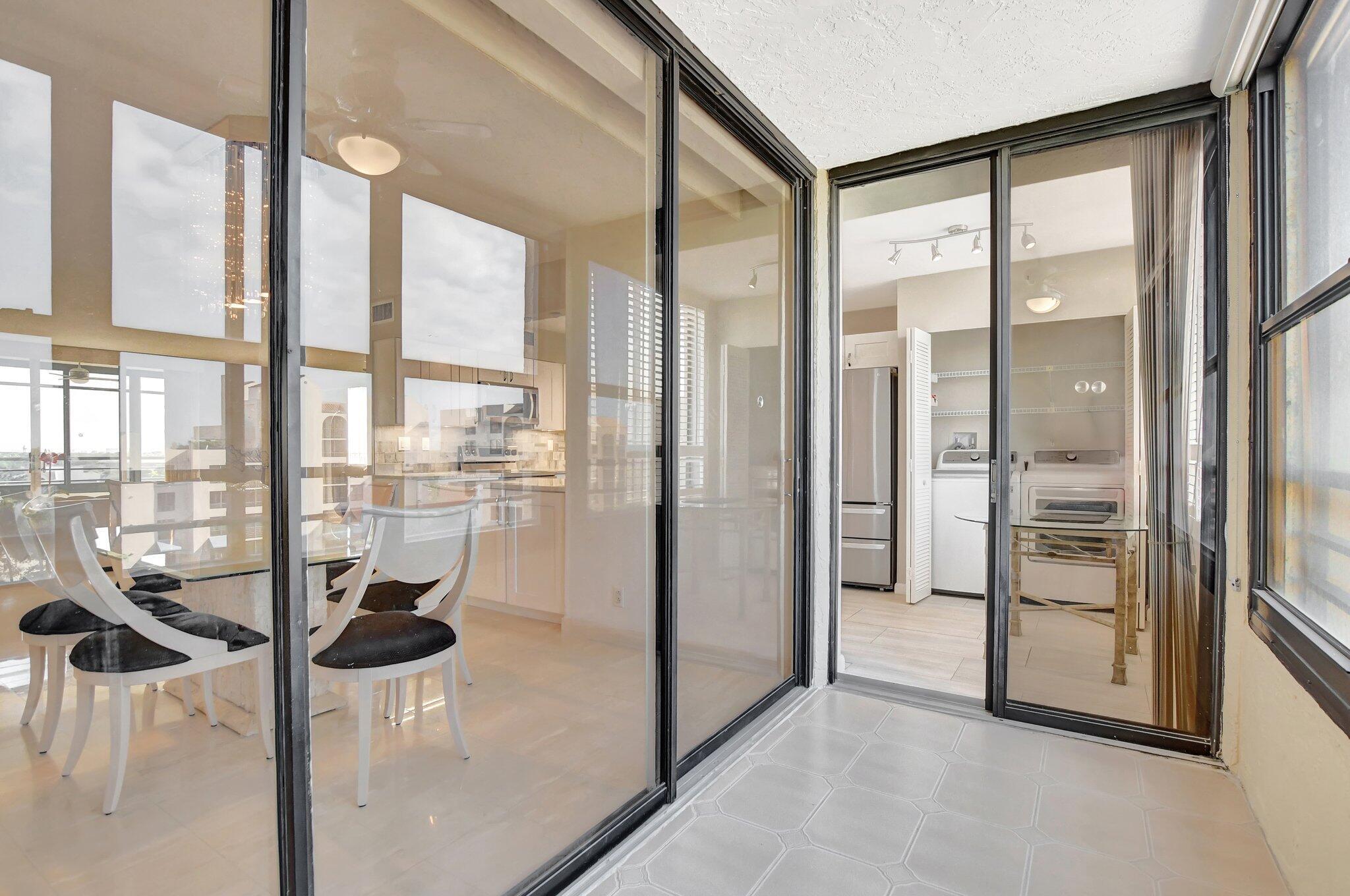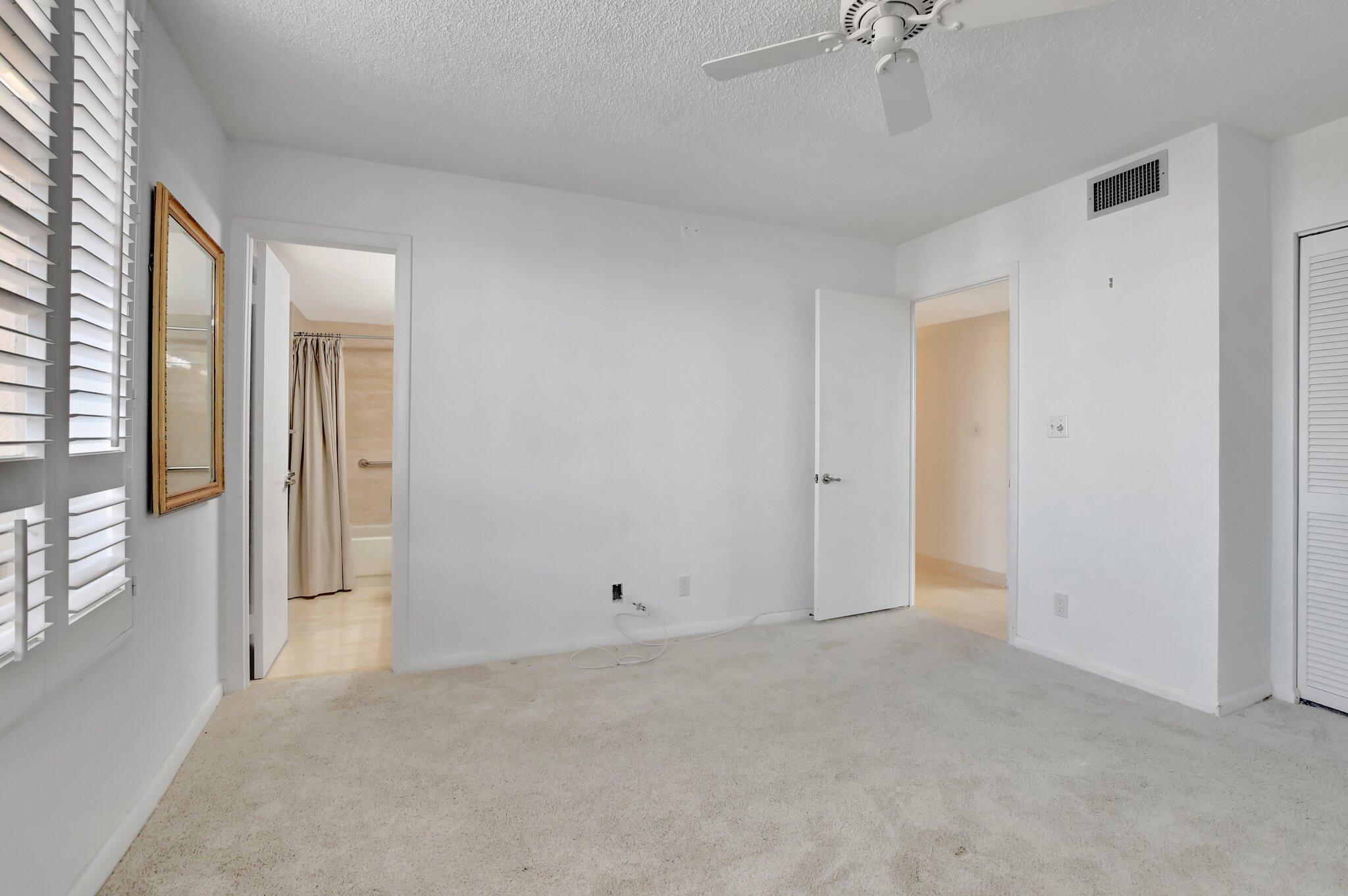 Highly desirable Brittany model on a high floor with stunning golf and water views now available in Promenade at Boca Pointe! The open kitchen has been beautifully updated with white cabinets, stainless steel appliances, custom counters, and a stylish backsplash. Both patios are glass-enclosed, with hurricane glass on the back patio and a storage closet. Marble floors adorn the living areas, while the bedrooms feature cozy carpet. Recent updates include A/C and water heater replacements within the last 5 years. The spacious primary suite offers a large walk-in closet and an additional storage closet. Additional features include plantation shutters, a half bath, an open den or 3rd bedroom, and one assigned covered parking space. Enjoy the community pool, clubhouse, and on-site manager!