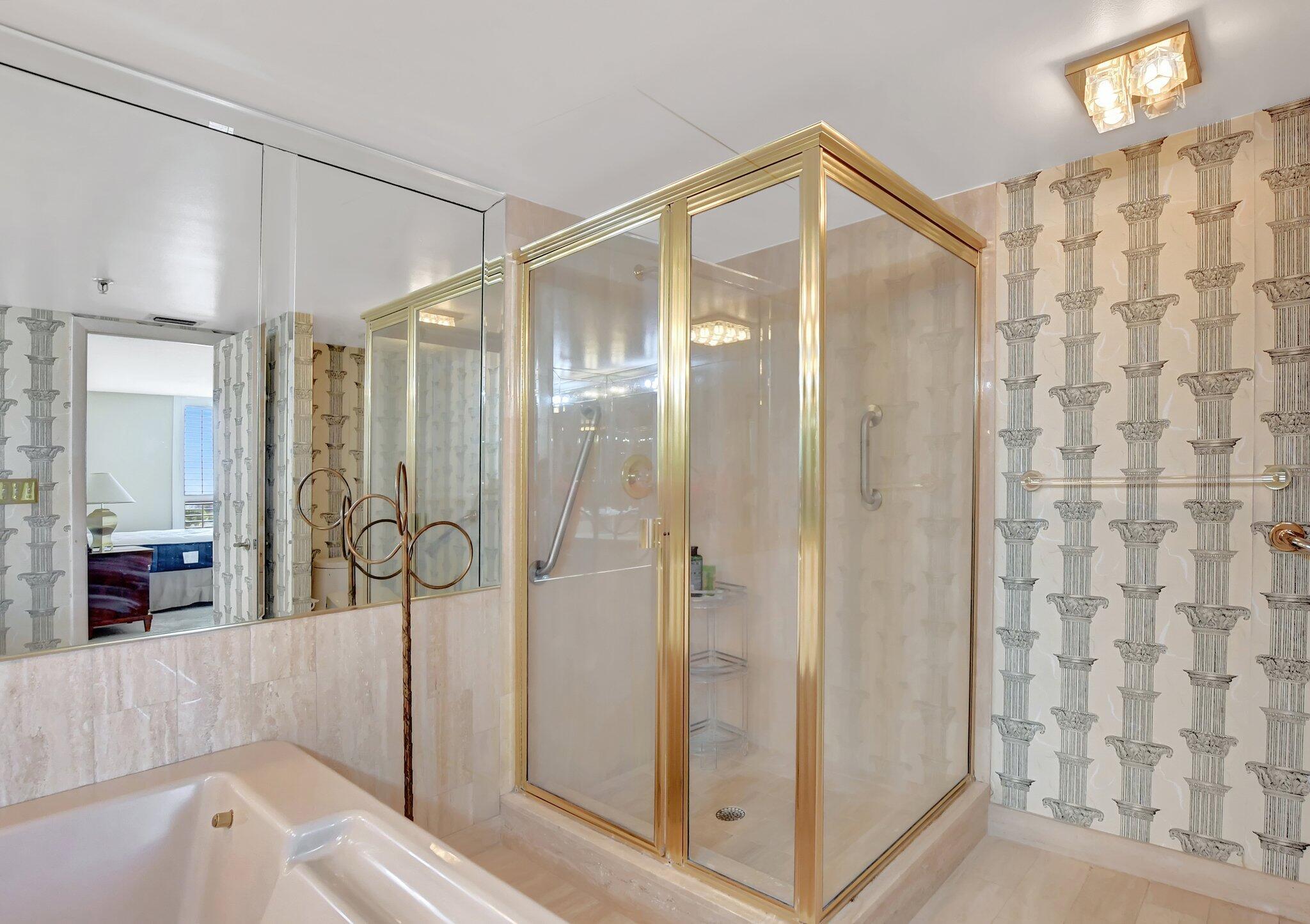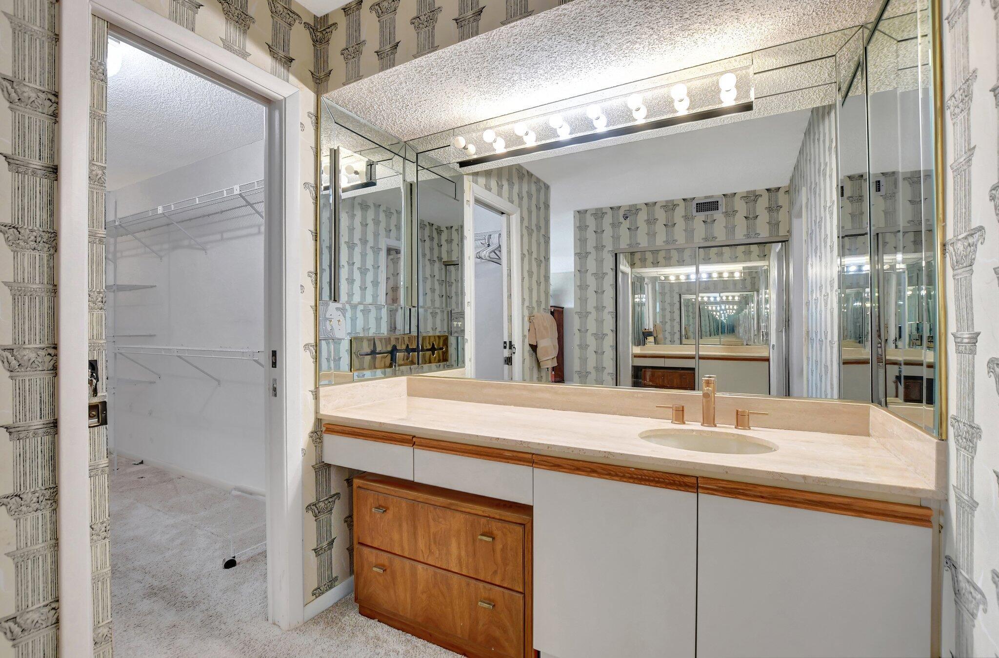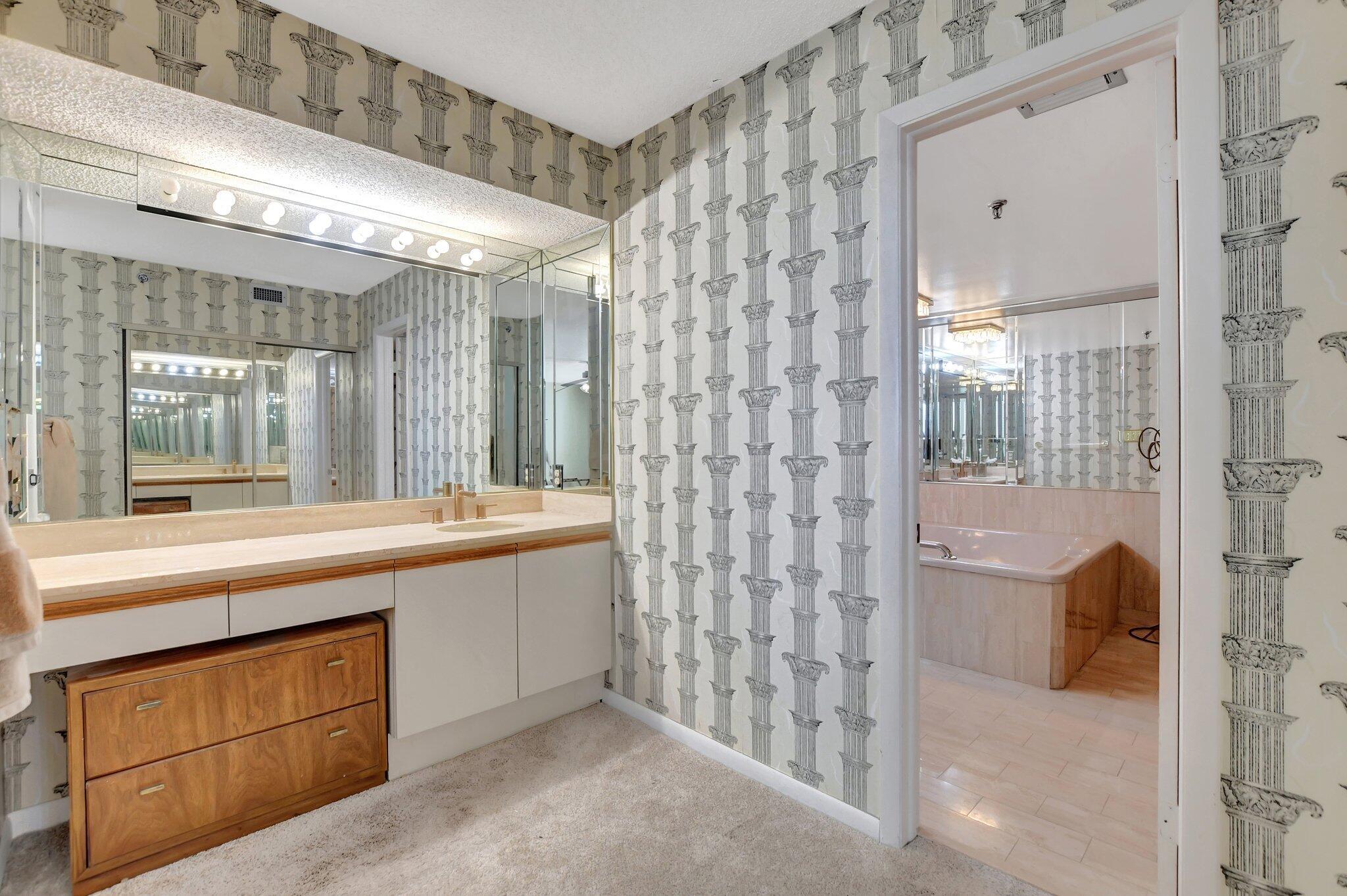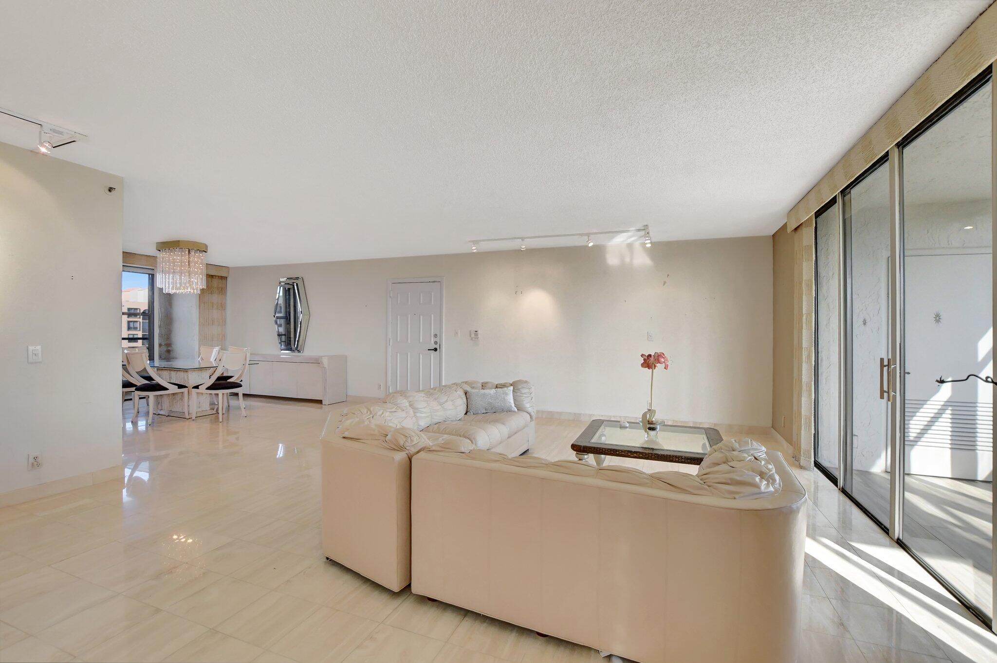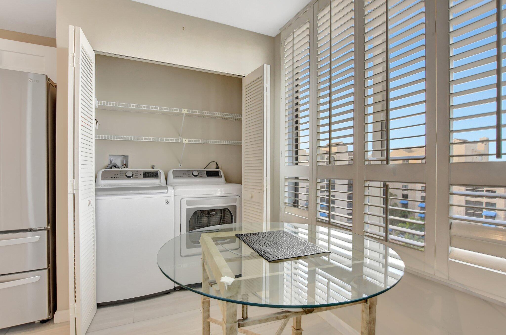 Highly desirable Brittany model on a high floor with stunning golf and water views now available in Promenade at Boca Pointe! The open kitchen has been beautifully updated with white cabinets, stainless steel appliances, custom counters, and a stylish backsplash. Both patios are glass-enclosed, with hurricane glass on the back patio and a storage closet. Marble floors adorn the living areas, while the bedrooms feature cozy carpet. Recent updates include A/C and water heater replacements within the last 5 years. The spacious primary suite offers a large walk-in closet and an additional storage closet. Additional features include plantation shutters, a half bath, an open den or 3rd bedroom, and one assigned covered parking space. Enjoy the community pool, clubhouse, and on-site manager!