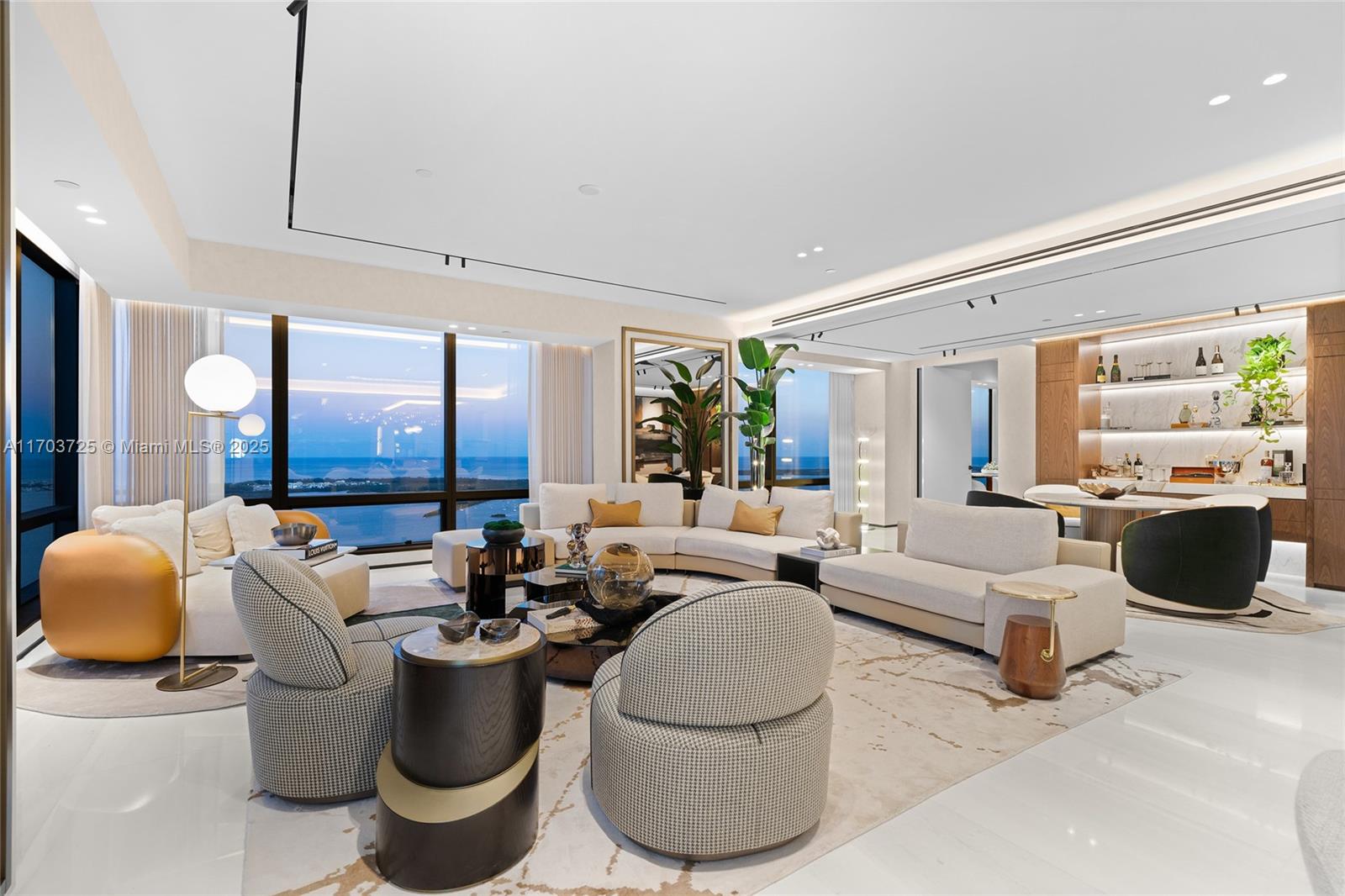 Welcome to Lower Penthouse 66. This fully renovated turnkey masterpiece in the prestigious Four Seasons Residences is situated on the 66th floor, in the building’s most desirable lines, D & E. This residence seamlessly merges two units, offering panoramic ocean and city views from every room. The interiors exude sophistication with Bianco Ondulato marble floors and an Ornare kitchen featuring Calacatta countertops. Furnished by Fendi, Minotti, and Luxury Living. Spa-like bathrooms with Armani fixtures, LED-lit recessed baseboards, gunmetal accents, and smart home technology. Ideal for entertaining, the home includes a lounge, bar, private office, family room, and maid’s quarters. World-class amenities include an Equinox fitness center, spa, multiple pools, and 24-hour concierge services