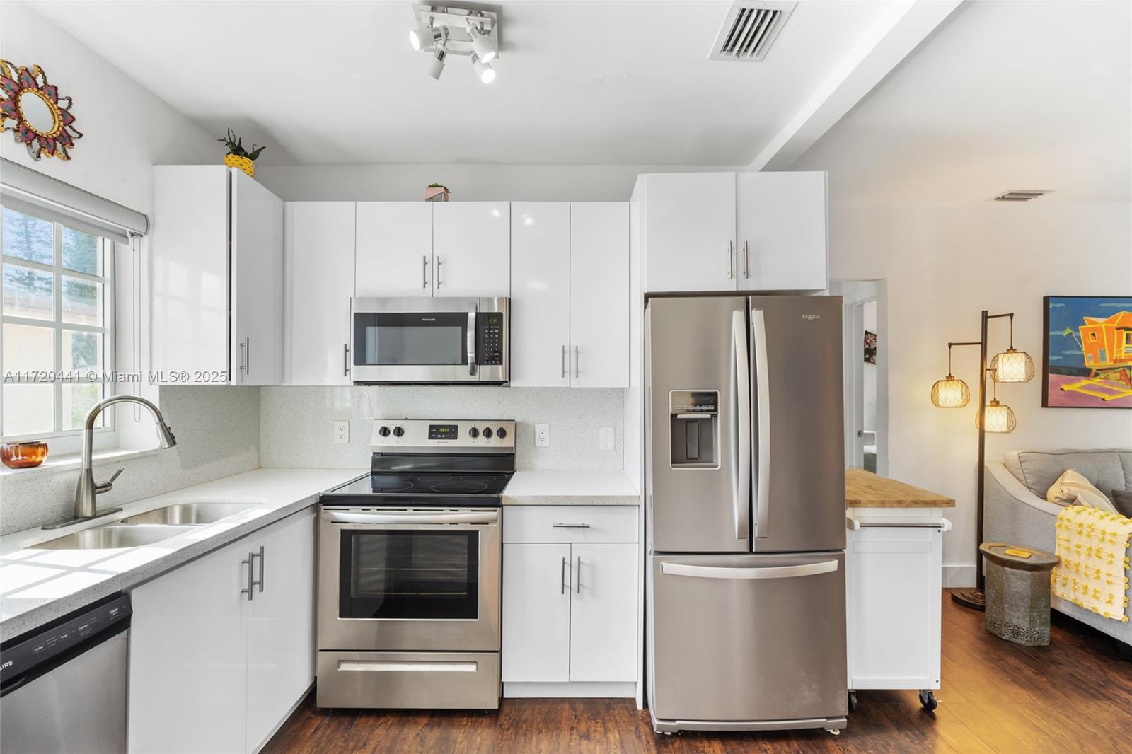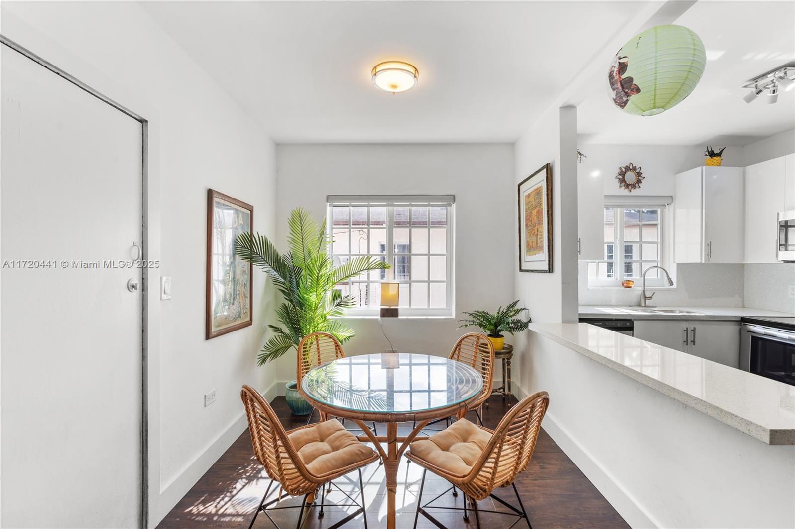 Discover the charm of Normandy Isles in this top-floor, two-bedroom, one-bath condo, nestled in a boutique building with only four units. Bathed in natural sunlight from every room, this corner unit has been tastefully re-styled with impact windows, dark brown laminate floors throughout, and kitchen featuring white countertops, cabinets, and appliances. Enjoy the comfort of brand new central A/C, along with the convenience of an in-unit washer and dryer.Step outside to a screened porch area, large enough to host dinner for four. The building is well-maintained, with a certification up to day, and all-new PVC plumbing and copper piping throughout. With low maintenance fees and a small association, this condo offers a perfect blend of modern living and peaceful charm. Centrally located!