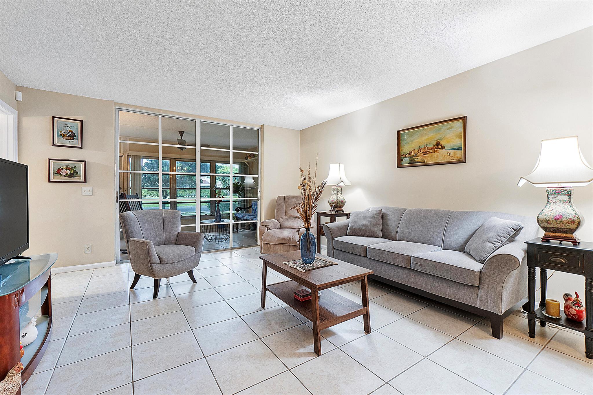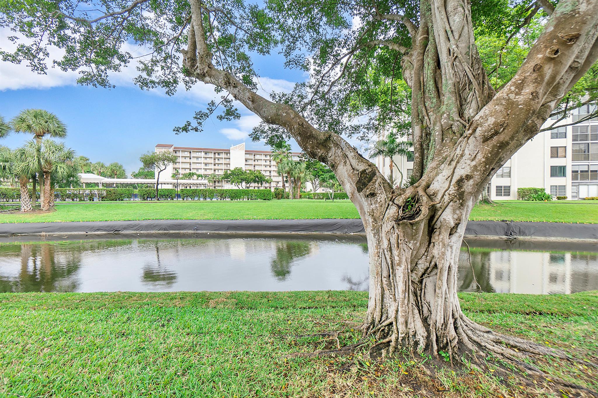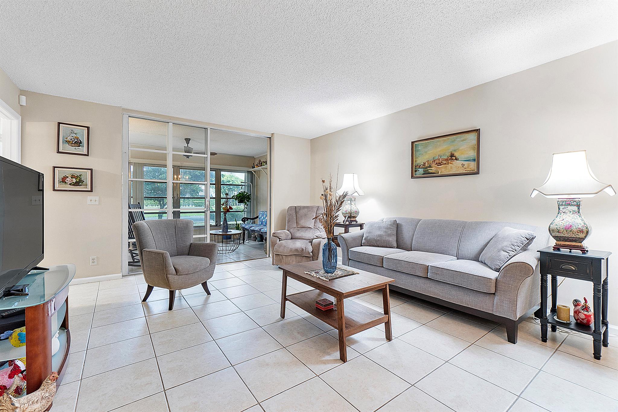 Discover the largest unit in this desirable building! Welcome home to a spacious first-floor end unit featuring a bright eat-in kitchen and serene lake views from the enclosed patio, which conveniently includes its own exterior door. The master bedroom is very spacious boasts a generous custom walk-in closet.Enjoy the elegance of tile flooring throughout the unit, complemented by its prime location near the pool, clubhouse, storage unit, and a variety of amenities. Reserved parking near the front door adds to your convenience. Experience a walkable neighborhood with well-maintained, accessible sidewalks and paths for leisurely strolls. Prefer not to walk or drive? Take advantage of the community trolley shuttle, providing easy access to shopping, entertainment, and appointments.