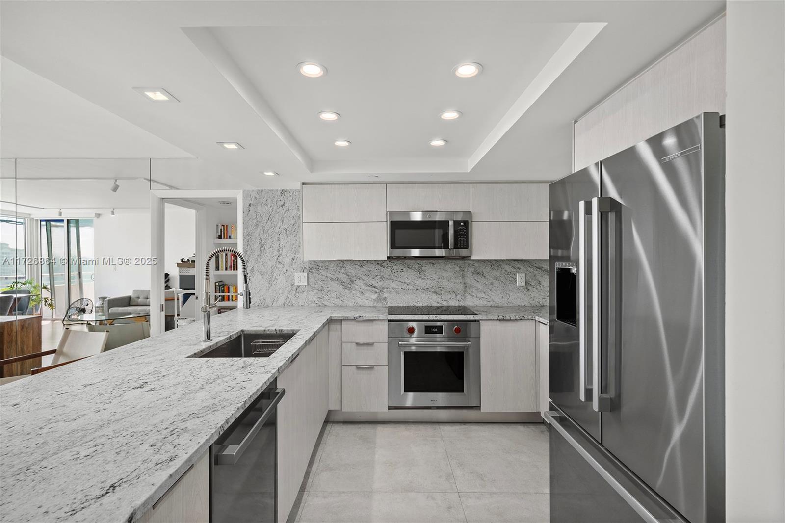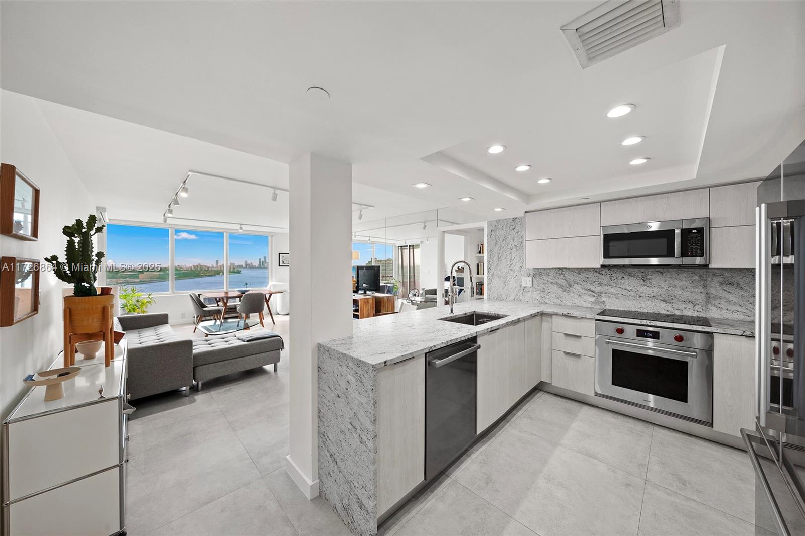 Renovated unit, including new impact windows, completed in 2023. 2 BR, 2 BA split floor plan. Kitchen boasts high-end appliances, including a Wolf oven, Bosch Benchmark dishwasher & unique Leathered Granite countertops. 35” x 35” Italian porcelain flooring & electric shades throughout. The primary suite features a walk-in closet, direct access to balcony, and ensuite bath with a walk in shower. Ample storage including walk in storage adjacent to the guest room. The building is nearing completion in March of its 40-year recertification. Resort amenities, including a state-of-the-art gym and business center. Bldg exterior renovations include new pools, cabanas, tennis & pickleball courts & outdoor kitchen for entertaining. Unobstructed views of Govt Cut, Fisher Island, & the Miami skyline.