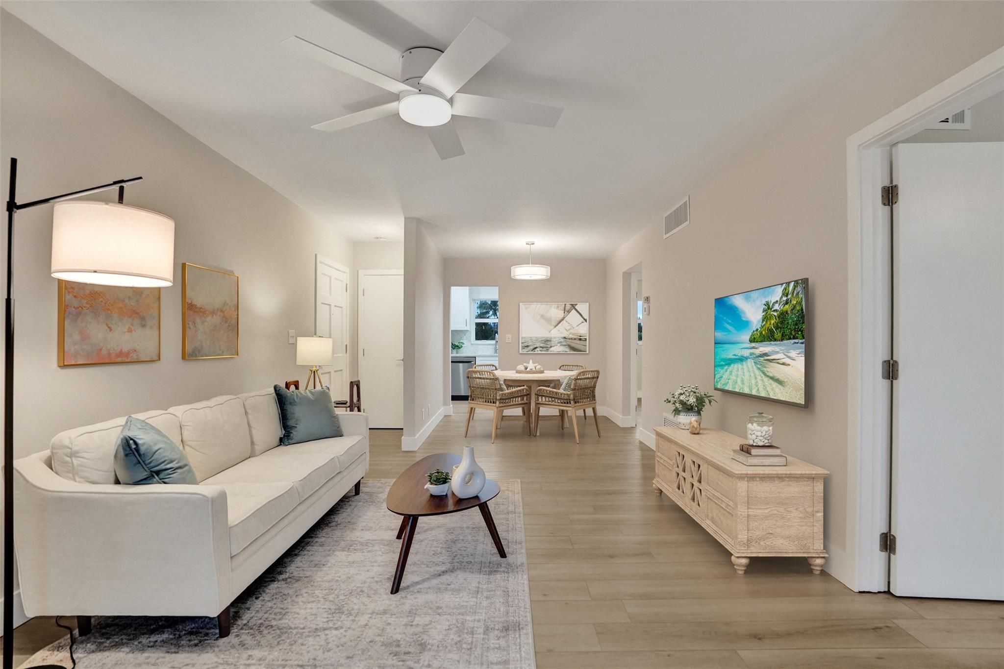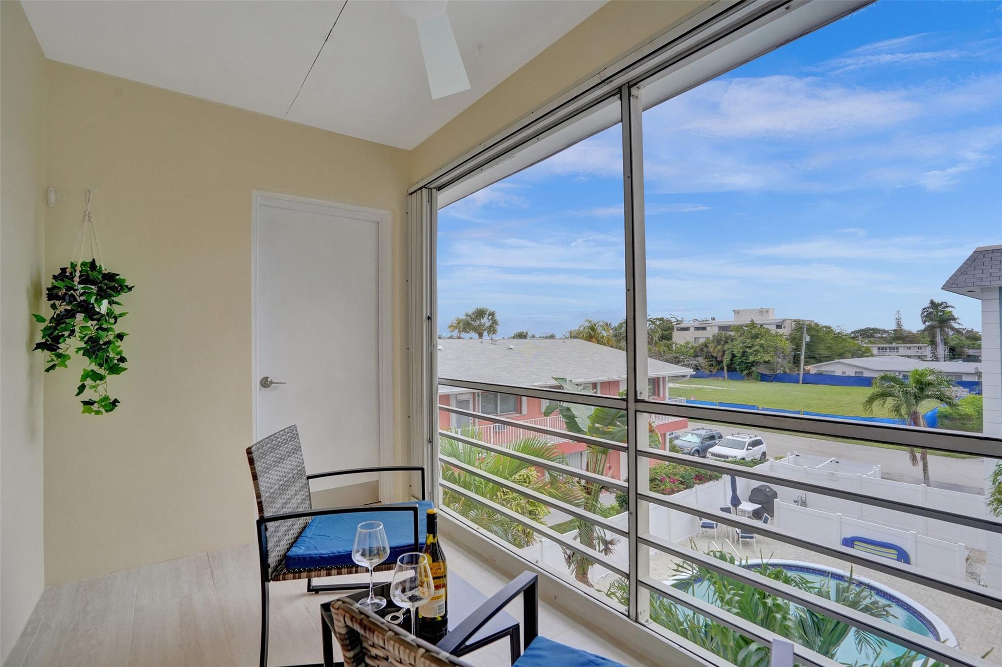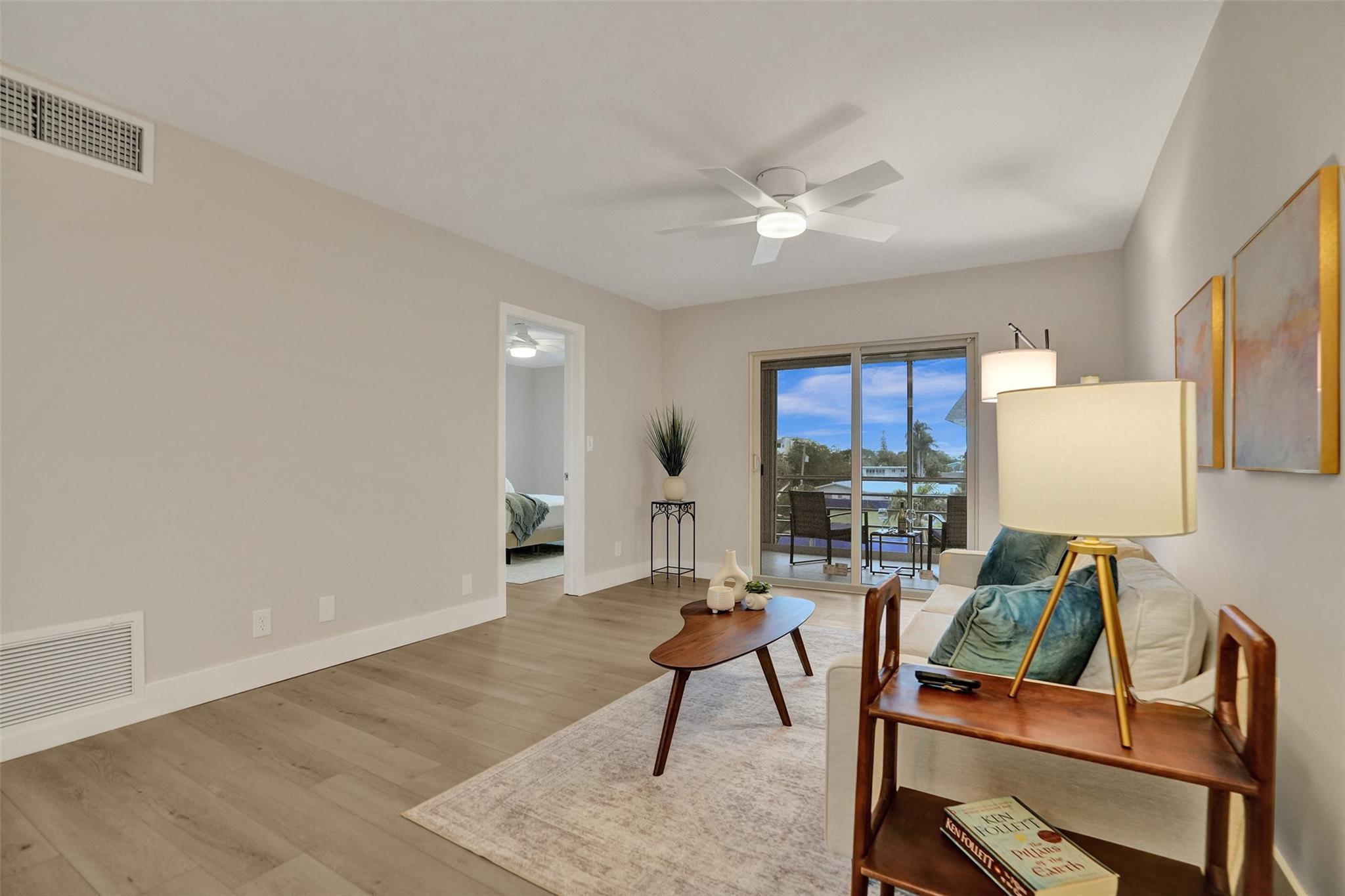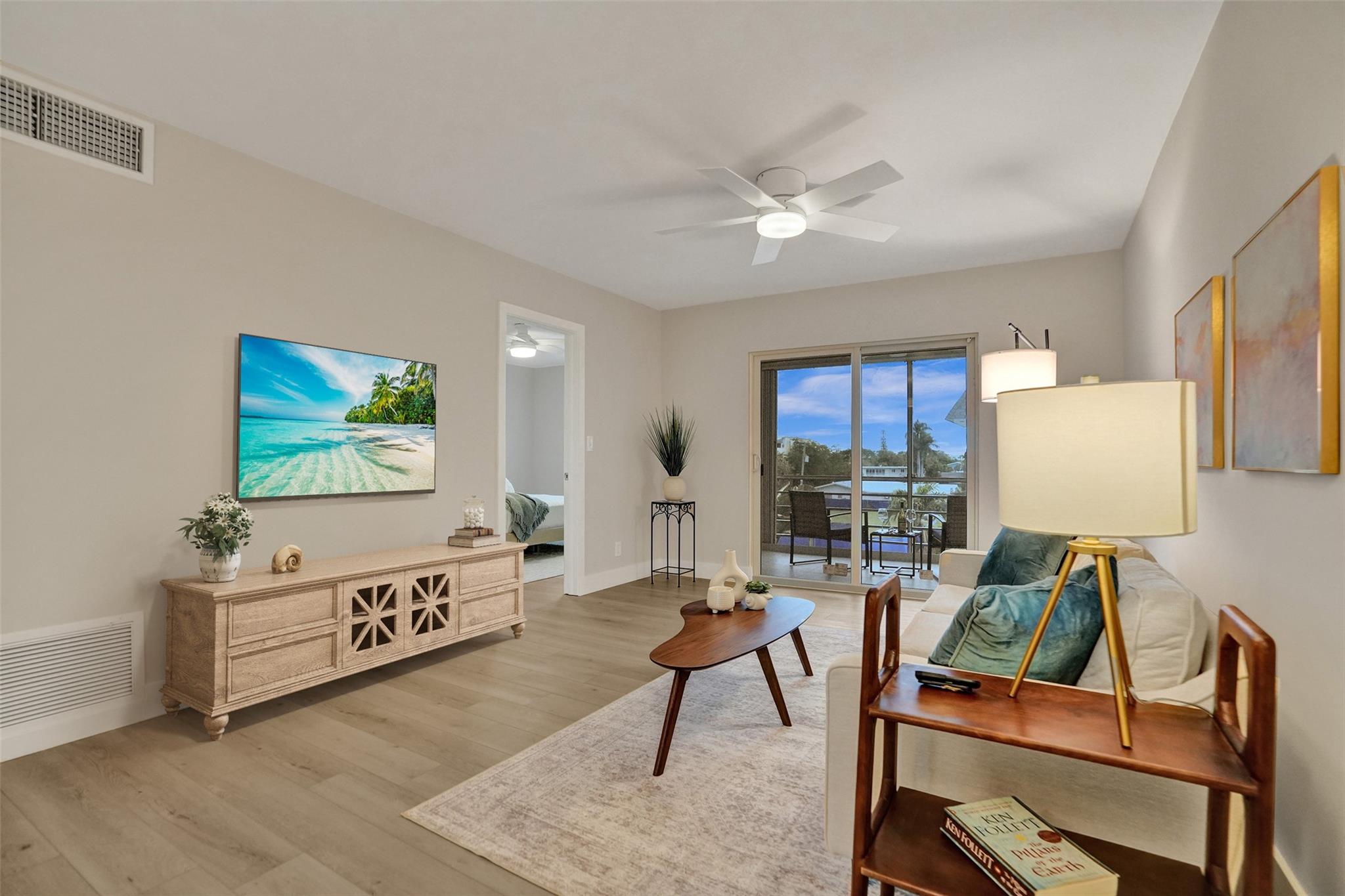 Renovated beach condo in a quiet residential neighborhood. This amazing top floor condo has NO SHARED WALLS except the floor as there is a unit beneath. Brand new renovation w/new impact windows & sliders, kitchen w/new white shaker cabinetry, granite counters/full backsplash, stainless appliances, new flooring in all living areas, kitchen & bedrooms, new light fixtures. Large baseboards throughout really highlight the beautiful paint color. The large primary bedroom has an enormous walk-in-closet. Screened in patio w/new tile floors. It's truly stunning! This condo overlooks the pool & has on-site storage, bike/beach chair room & laundry room. Close to the beach, restaurants, shopping, golf, pickleball, dog park, amphitheatre, playground, & aquatic center! .8 miles to the Fishing Village.
