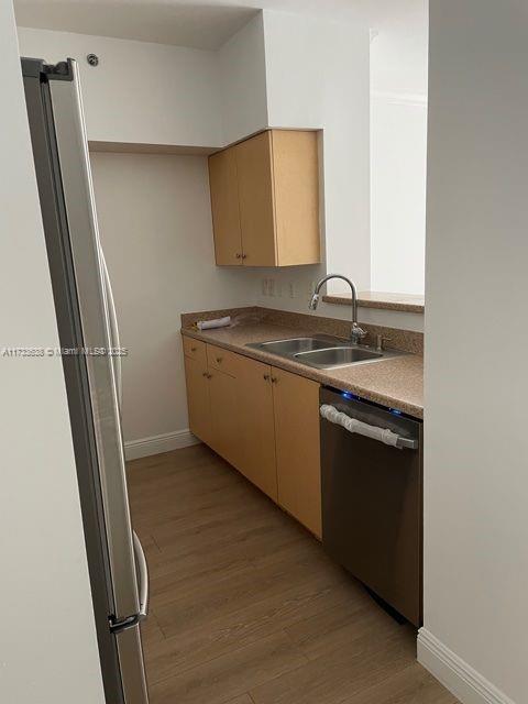Spacious one bedroom one bath unit with beautiful vaulted ceilings in the Montecito Building. Wood floors, bath updated with steel appliances, washer and dryer in unit. The Amenities include heated pool, hot tub, fitness studio, club room with billiards, sauna, grilling area, 24hr front desk. HOA includes water, sewer, trash, 1 DirecTV cable box, fiber optic internet. Insurance. Ideally located on the west side of downtown - easy access to freeways and train station. Walk or bike to The Square, Kravis Center.
