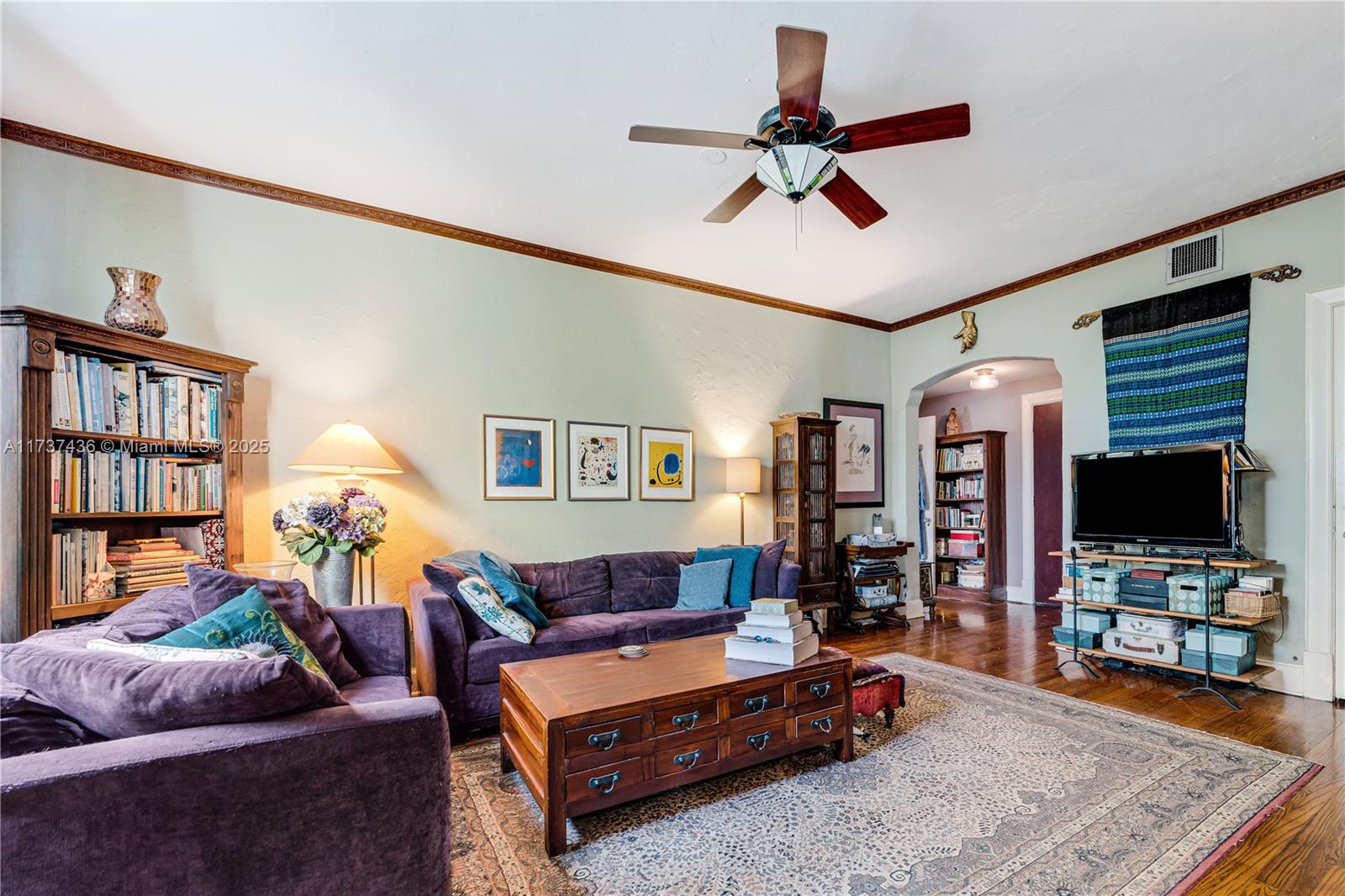 Sunny, spacious top-floor, corner unit in a Mediterranean Revival building. High ceilings and large rooms make this condo stand out among historical buildings. East and North-facing impact windows with lovely views of palms and trees outside. Spa bathroom with Jacuzzi and walk-in shower. Ample closet space. The large dining room can also serve as an office or guest room. Perfect home for creatives, those who like to entertain, or who simply enjoy relaxing in comfort while being close to all that Miami Beach offers. Steps from Lincoln Rd and an easy stroll to the beach. Bike lane and local trolley outside. Easy on-street parking with an annual permit. The building passed its 50-year certification and mandated state inspections with flying colors and is deemed structurally sound