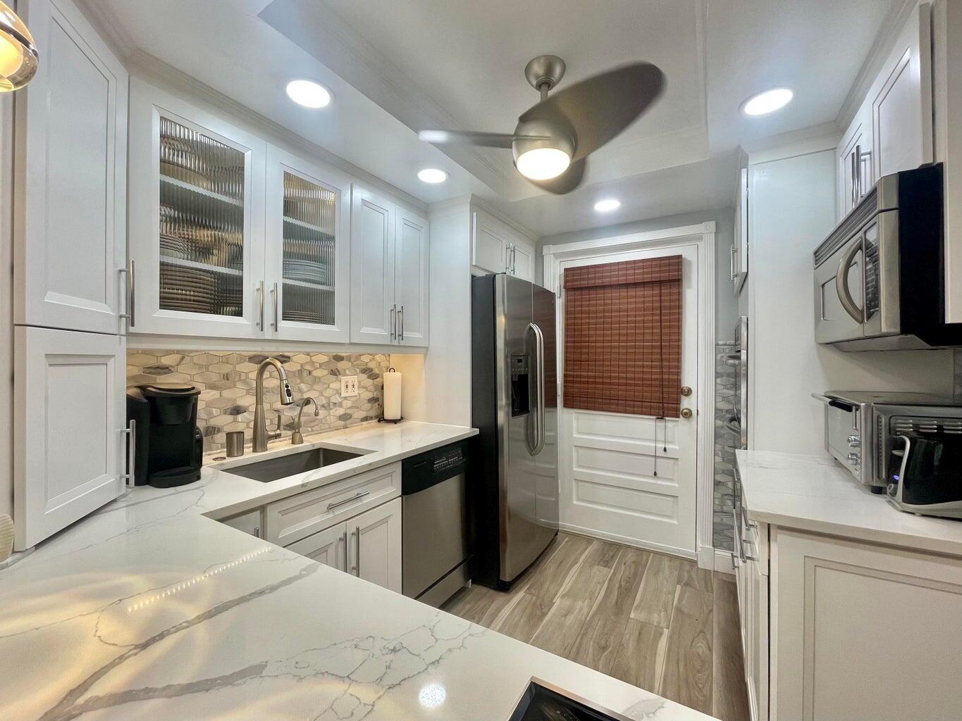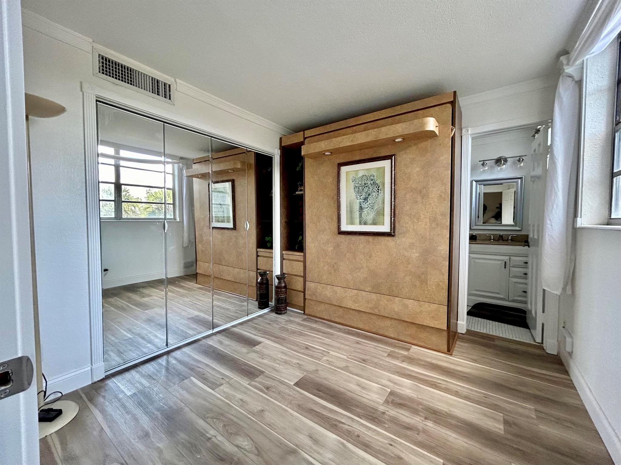 Beautifully remodeled charming condo with 2 Beds and 2 Full Baths. Gorgeous gourmet kitchen fully renovated with white easy-to-clean cabinets, white quartz countertops, and Kitchen Aid Stainless Steel Appliances including a double oven and 2 microwaves. A Wolf Induction electric cooktop is energy efficient at transferring heat and cooking faster, saving electricity. Self-closing kitchen doors and drawers, plenty of storage with two 3-foot pots and pans drawers, and easy slide-out cabinets. The Master Bedroom has a Sleep Number Split King adjustable mattress with dual remote controls allowing independent adjusting of mattress comfort. The custom clothes closets have California Closet Systems. The Queen Murphy Bed makes up the other bedroom when needed with an upgraded mattress for comfort