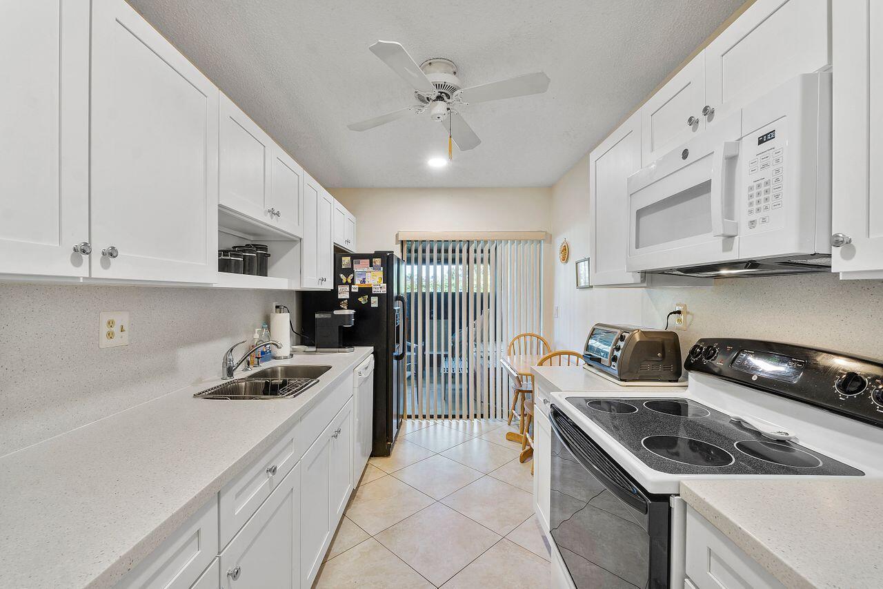 Enjoy easy Florida living in this California style 2 BR 2BA corner villa with WASHER/DRYER situated in High Point of Delray West Sec. 3. Centrally located in Delray Beach, this villa features a front screened patio entrance. The remodeled kitchen has white wood Shaker cabinets with quartzite countertops and a perfect space for a small kitchen table or coffee bar. The living areas have large diagonal tile blending seamlessly with the leveled and enclosed air-conditioned Florida room which also serves as a Family Room. The laundry closet in the hallway features a full size washer/dryer. The walk-in primary closet has pull-down stairs leading to great attic storage. Both bedrooms are carpeted. No current assessments in Section 3
