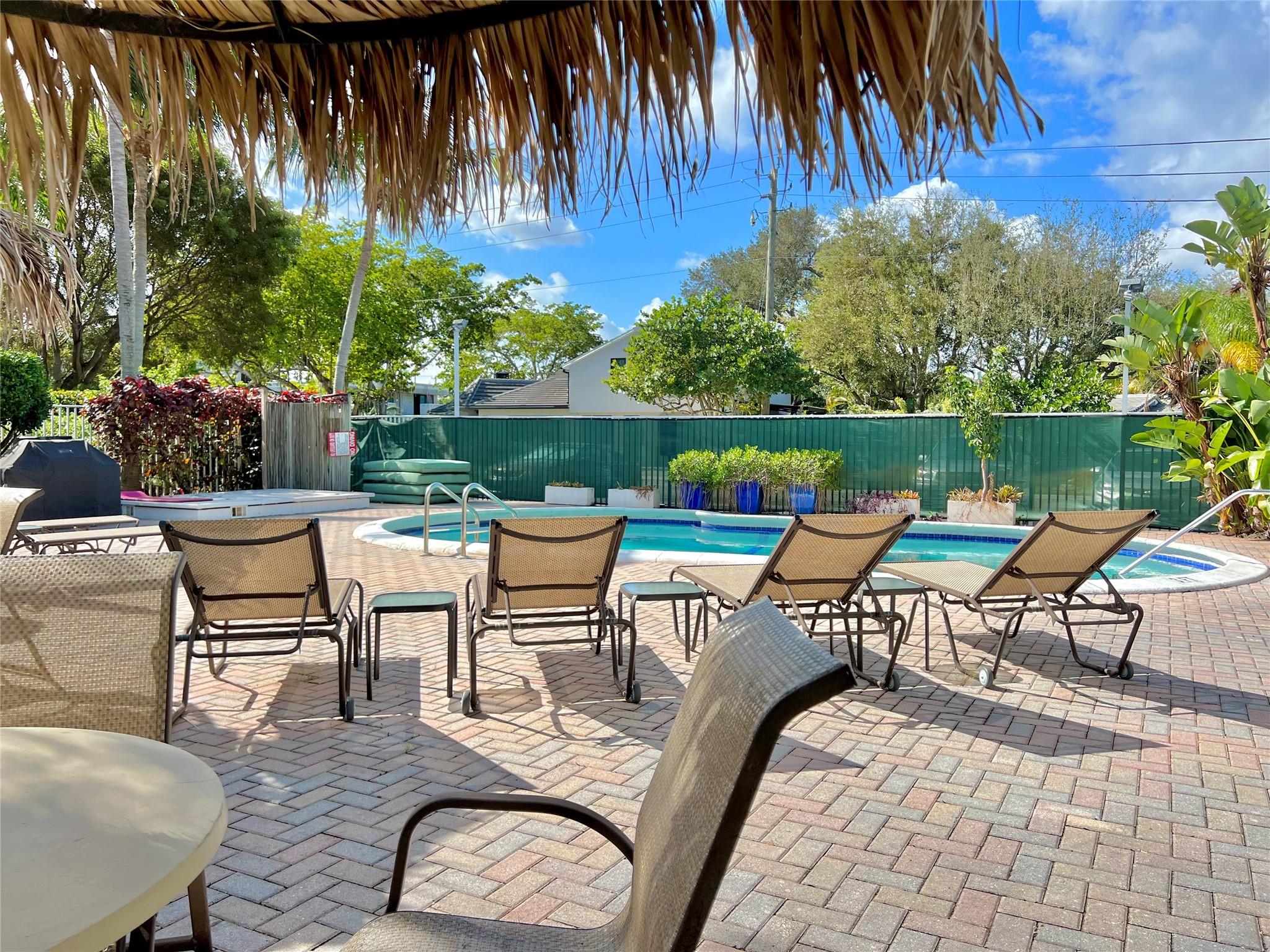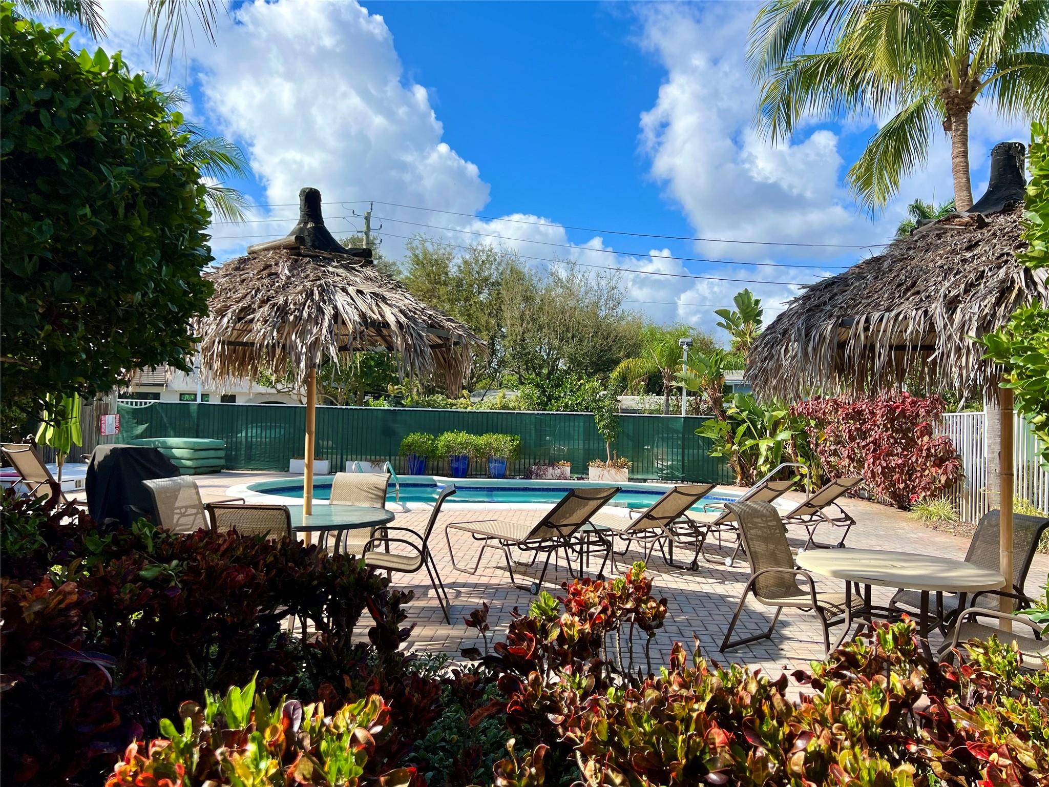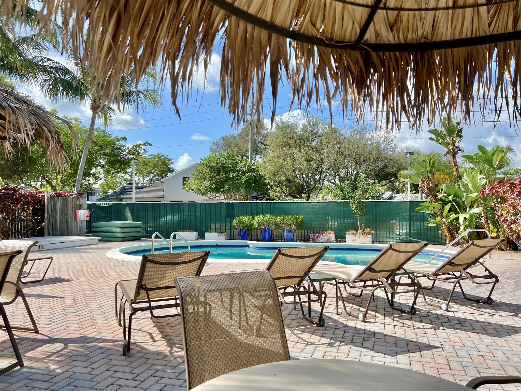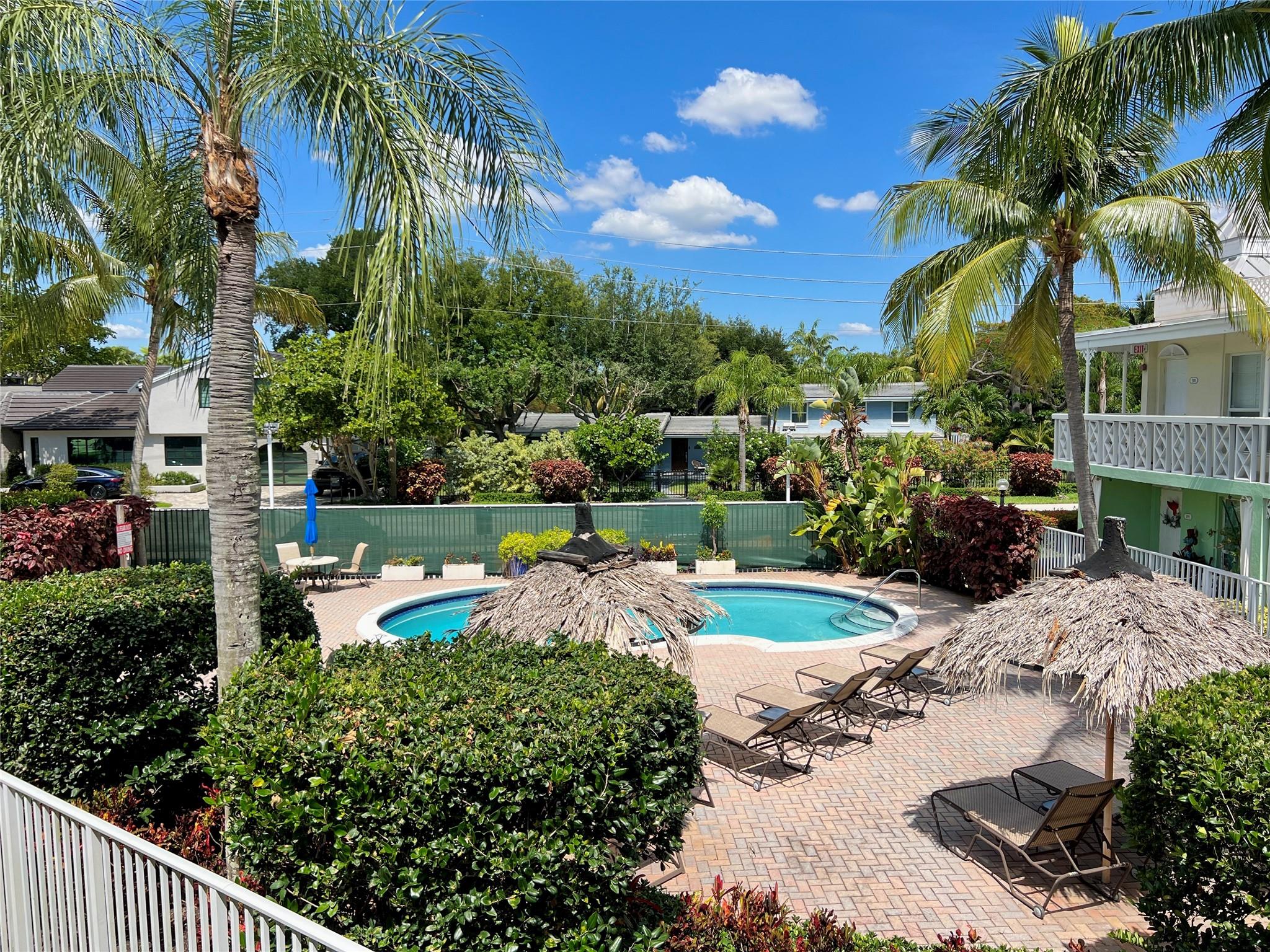 Fantastic opportunity to own a charming one-bedroom, one-bathroom unit in a boutique, Key West-style community, just half a block from the vibrant restaurants, shops, and entertainment on Wilton Drive. This second-floor corner unit features an updated interior with a semi-private patio just outside your door, impact windows and doors, abundant natural light, and a view of the pool area from the living room. With vinyl floors throughout, a heated pool, and BBQ area, the beautifully landscaped and well-maintained grounds make this the perfect place to call home. Pet-friendly (under 20 pounds, with approval), with laundry and additional storage on-site. One assigned parking spot. NO LEASE - 1st 6 months. Tenant occupied until November 1.