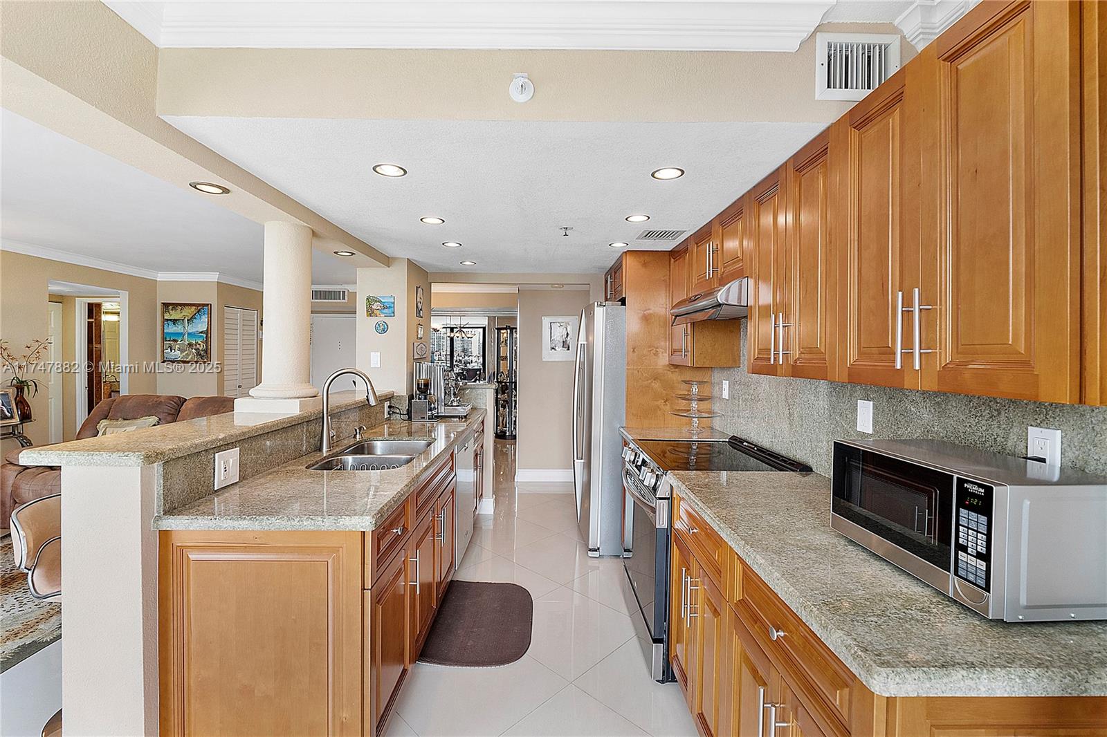 Spacious, tastefully remodeled condo with ocean views in desirable Winston Towers, directly across from Atlantic Ocean, heart of Sunny Isles Beach! Oversized balcony, recently restored, all windows and slider hurricane impact. Unit is immaculate, tastefully designed and decorated (furniture included). Stunning granite kitchen counters, maple wood cabinets, porcelain flooring throughout, beautifully tiled baths (2 primary). Washer/dryer in unit. 24-hour security and concierge. Walk to shops, restaurants, supermarkets, houses of worship. Minutes to Aventura Mall, Bal Harbor, entertainment, airports, seaports, best schools. 40-yr certification done, construction to be completed in pool deck area.