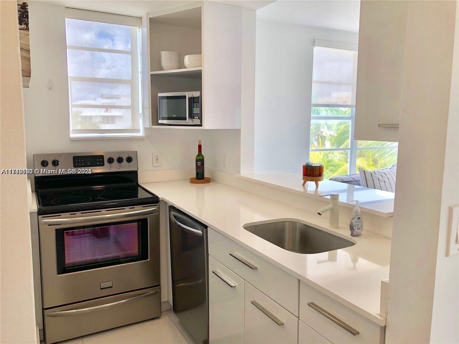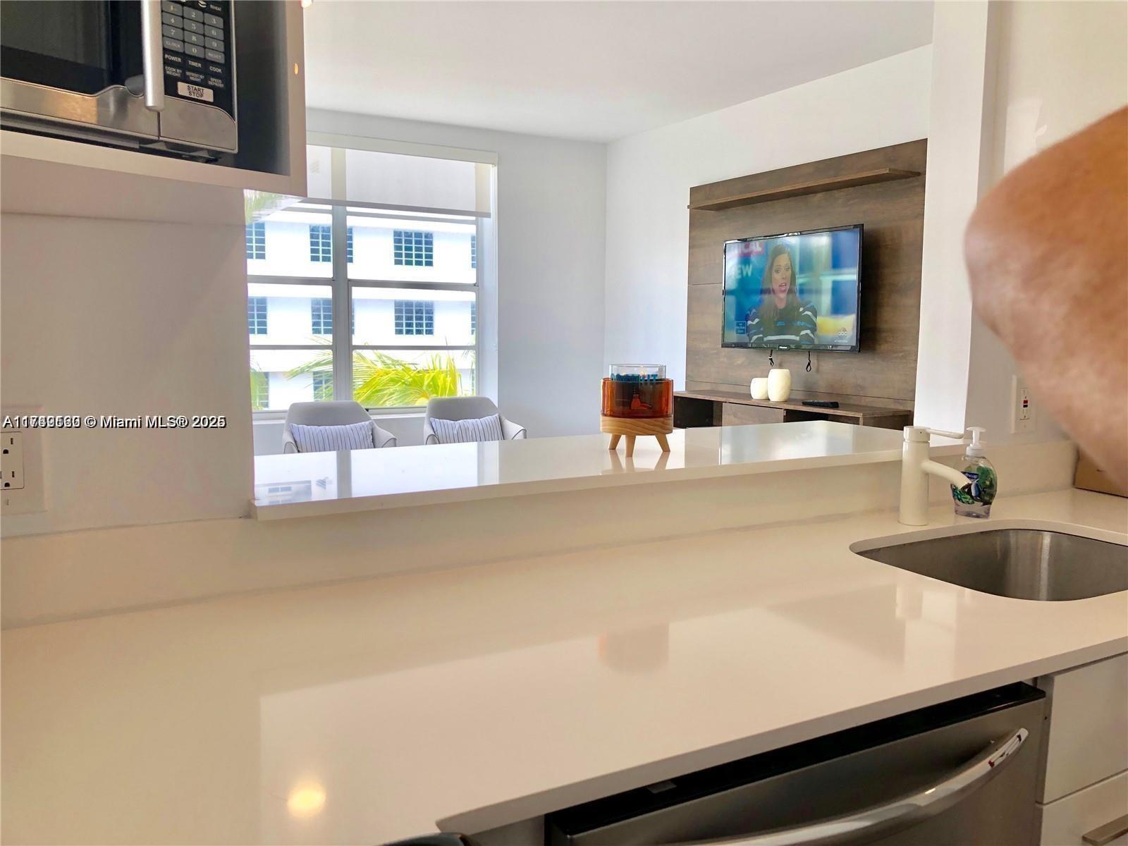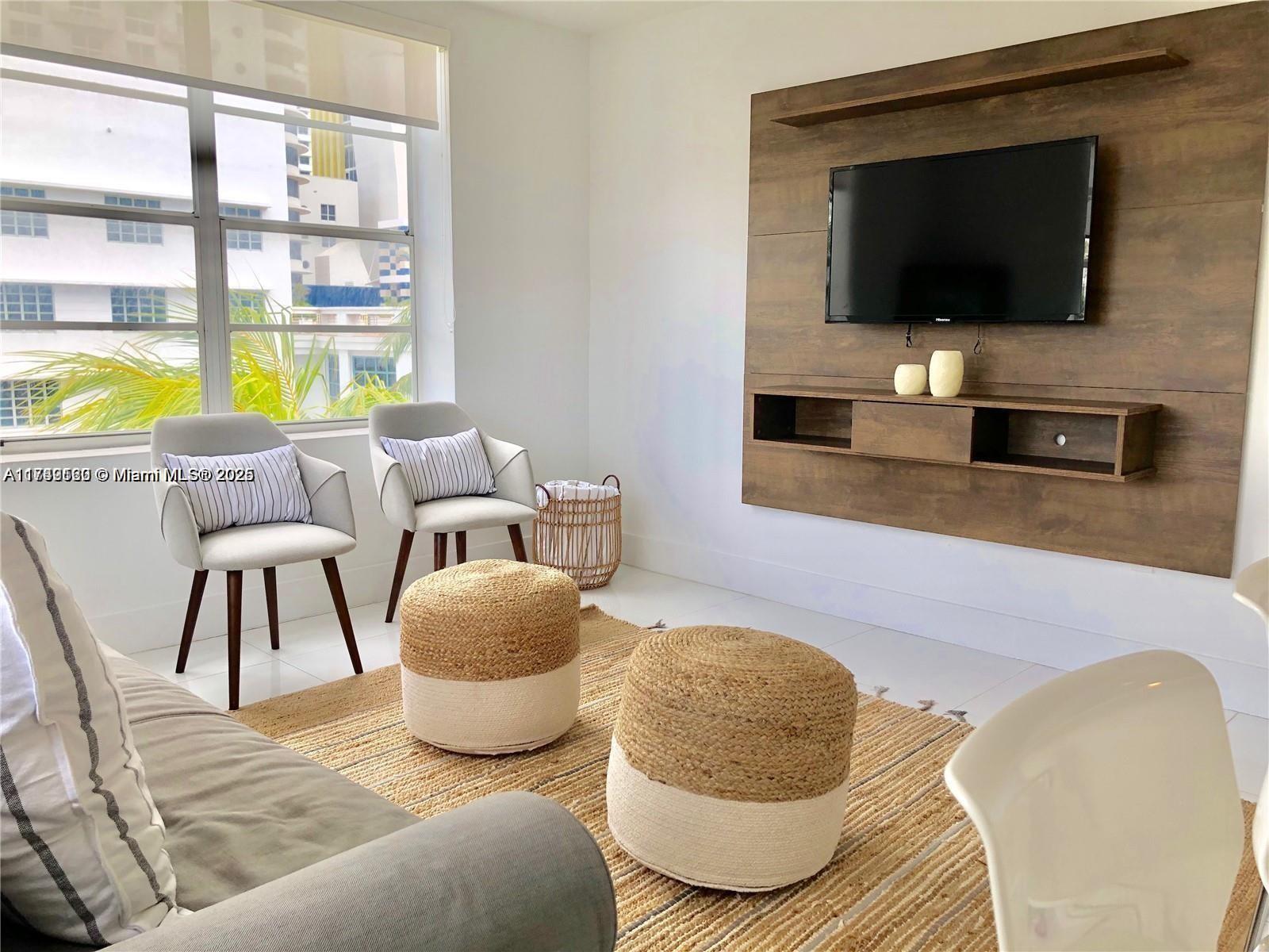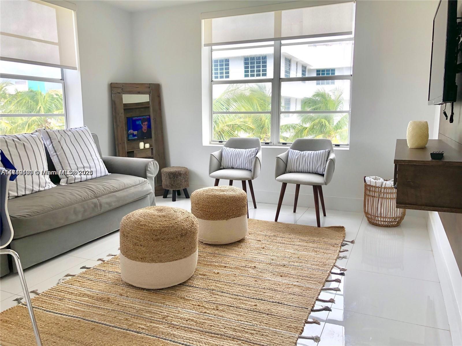South Beach life awaits. The sand is across the street, fine dining, nightlife, Lincoln Road and shopping are steps away. This unit is located on famous Ocean Drive and in a newly renovated beautiful Art Deco boutique building with low maintenance fees. The 1/1 condo is flooded with light, bright, clean, with sleek white porcelain tile throughout, new Hurricane impact windows, kitchen has granite countertops & stainless steel appliances, the unit has a modern, sleek feel. It includes all furniture, 2 TVs. This is the perfect place to call home or pied-a-terre for everything South Beach. The building has a secure FOB entry lobby, laundry facilities on property, and quaint courtyard.