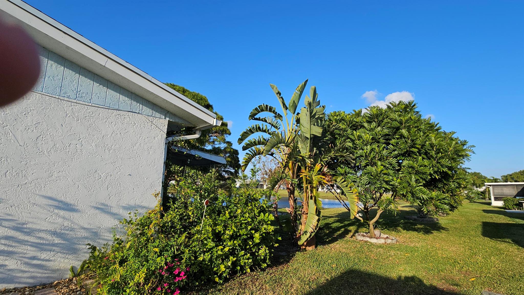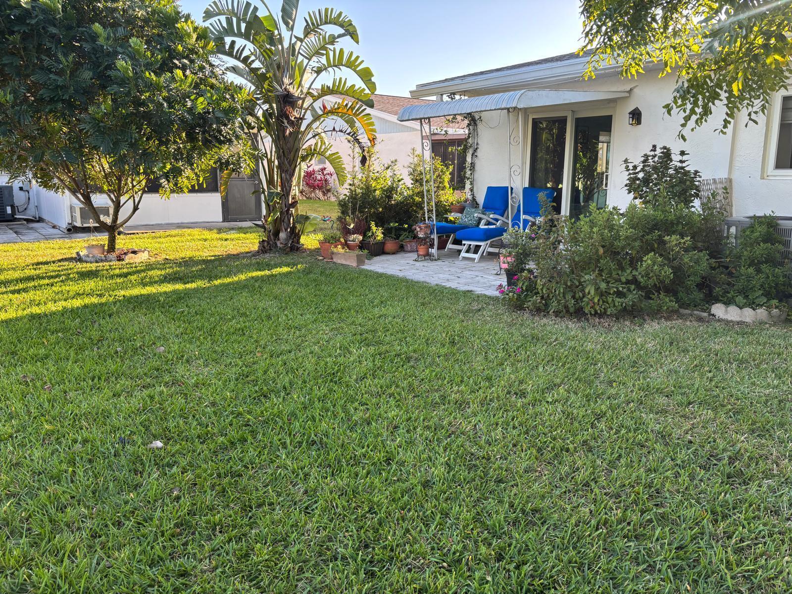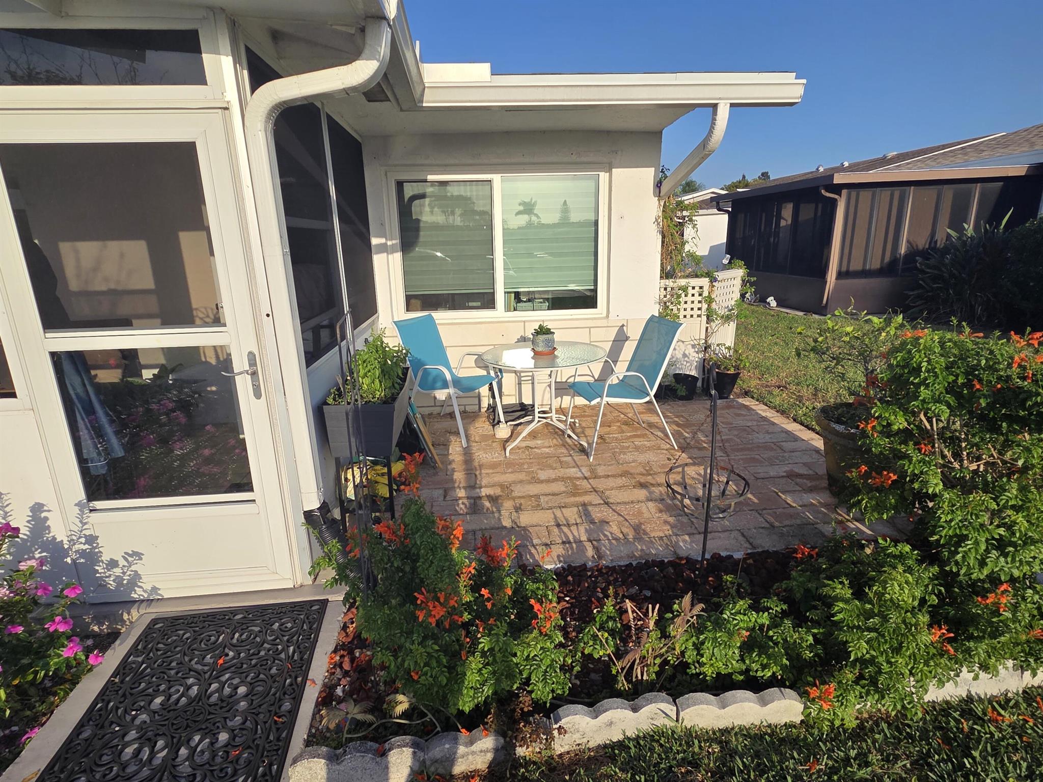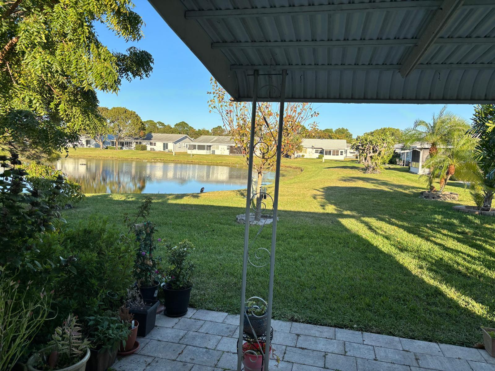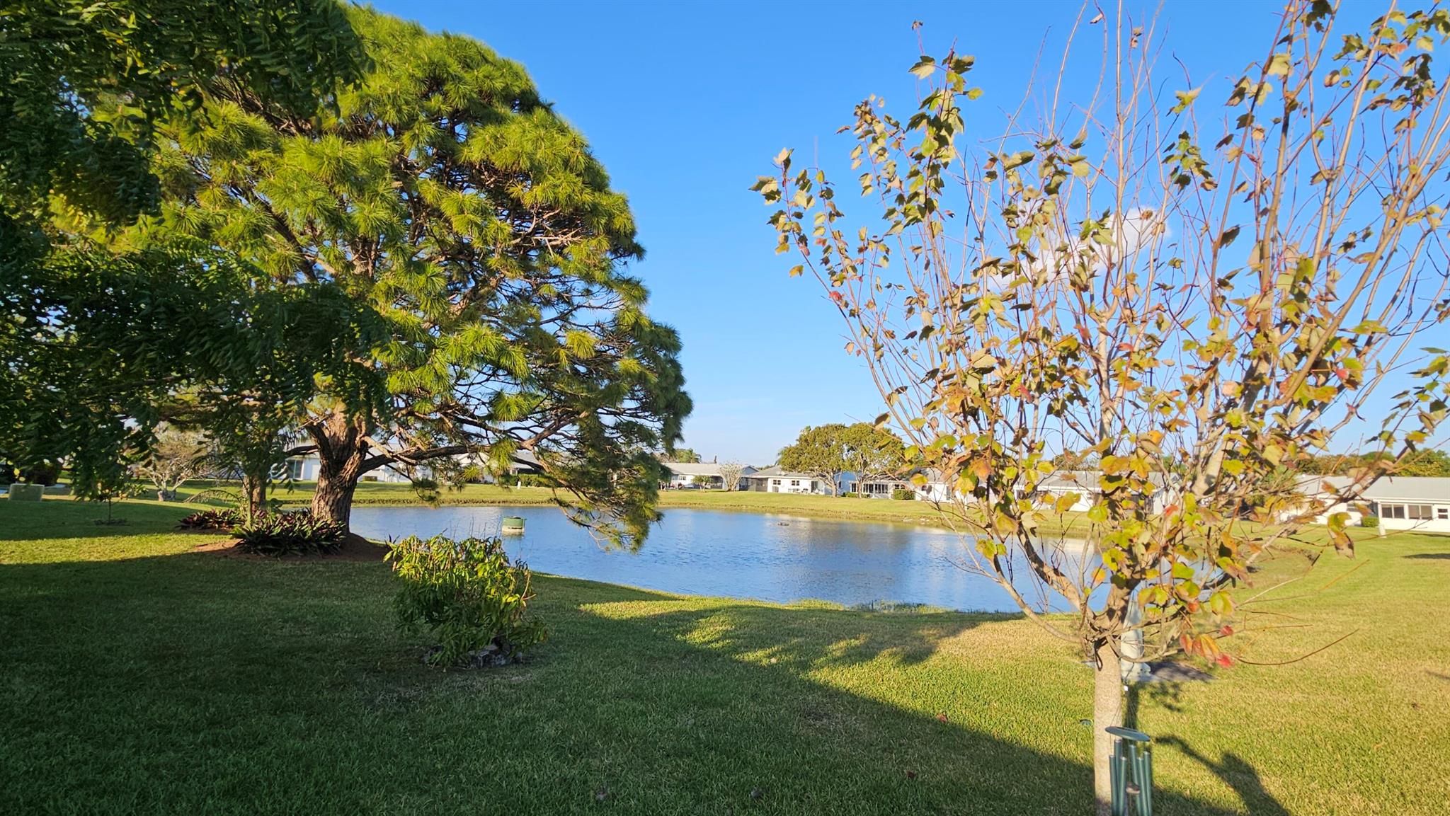 Beautiful well maintained Villa with quiet water view from back yard patio. Updated Kitchen with sliding drawers and skylight. Both baths fully upgraded. New roof and gutters in 2022, impact windows in 2020, with spacious rooms and walk in closets, upgraded base boards, tankless water heater. Cold A/C installed in 2015 and recently updated with new compressor. Exterior of home has French drains plus bonus garden in front of home. Enlarged Front and Rear Patio, Mature native shade trees, New Dishwasher and Dryer and new electrical outlets.All in a peaceful 55 plus community lots of amenities including large heated pool, hot tub, pickle ball, tennis and 18 hole golf course. Minutes from the beach, PBI, theaters and shopping.
