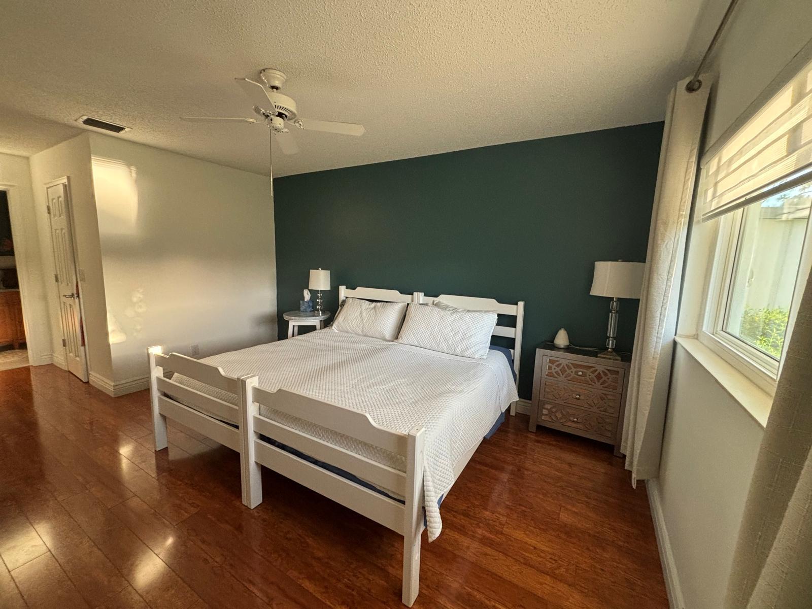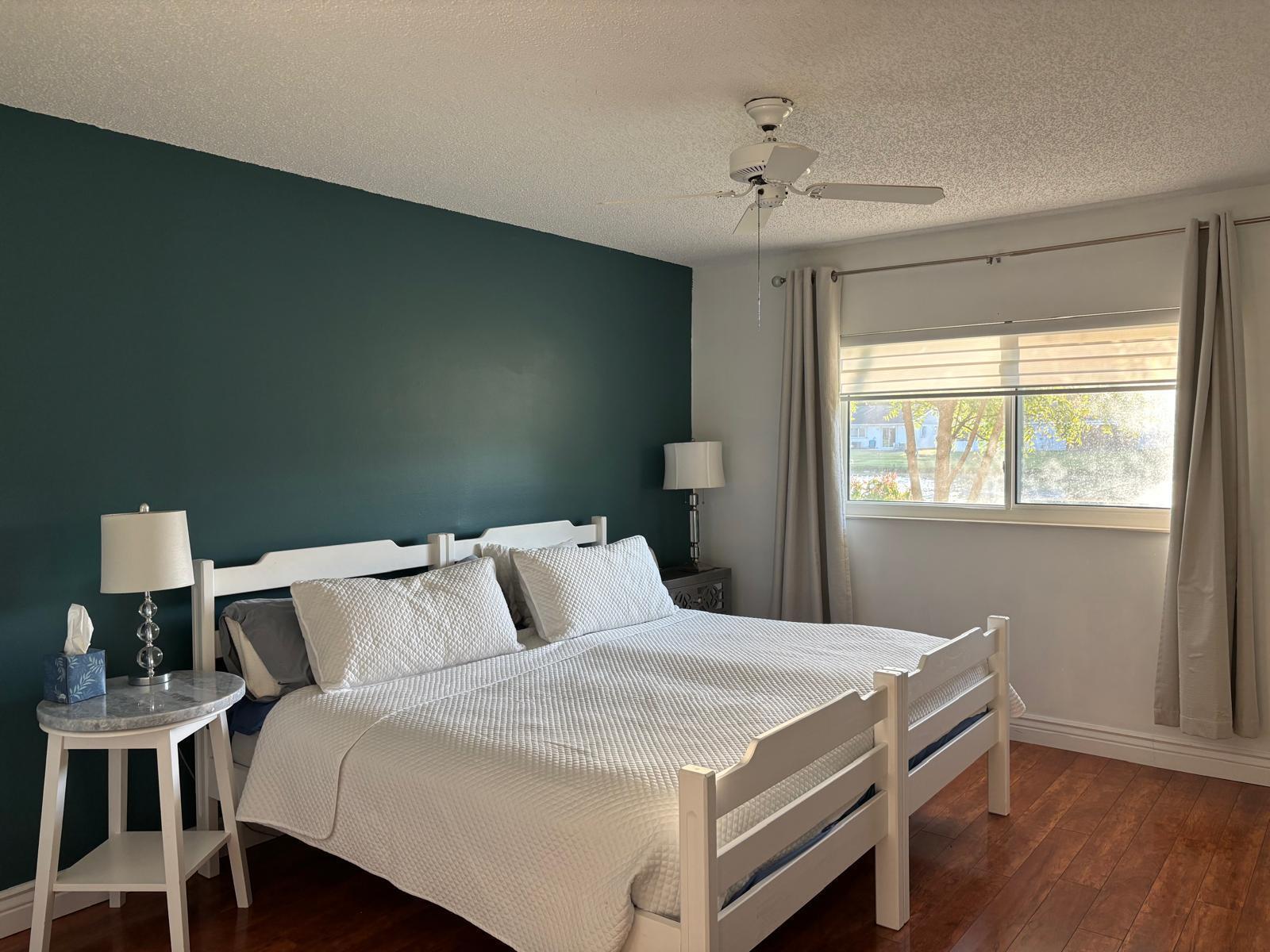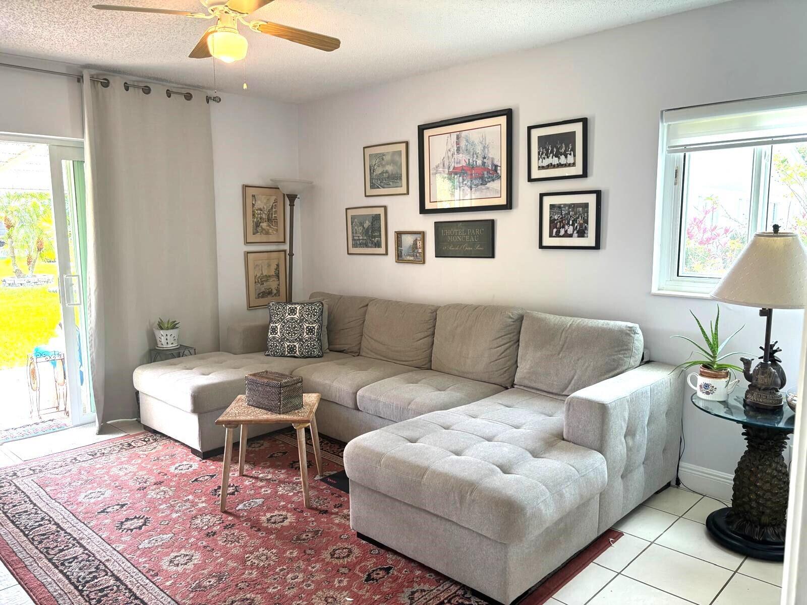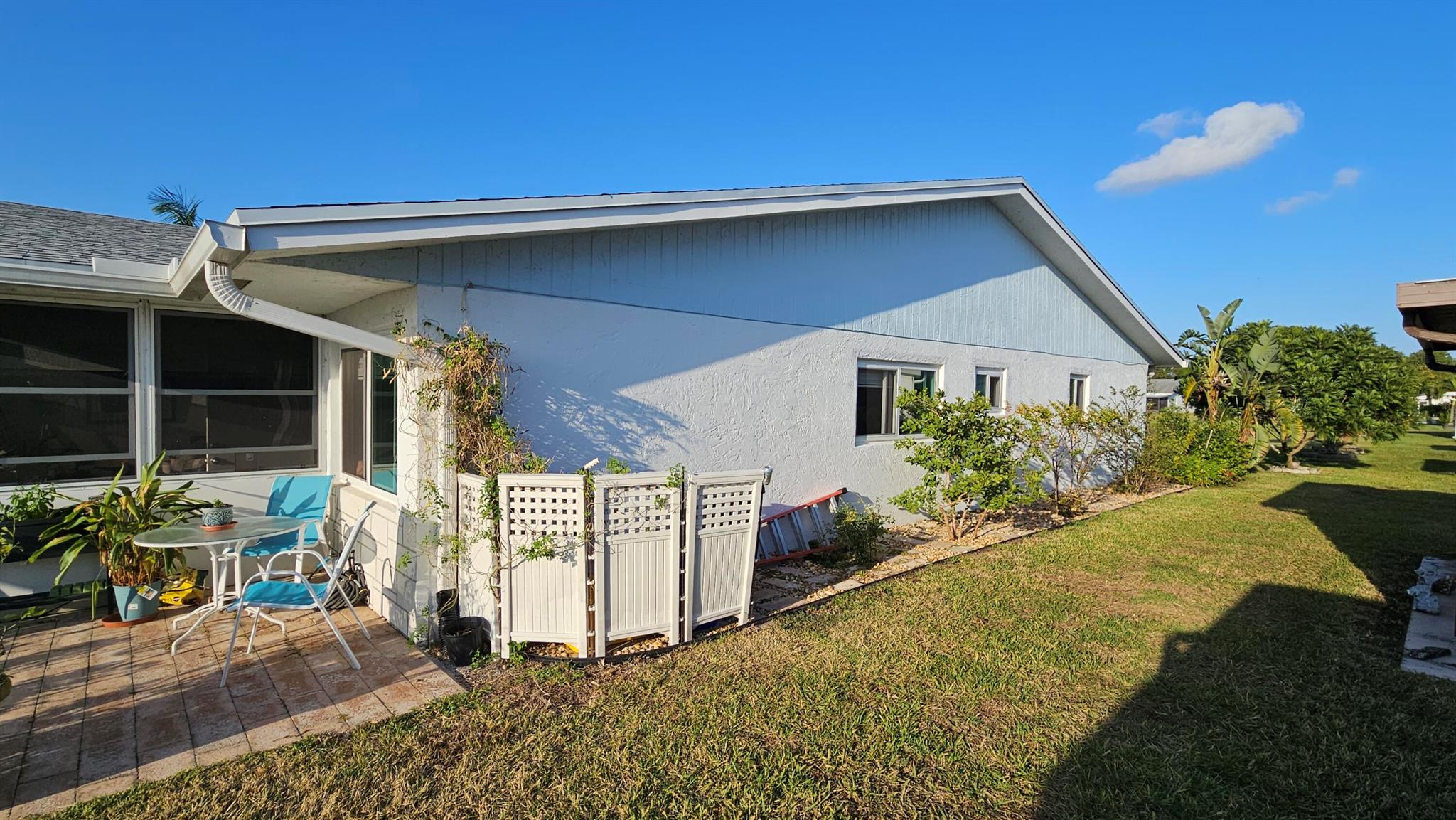 Beautiful well maintained Villa with quiet water view from back yard patio. Updated Kitchen with sliding drawers and skylight. Both baths fully upgraded. New roof and gutters in 2022, impact windows in 2020, with spacious rooms and walk in closets, upgraded base boards, tankless water heater. Cold A/C installed in 2015 and recently updated with new compressor. Exterior of home has French drains plus bonus garden in front of home. Enlarged Front and Rear Patio, Mature native shade trees, New Dishwasher and Dryer and new electrical outlets.All in a peaceful 55 plus community lots of amenities including large heated pool, hot tub, pickle ball, tennis and 18 hole golf course. Minutes from the beach, PBI, theaters and shopping.