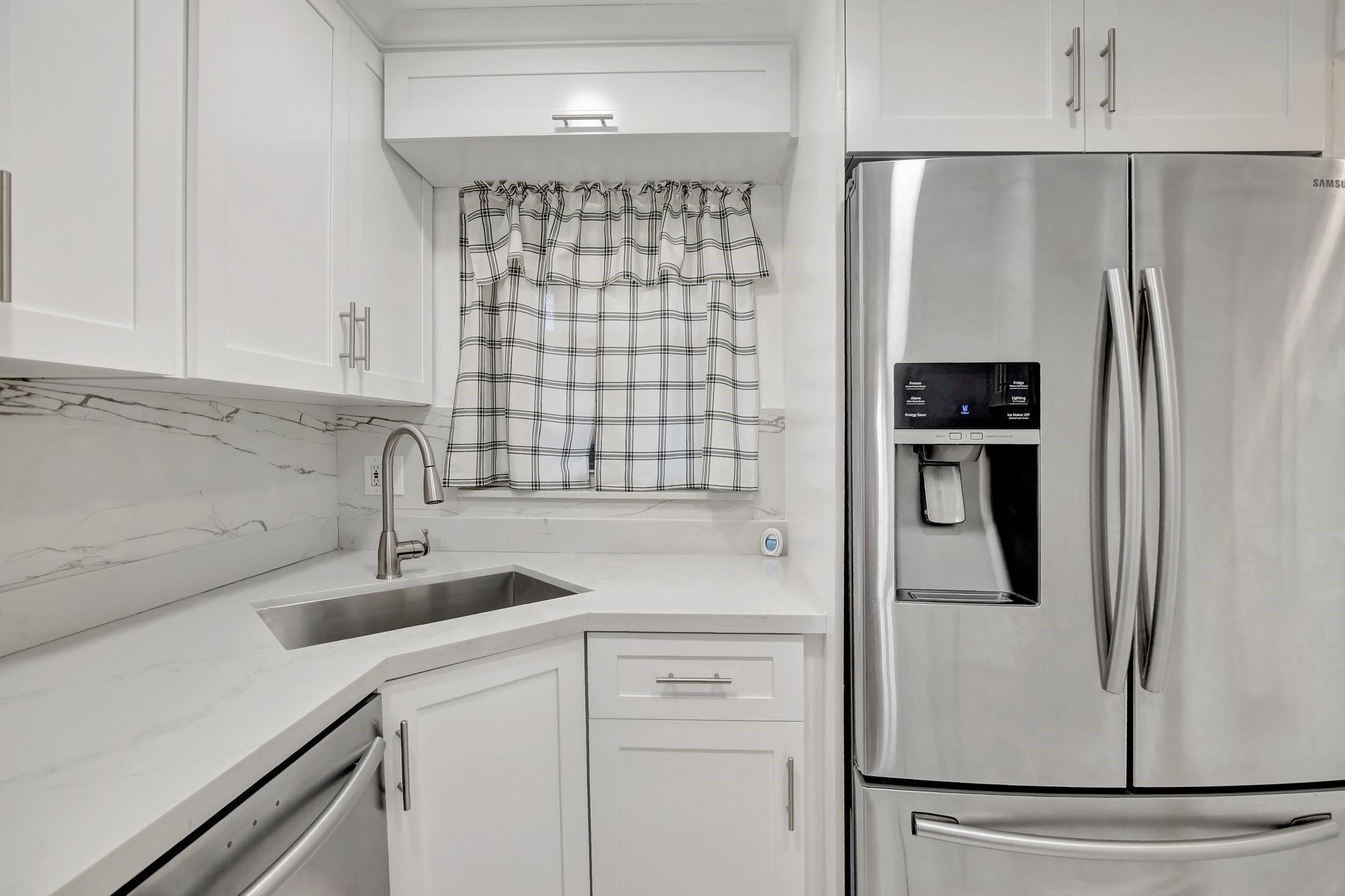 This stunning one bedroom, one bathroom corner unit in the prestigious 55+ community of Sunrise Lakes has been tastefully updated and is ready for immediate move-in. Featuring tile flooring throughout, a custom-built kitchen with sleek quartz countertops and high-end stainless steel appliances, this home perfectly blends style and functionality. The bright, open layout is complemented by modernized bathroom and a serene view of the lake. This home also features new 2024 AC and water heater. Enjoy resort-style amenities, including a clubhouse, courtesy bus, pools, tennis courts, and more. Maintenance conveniently covers cable, water, and trash.