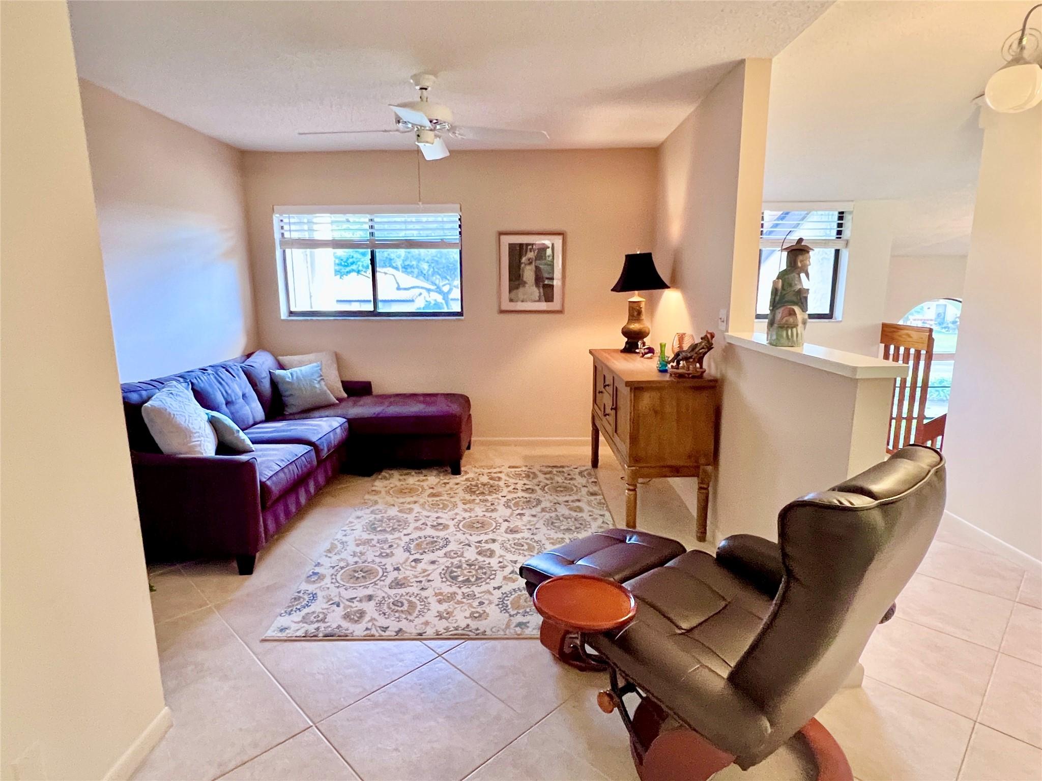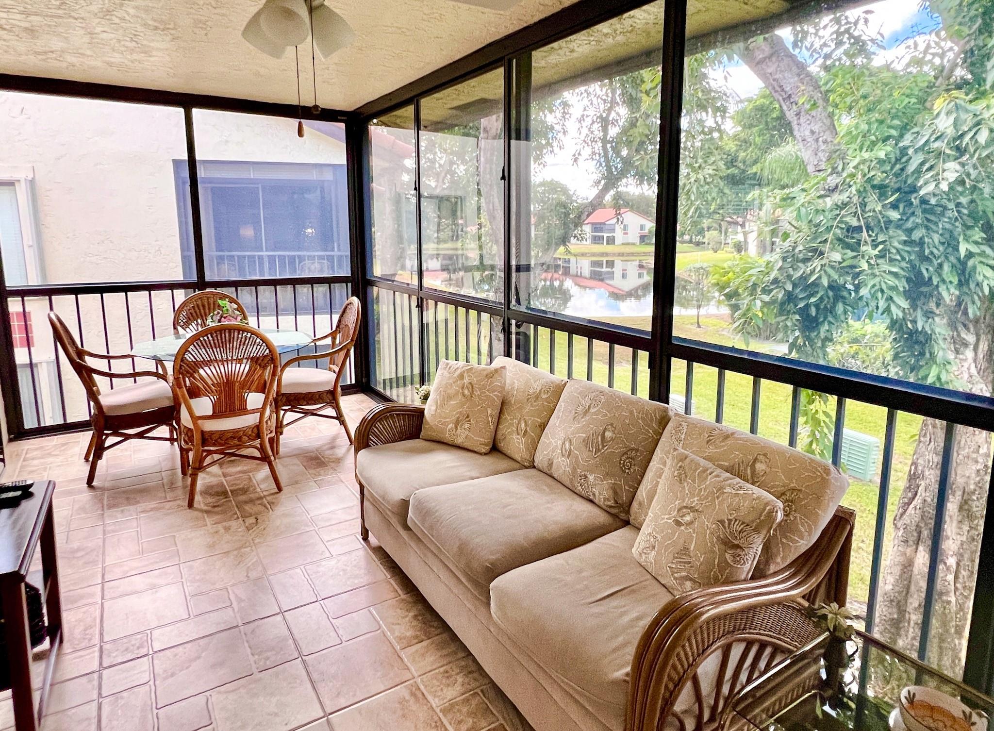 What a Welcoming Condo! 2-Bedroom, 2-Bath plus a Den. Bright & Open Concept with Vaulted Ceilings & many upgrades throughout. Kitchen boasts an abundance of White Cabinetry including Pantry and Stainless Steel Appliances. Master Retreat includes Walk-in Closet & Gorgeous Walk-in Shower. Sliders lead to your Spacious Enclosed Patio with Private Peaceful Views with a perfect peak at the lake. Washer/Dryer inside unit. Palm Chase is a Desirable 55+ Active Community Nestled Behind a Church & Seminary with a quarter-mile Drive to the Gate. Many Activities along with Temperature-Controlled Pool (Heated and Cooled!) Including Billiards, Card Games, Fitness Rooms, Ping Pong, Pickleball, Bocce & Tennis. Maintenance Fee includes Roof Repairs/Replacement, Fiber-optic Cable/Internet, Insurance & More!